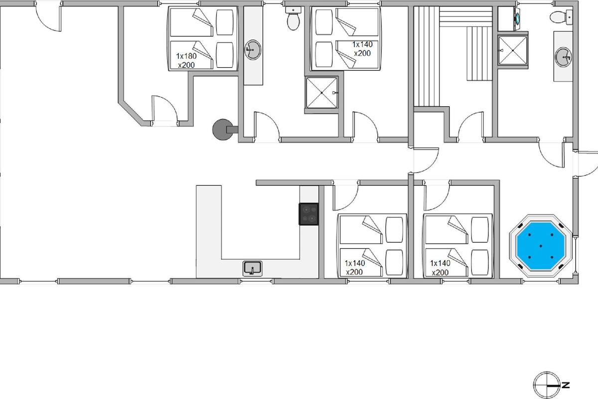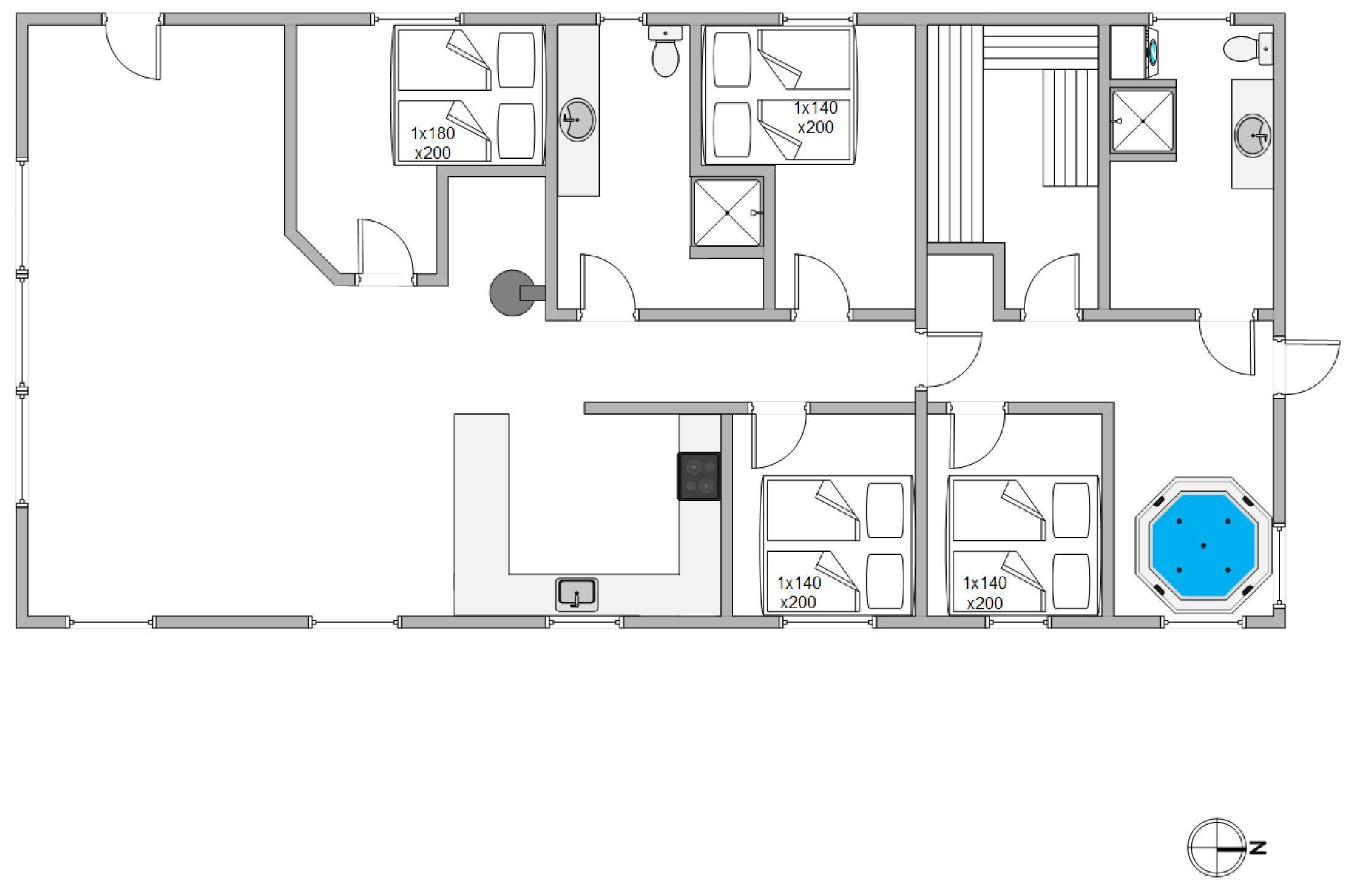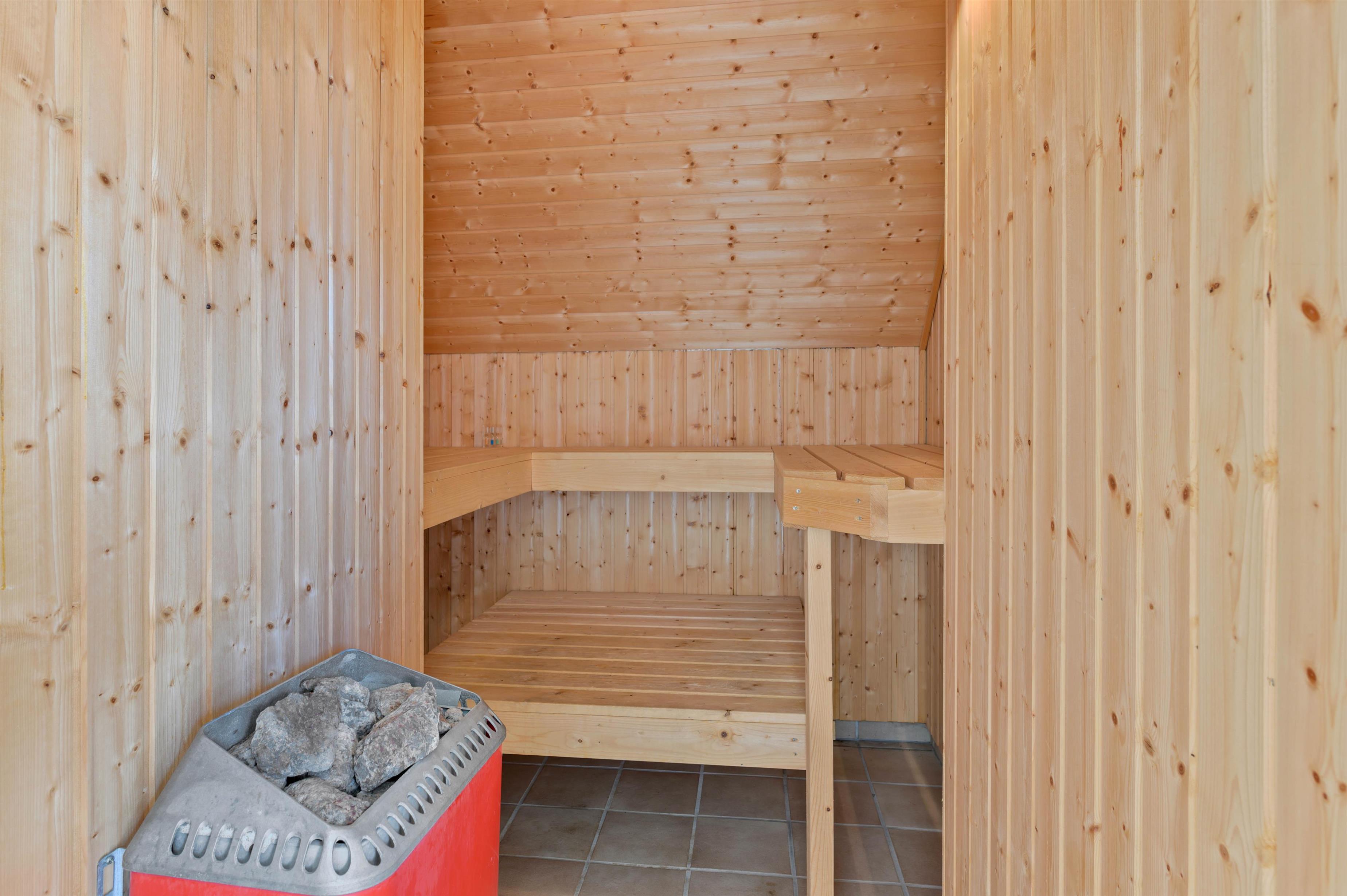 A beautiful timber house awaits you, furnished for comfort throughout. The house features four bedrooms, all with double beds. At one end of the house, you'll find a whirlpool for four people, a sauna, and a bright bathroom. There's also a second bathroom. The living area is comfortably furnished and features an open-plan design incorporating the kitchen and dining area.