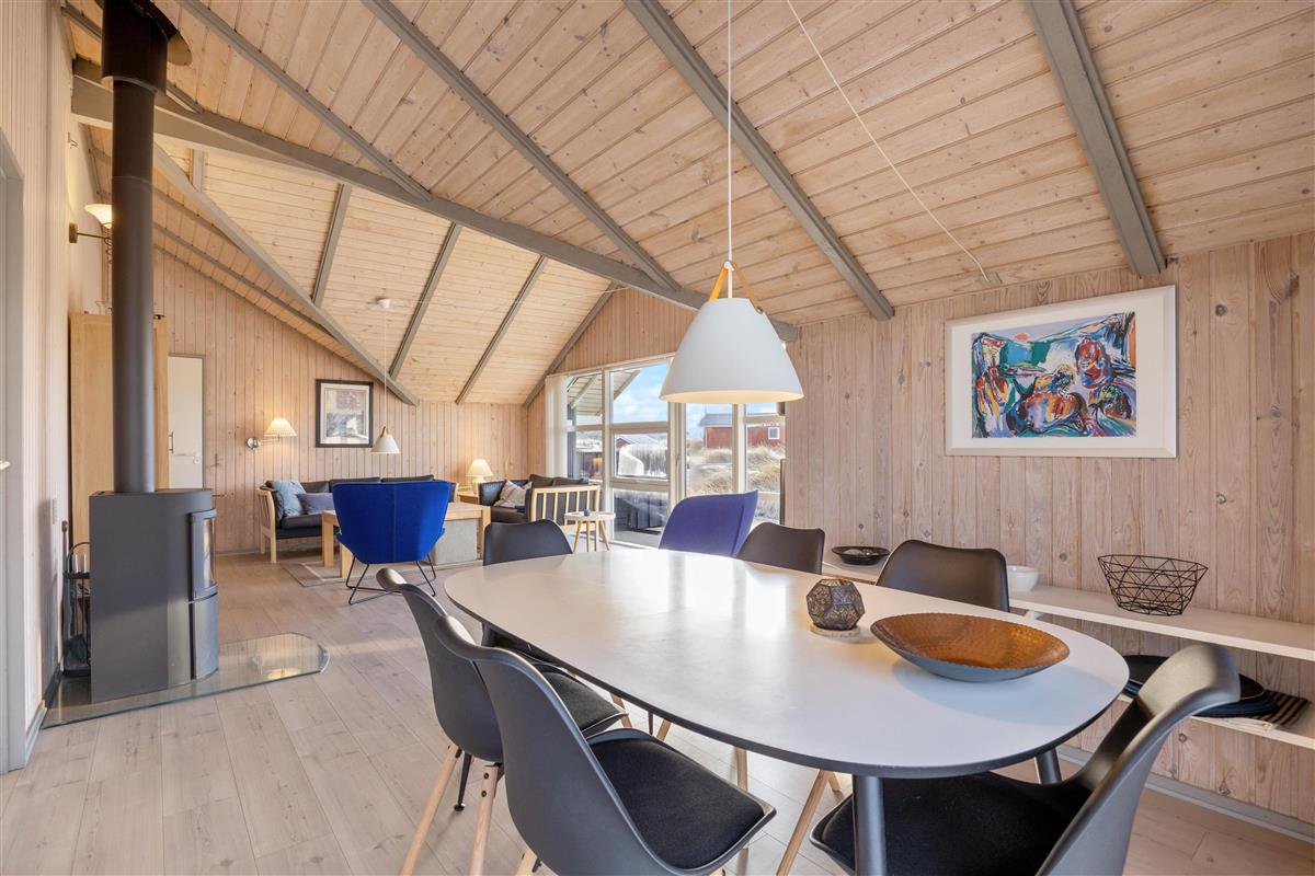 This holiday home in the Houvig dunes presents itself as bright, friendly and inviting. The open-plan layout, typical of Danish design, immediately creates a holiday atmosphere. After cooking together in the well-equipped kitchen, you can enjoy your meals in the open dining area before relaxing in front of the crackling wood-burning stove.