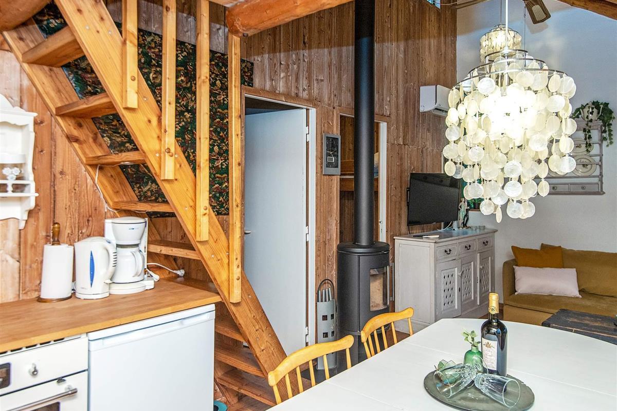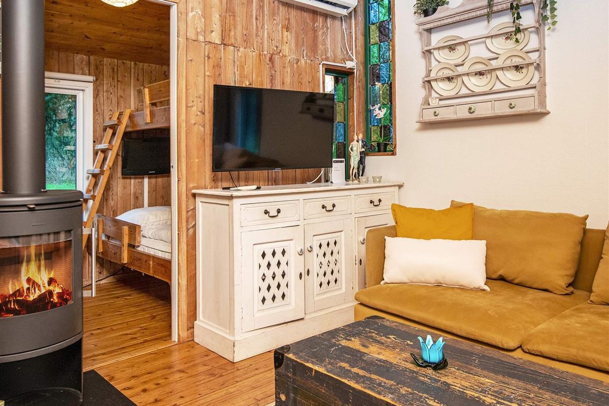 Und: Terrasse, überd. Terrasse, E-Heiz., Solarenergie, Luft-Luft-Wärmepumpe, Gasgrill, Naturgrundst. m. Bäumen 400 m2, gemütliche Möblierung, Ferienhausgebiet, Nichtraucherhaus