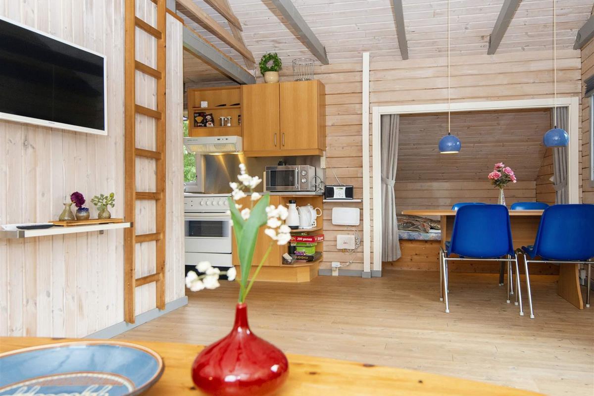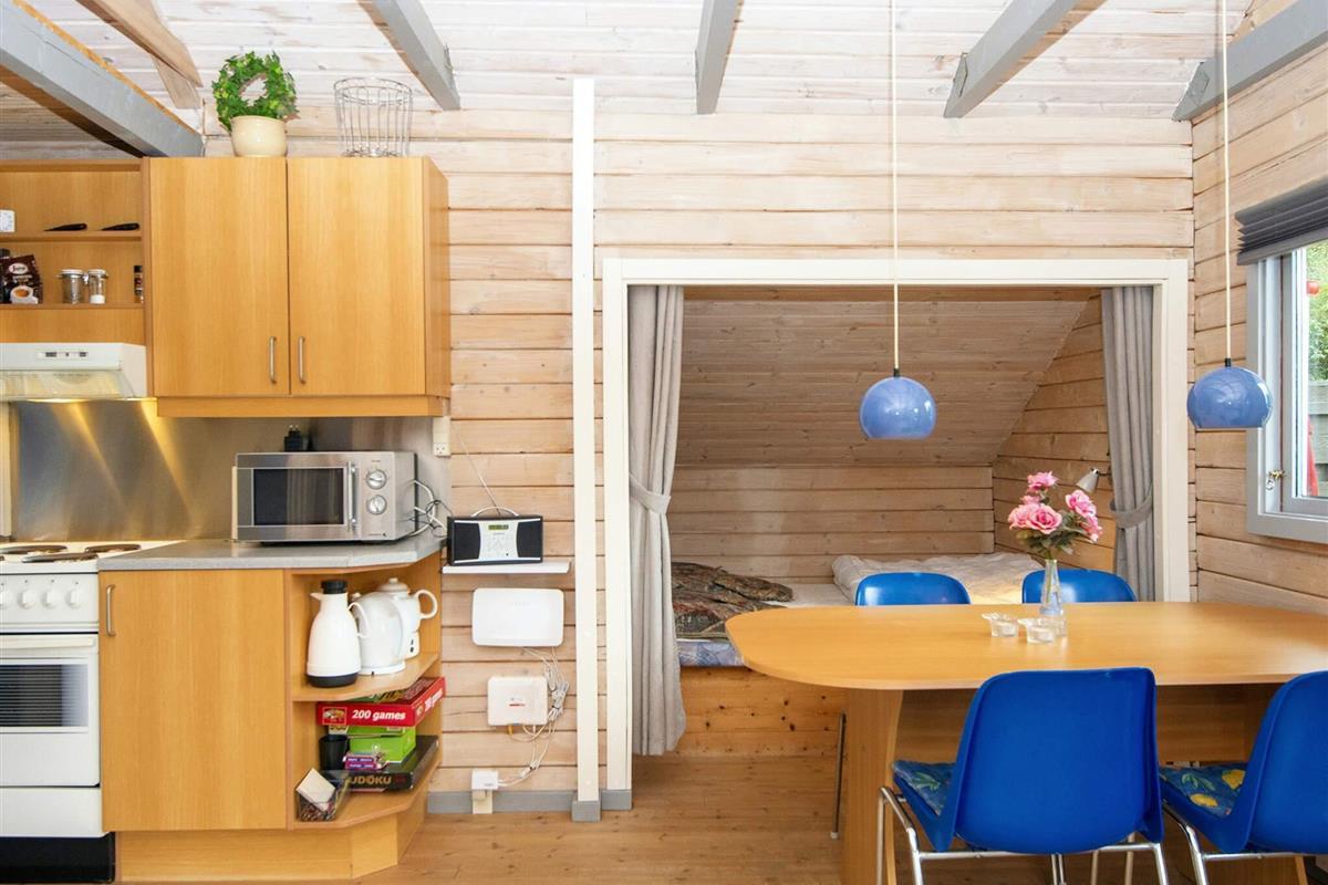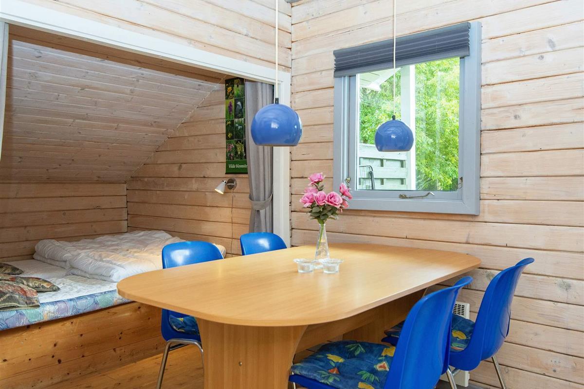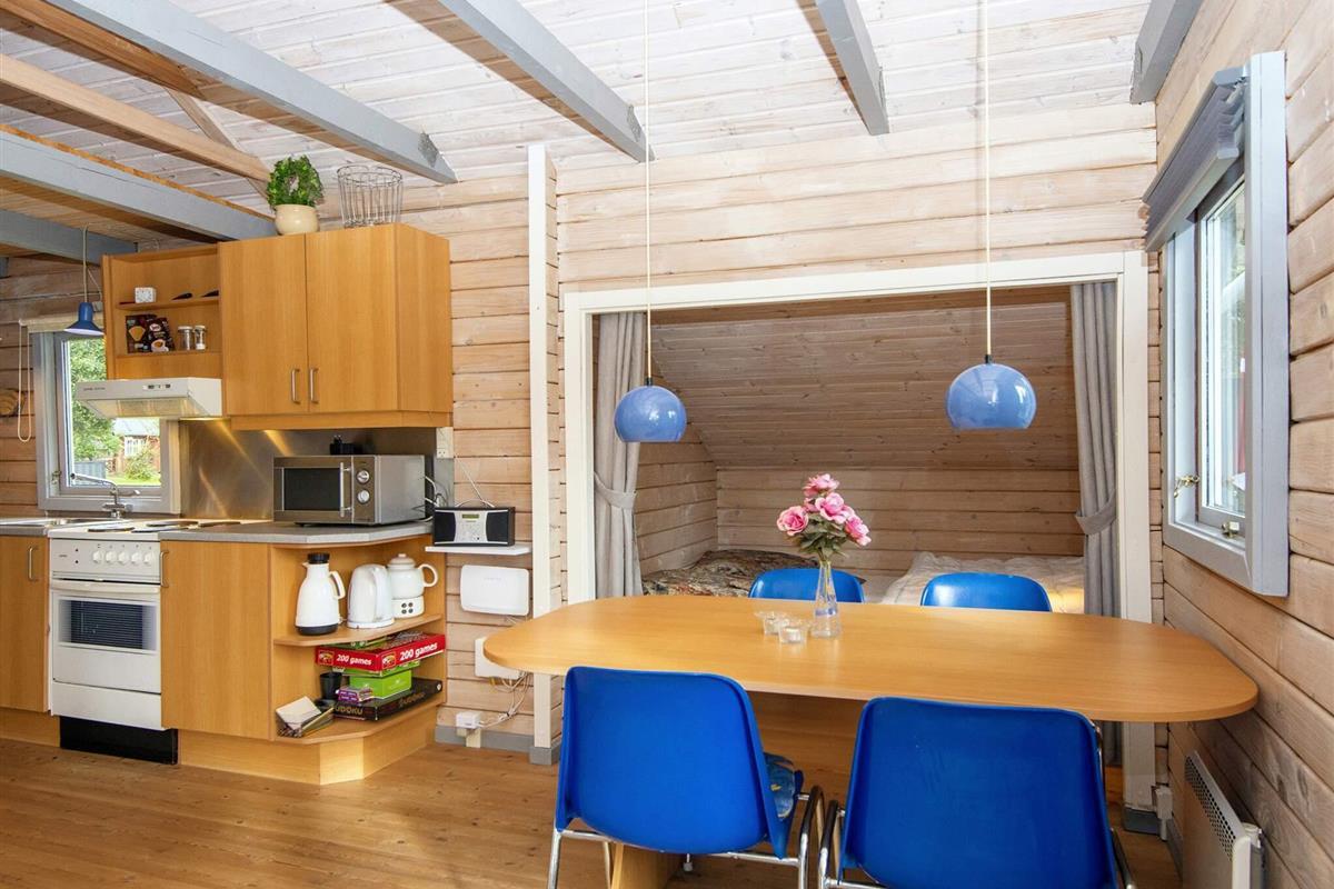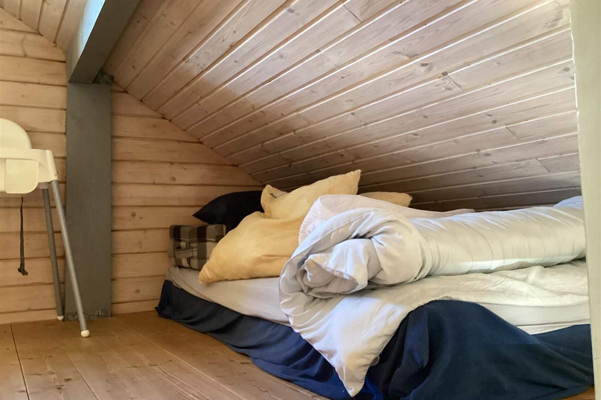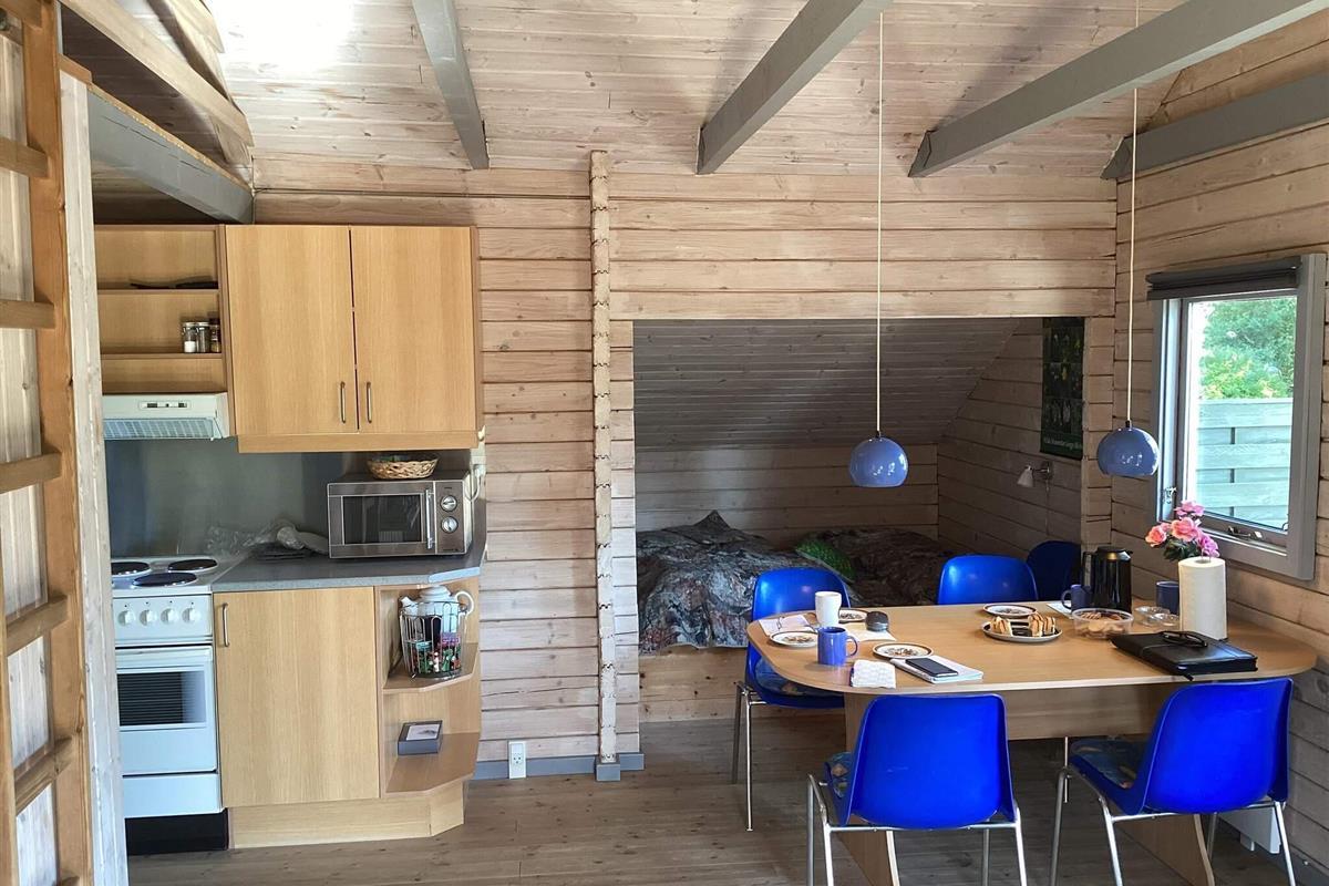 Das Blockhaus bietet einen gemütlichen Wohnbereich mit gut ausgestatteter Küche – ein einladender Ort für Familien. Es verfügt über ein Schlafzimmer mit Doppelbett und eine Schlafnische im Wohnzimmer für zwei Gäste. Der Dachboden/Hems bietet drei weitere Schlafplätze und eignet sich daher ideal für Familien oder kleine Gruppen. Ein gemütlicher Sitz- und Essbereich lädt zum Entspannen, Essen und gemeinsamen Genießen ein.
