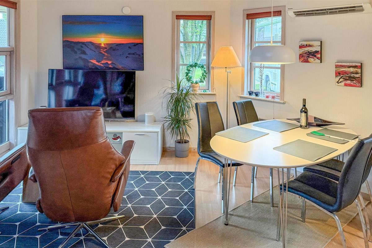 Verheug je op een ontspannen vakantie in dit bijzondere vakantiehuis, dat met zijn afgeronde ontwerp en liefdevolle aandacht voor detail zorgt voor een unieke vakantie-ervaring. Geniet van het lichte, goed doordachte ruimteconcept. De open keuken is praktisch uitgerust, terwijl de woon- en eetkamer indruk maakt met comfortabele fauteuils, een tv en grote ramen die veel licht binnenlaten. Gezellig 's avonds met een glas wijn of begin de dag met een ontbijt aan de ronde eettafel.