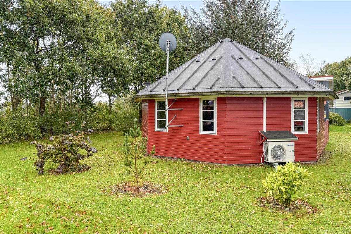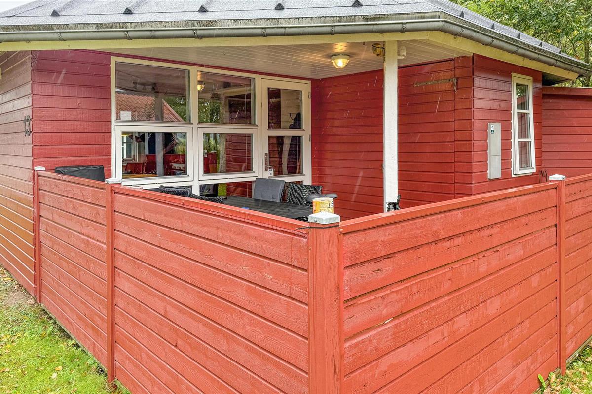 Breng rustige uurtjes door op het overdekte terras, dat wordt beschermd tegen de wind door houten lambrisering. Geniet van je maaltijden buiten of ontspan met een boek en vogelgezang. Het huis ligt op een goed onderhouden natuurgrondstuk met een gazon en bomen, die voor privacy en veiligheid zorgen.