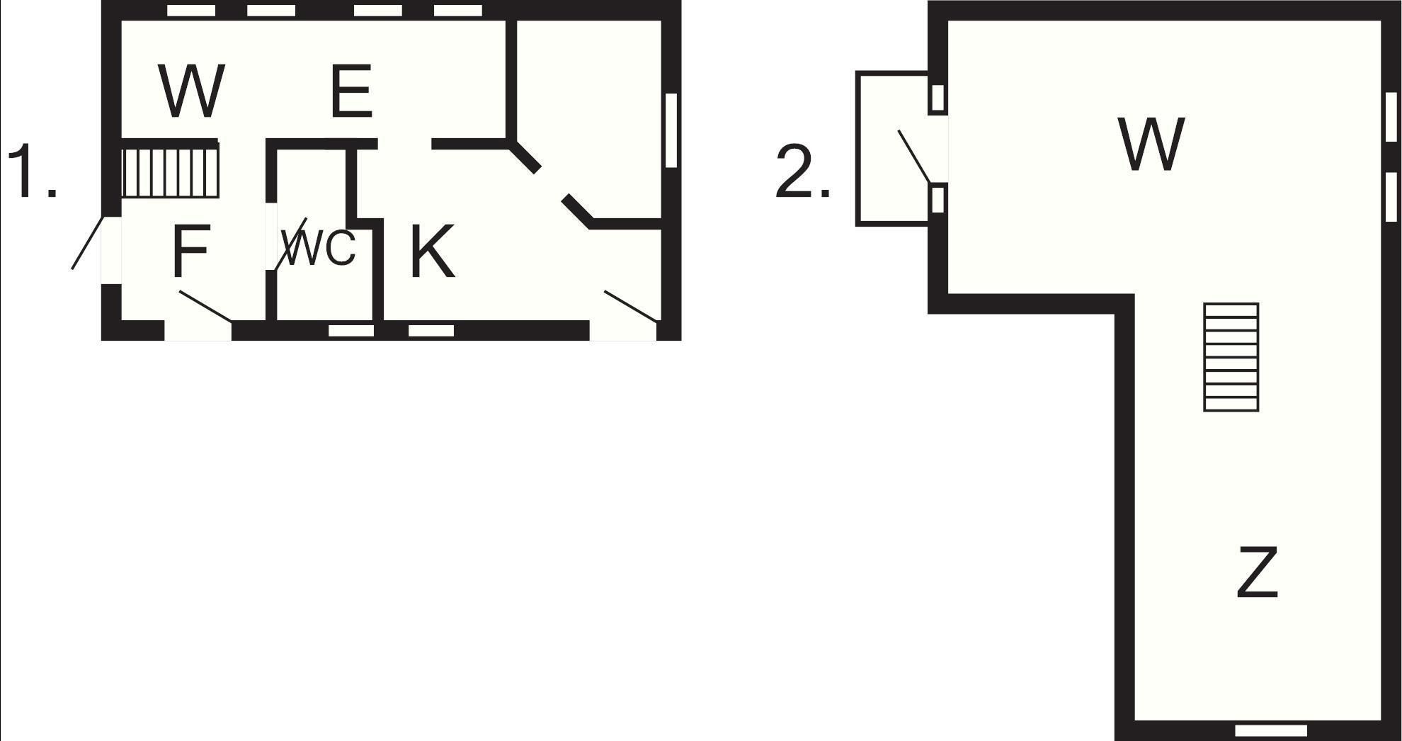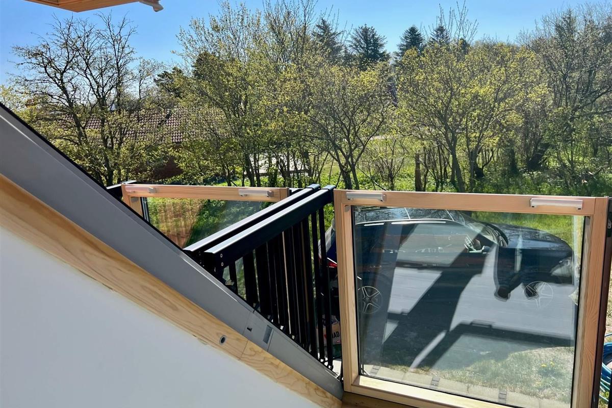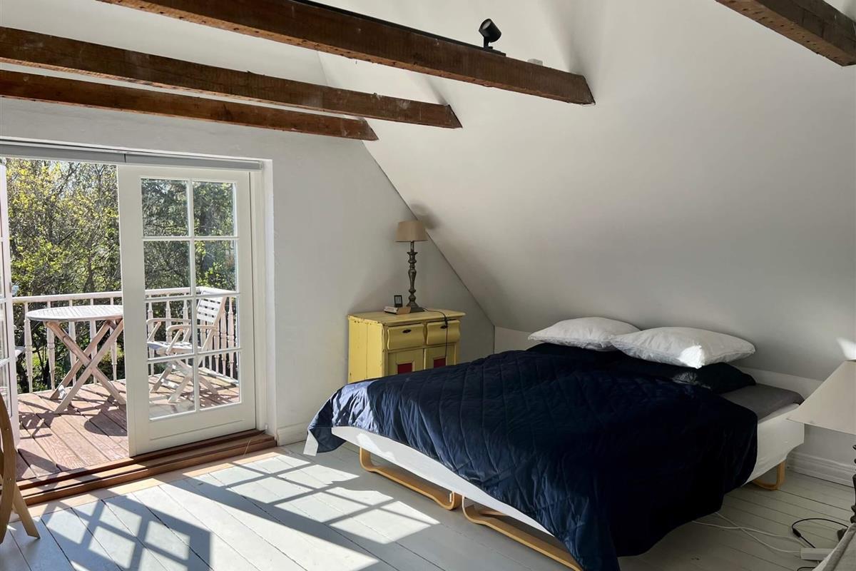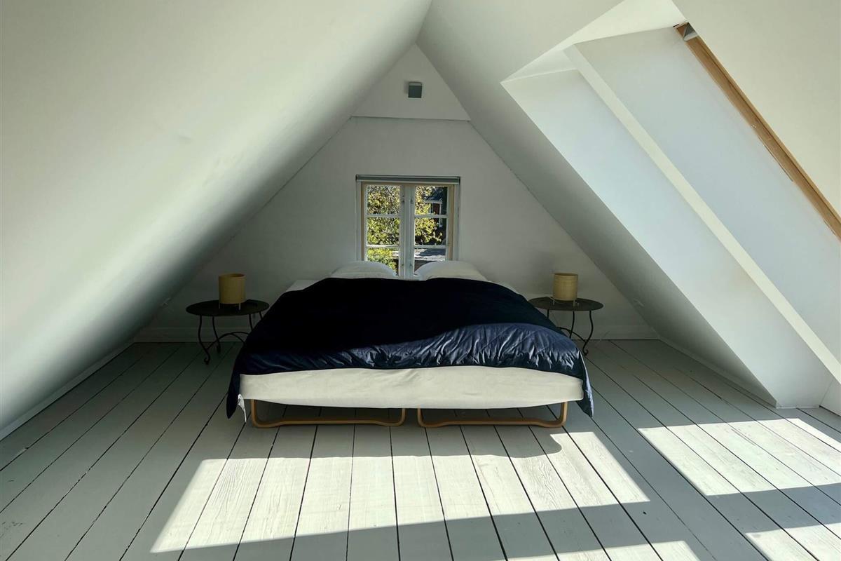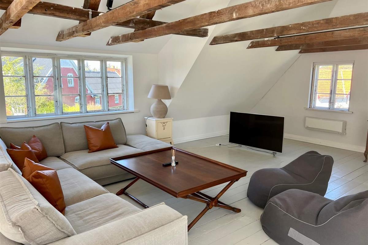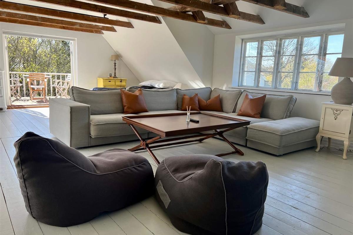 Im 1. Stock gibt es ein großes, helles Wohnzimmer über Eck, mit Zugang zu einem schönen Balkon. An jedem Ende des großen Lofts mit freigelegten Dachbalken steht ein Doppelbett.