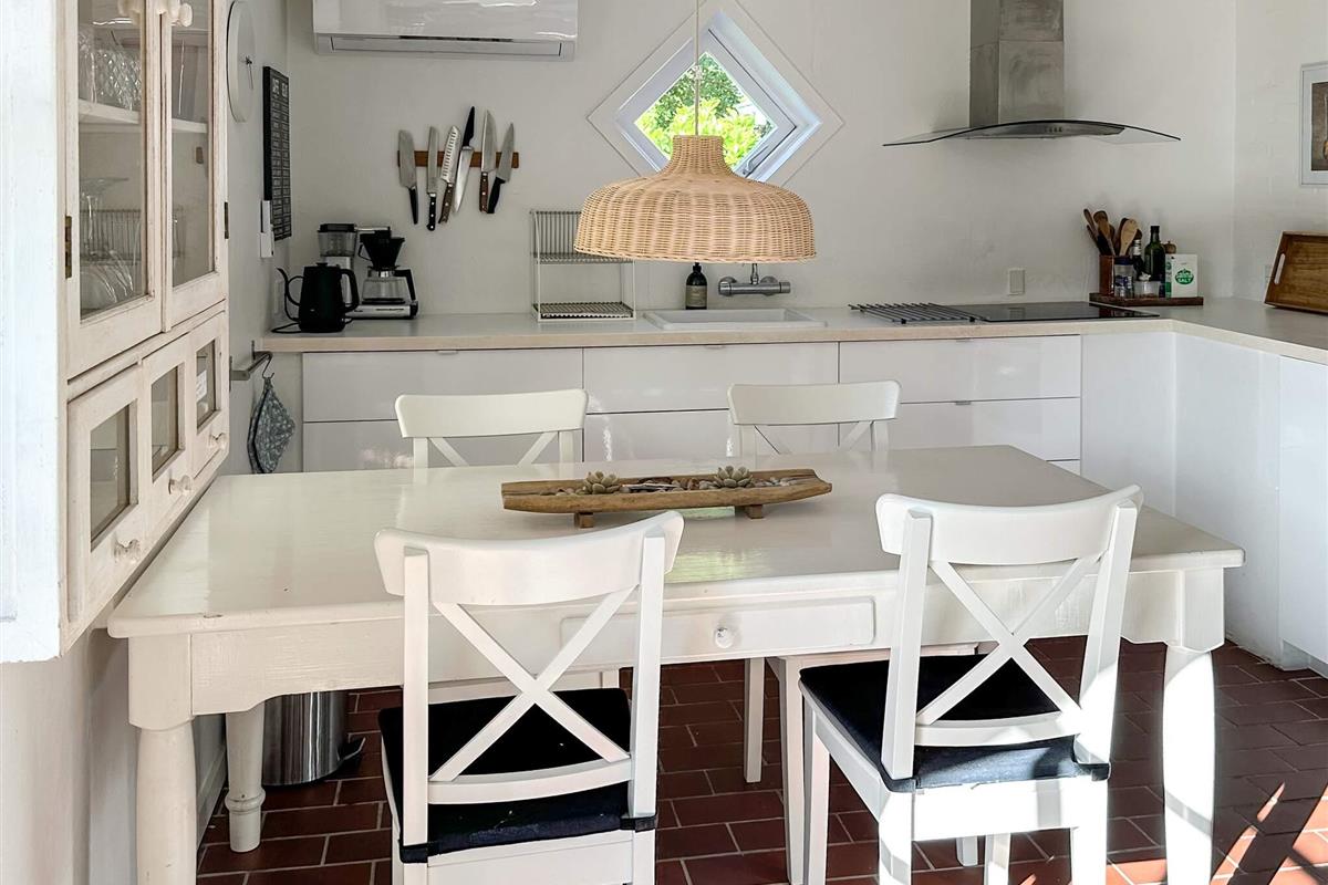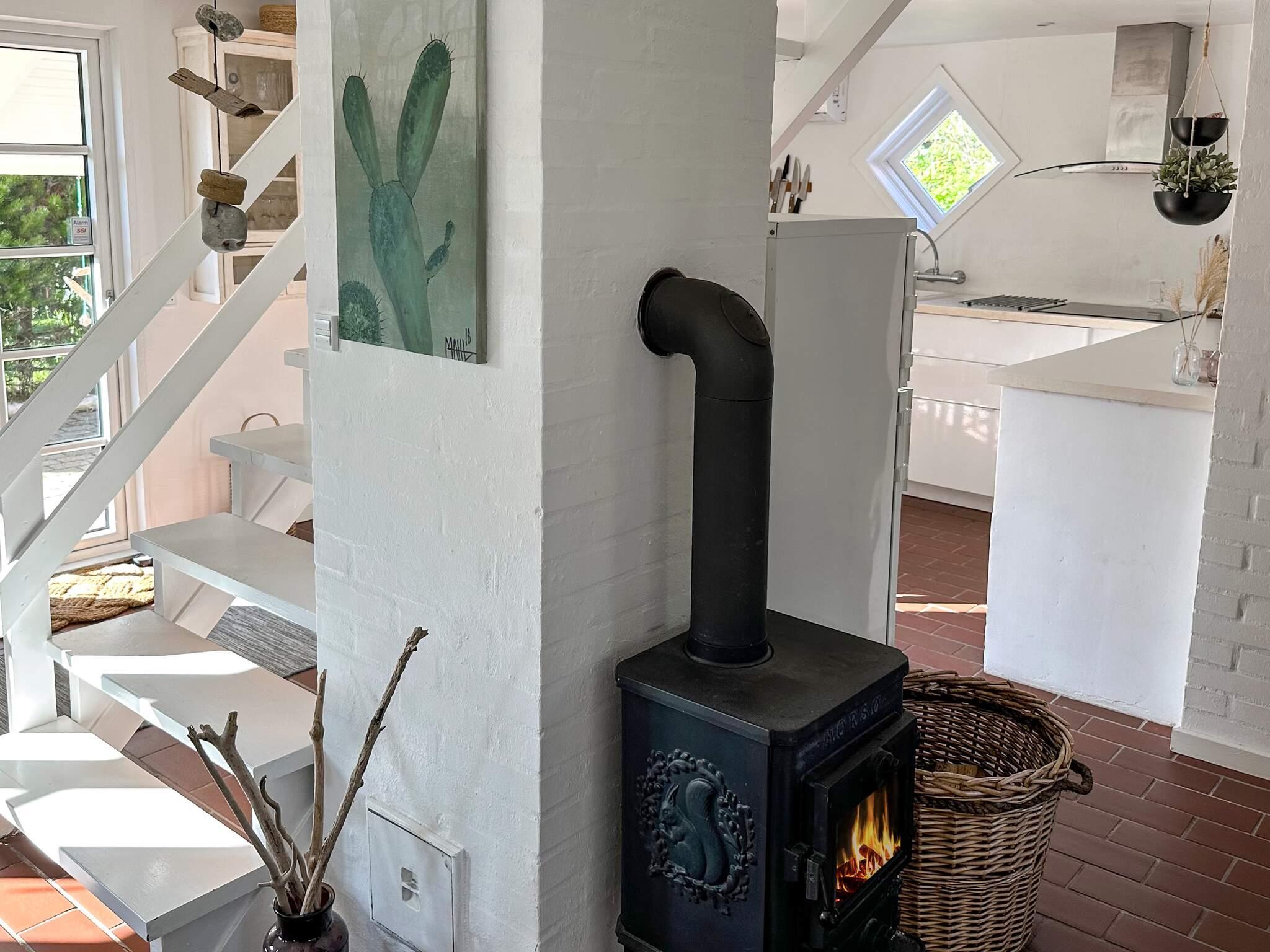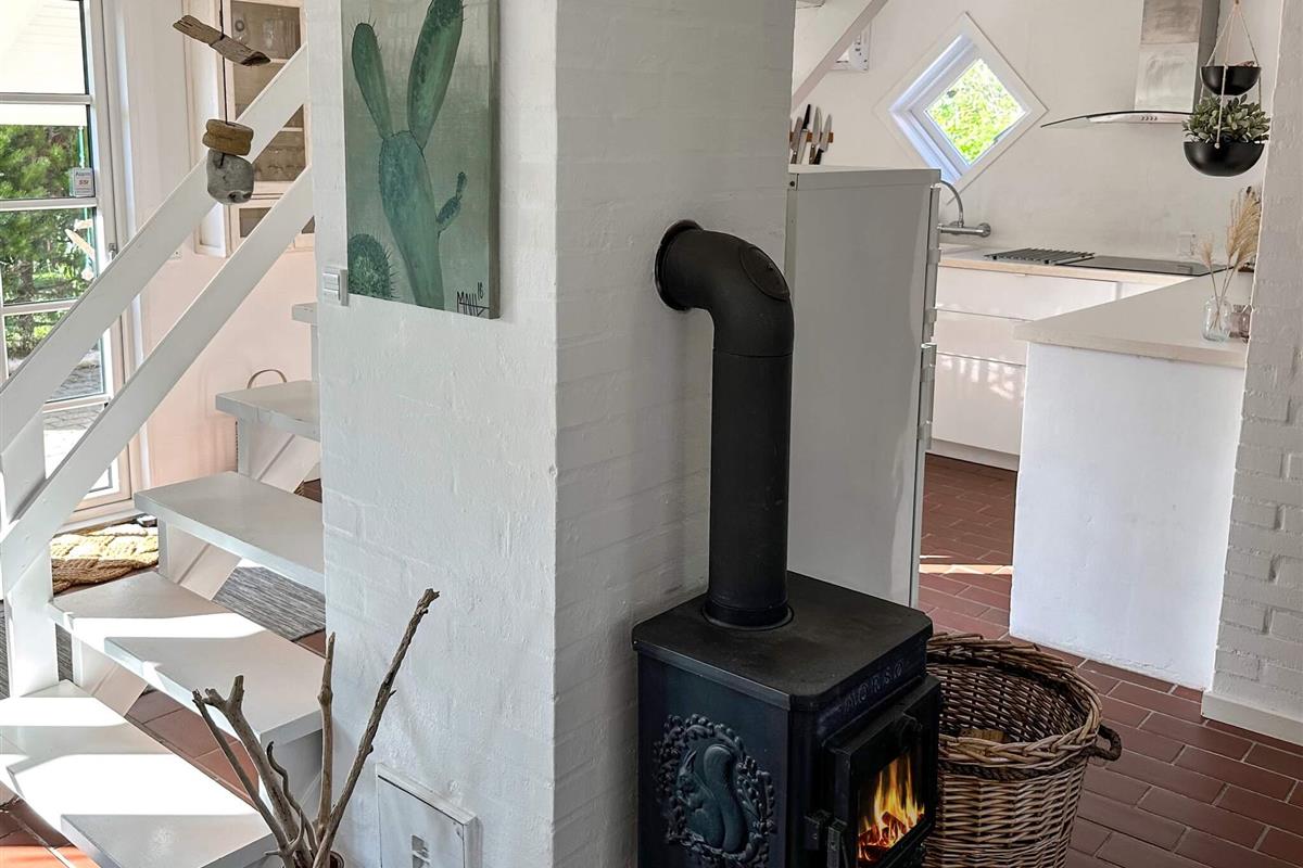 Das Ferienhaus ist hell und mit leicht rustikaler Note eingerichtet und bietet zwei Ebenen. Im Parterre finden Sie u.a. den Wohnbereich mit Holzofen und gemütlicher Essecke sowie die offen integrierte, moderne Küche mit Ceranfeld sowie separatem Backofen. Kleineres Bad und praktischer Hauswirtschaftsraum mit Waschmaschine unten.