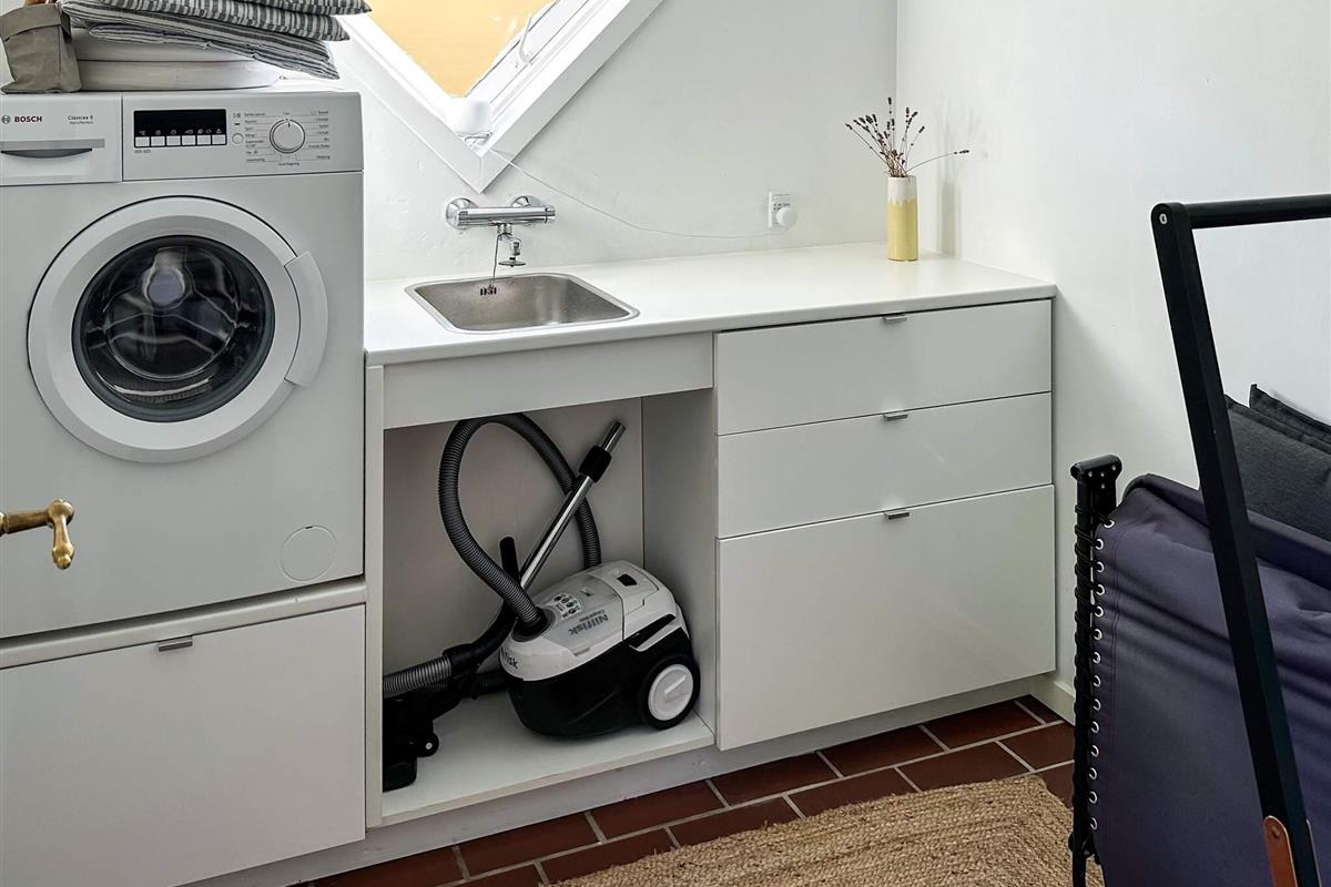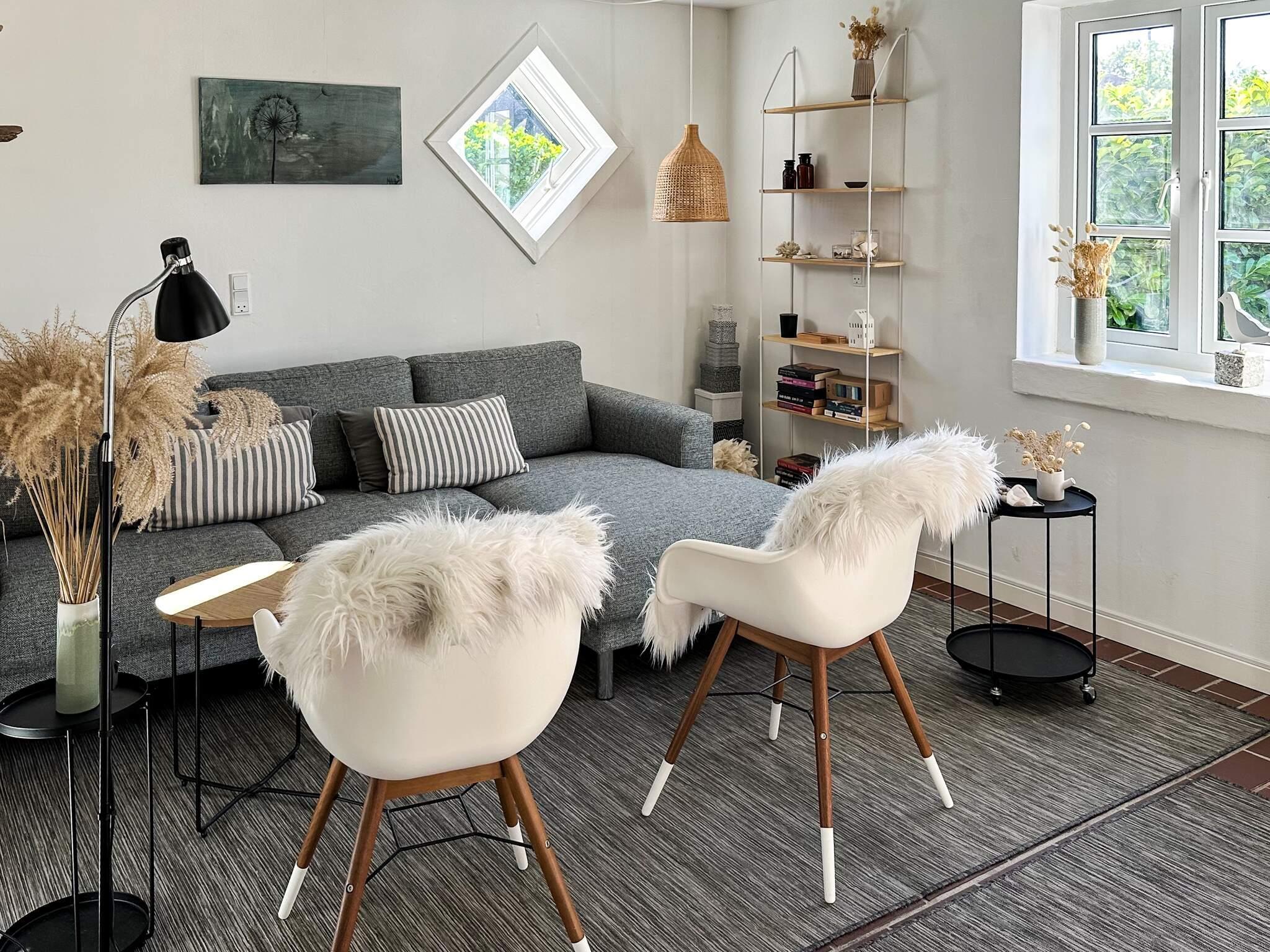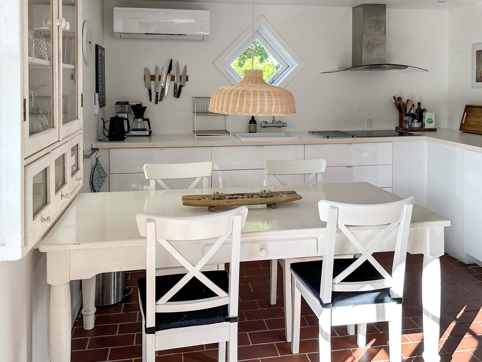 Das Ferienhaus ist hell und mit leicht rustikaler Note eingerichtet und bietet zwei Ebenen. Im Parterre finden Sie u.a. den Wohnbereich mit Holzofen und gemütlicher Essecke sowie die offen integrierte, moderne Küche mit Ceranfeld sowie separatem Backofen. Kleineres Bad und praktischer Hauswirtschaftsraum mit Waschmaschine unten.
