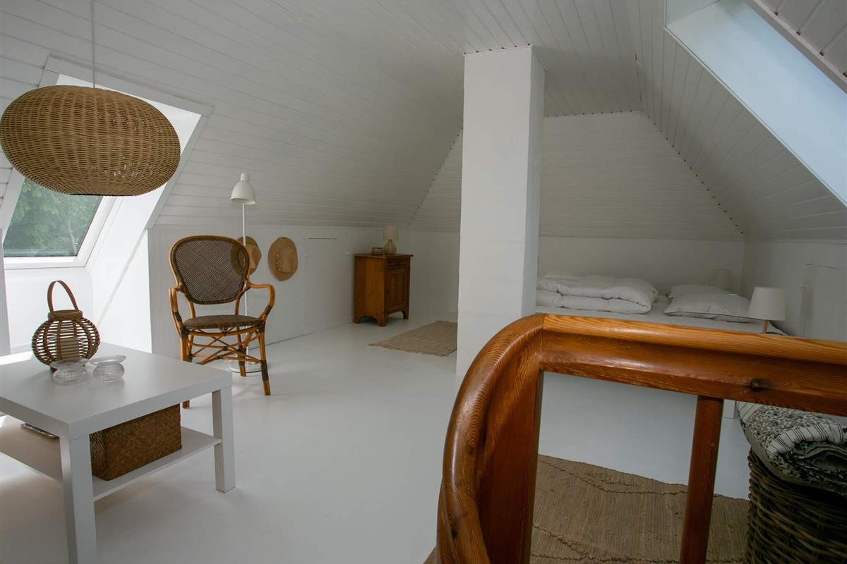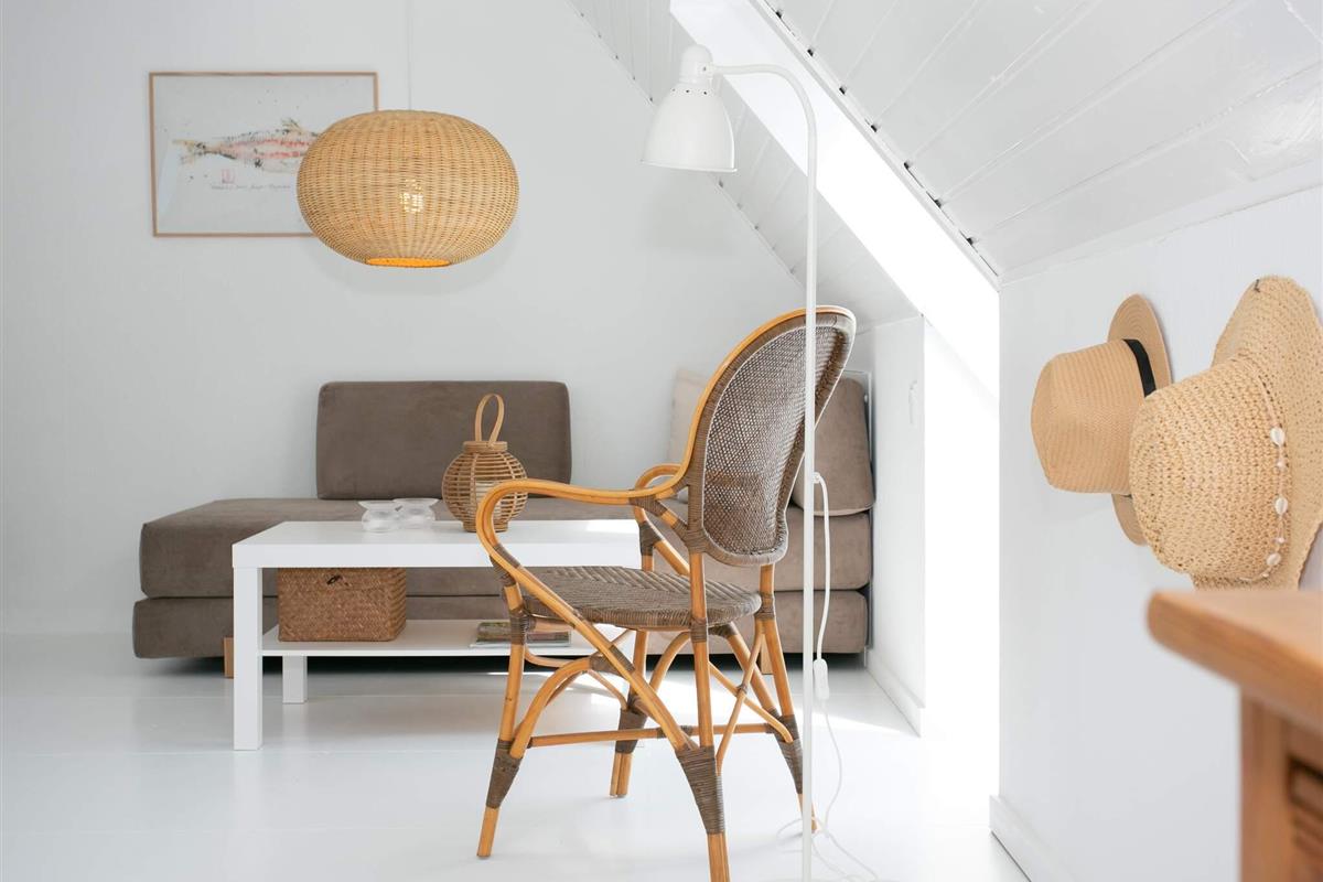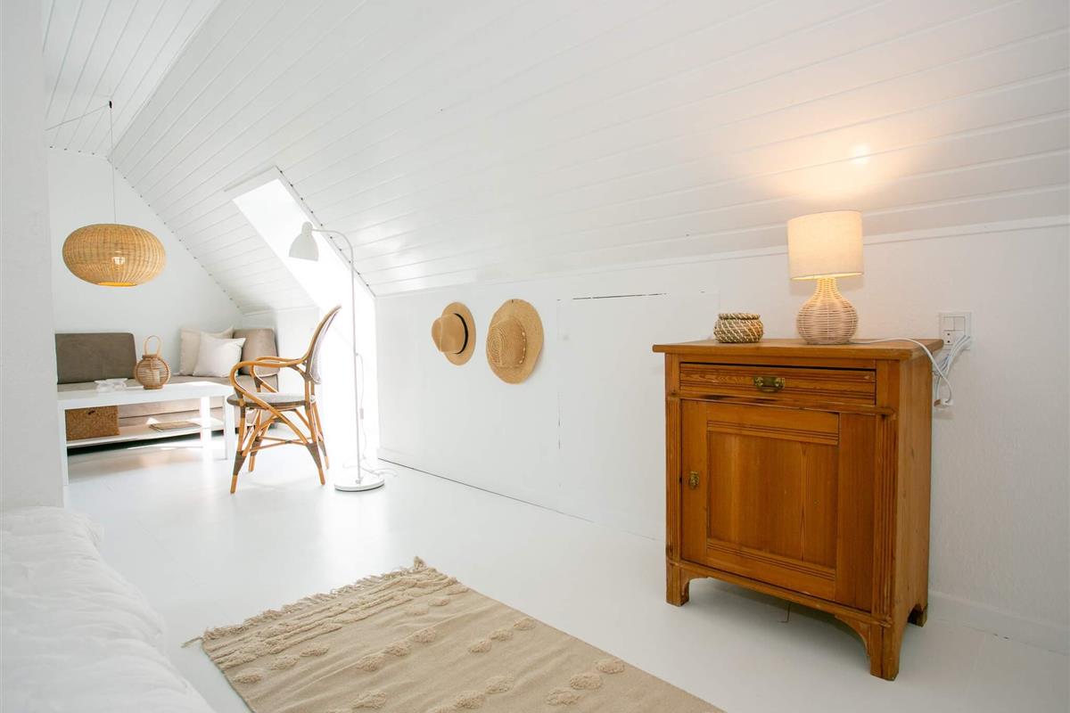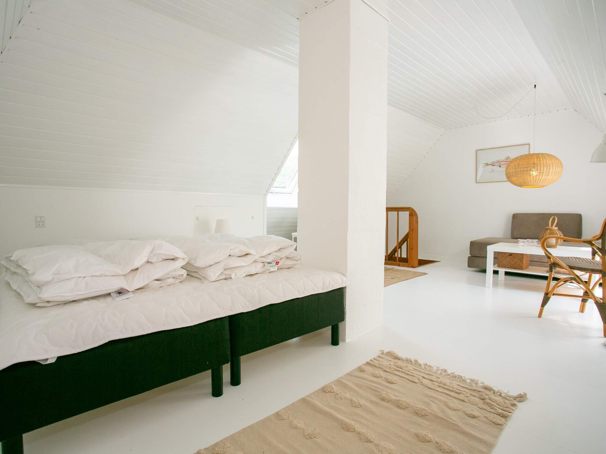 Im Dachgeschoss befindet sich ein großer, heller Wohn- und Schlafraum mit Doppelbett. Bei Bedarf können im Wohnbereich auch zwei lose Matratzen genutzt werden. Die Unterkunft verfügt somit über maximal vier Betten, eignet sich aber eher für ein Paar mit kleinen Kindern. Es gibt schnelles WLAN und einen Smart-TV mit der Möglichkeit, eigene Anbieter zu streamen.