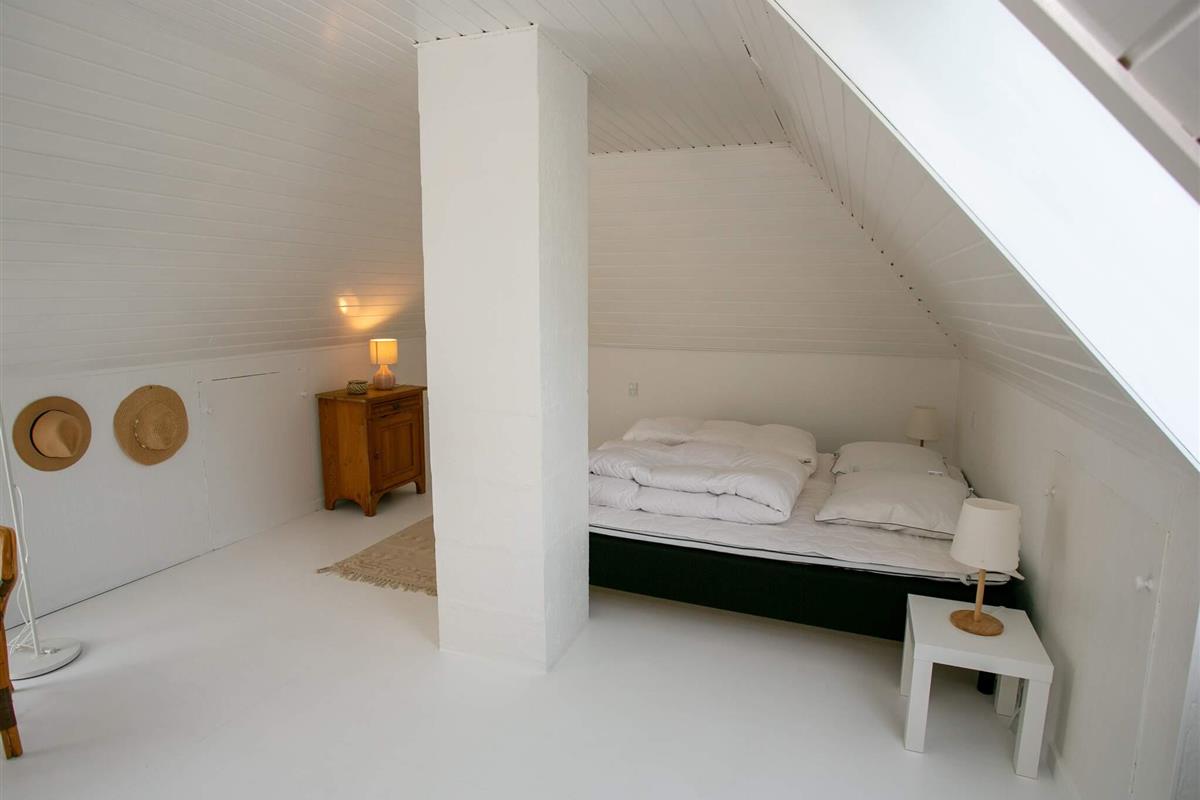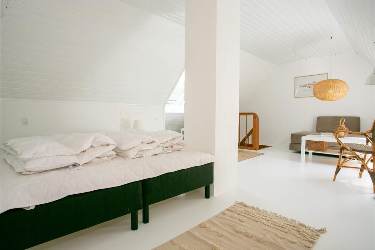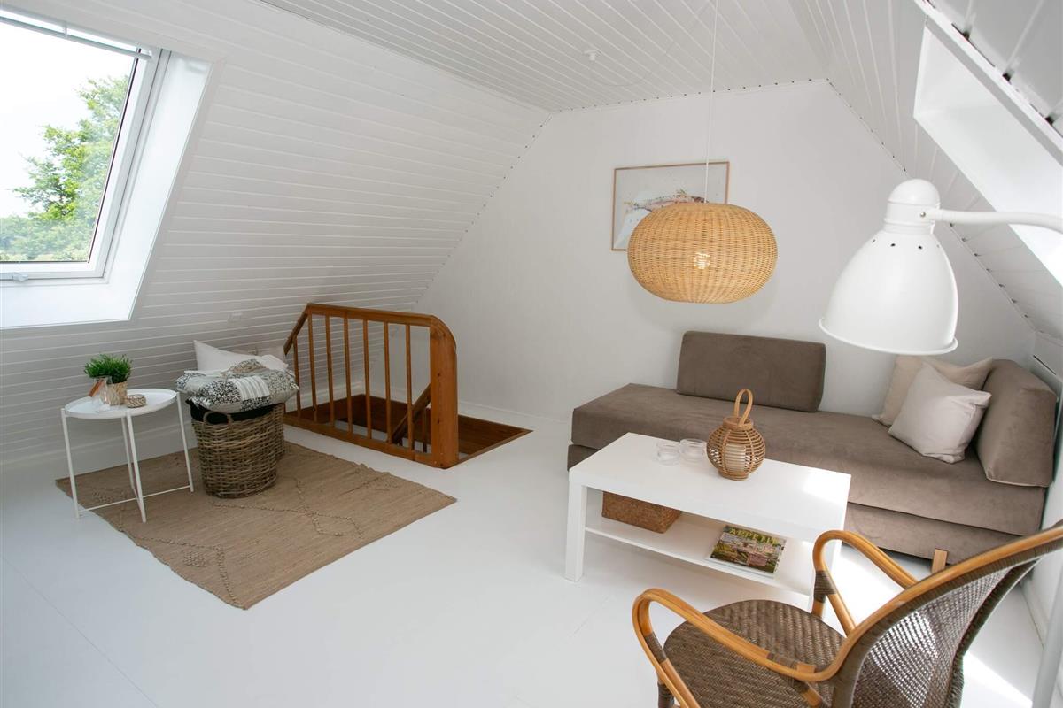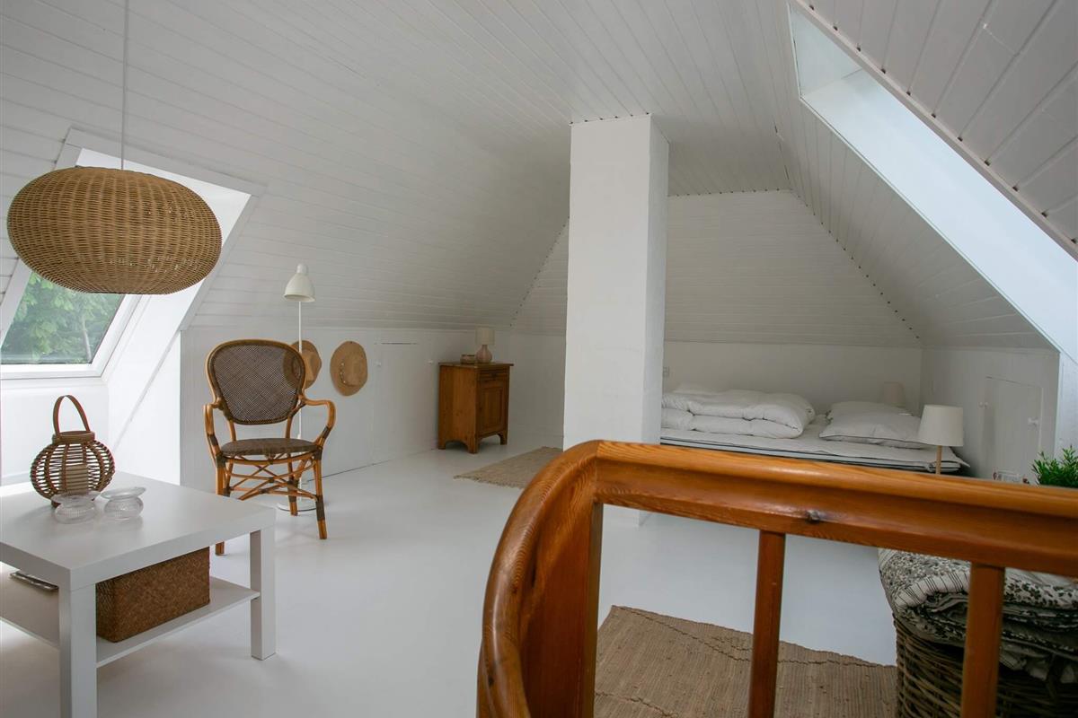 Im Dachgeschoss befindet sich ein großer, heller Wohn- und Schlafraum mit Doppelbett. Bei Bedarf können im Wohnbereich auch zwei lose Matratzen genutzt werden. Die Unterkunft verfügt somit über maximal vier Betten, eignet sich aber eher für ein Paar mit kleinen Kindern. Es gibt schnelles WLAN und einen Smart-TV mit der Möglichkeit, eigene Anbieter zu streamen.