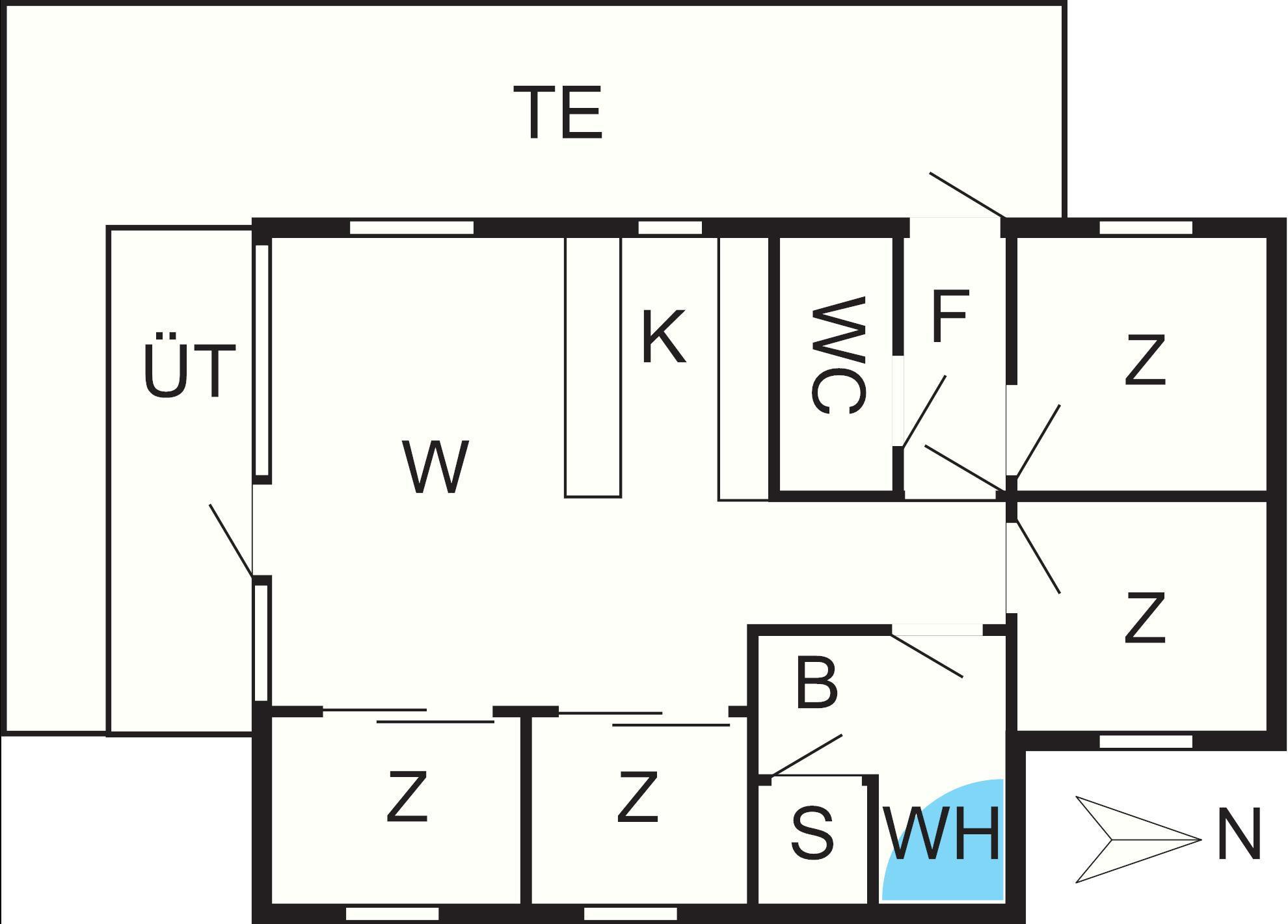 Bad: WC, Waschb., Dusche, Fußbodenheiz.