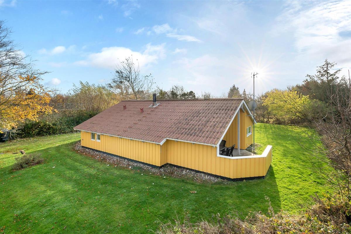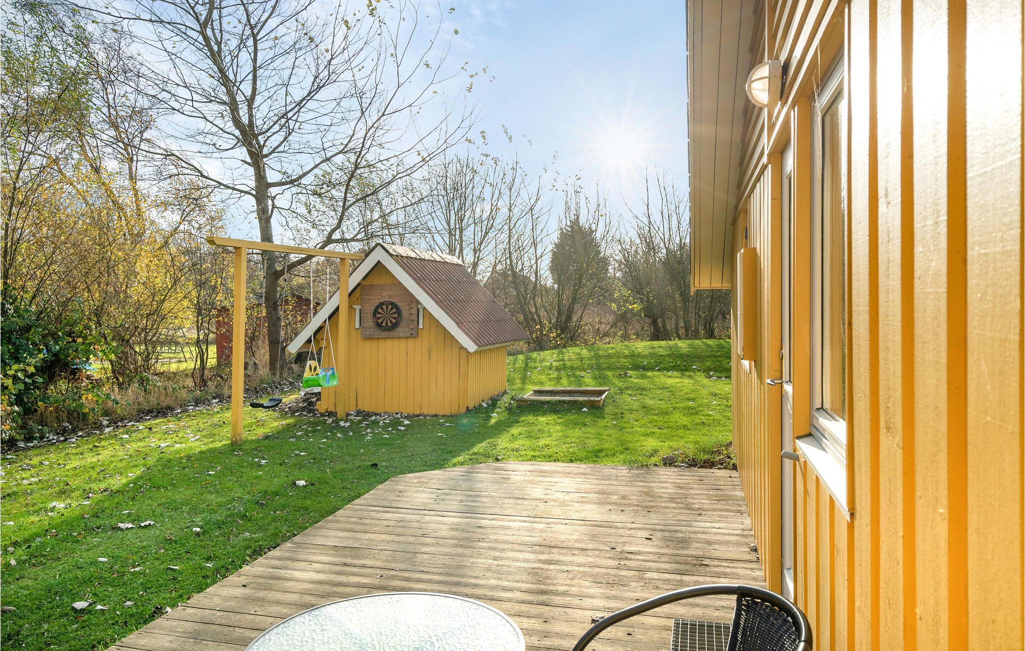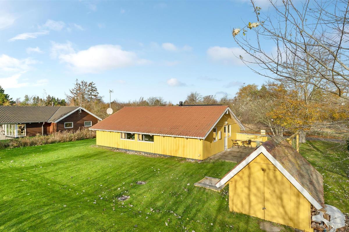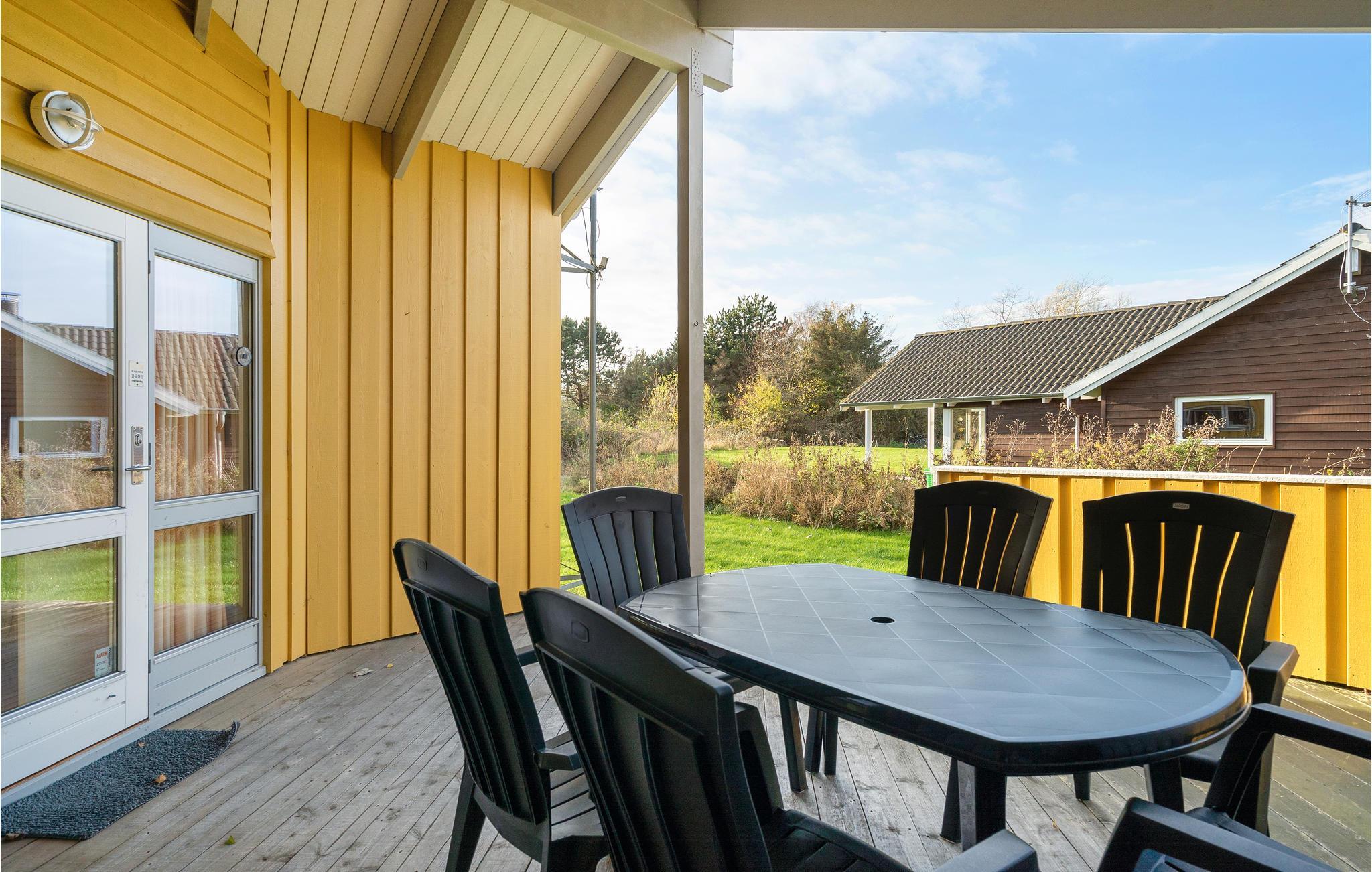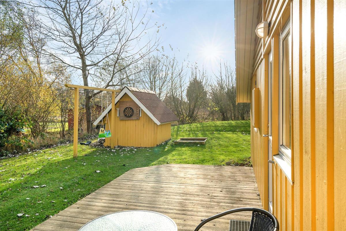 Modern houten vakantiehuis nabij zee met overdekt terras en veel speelruimte.