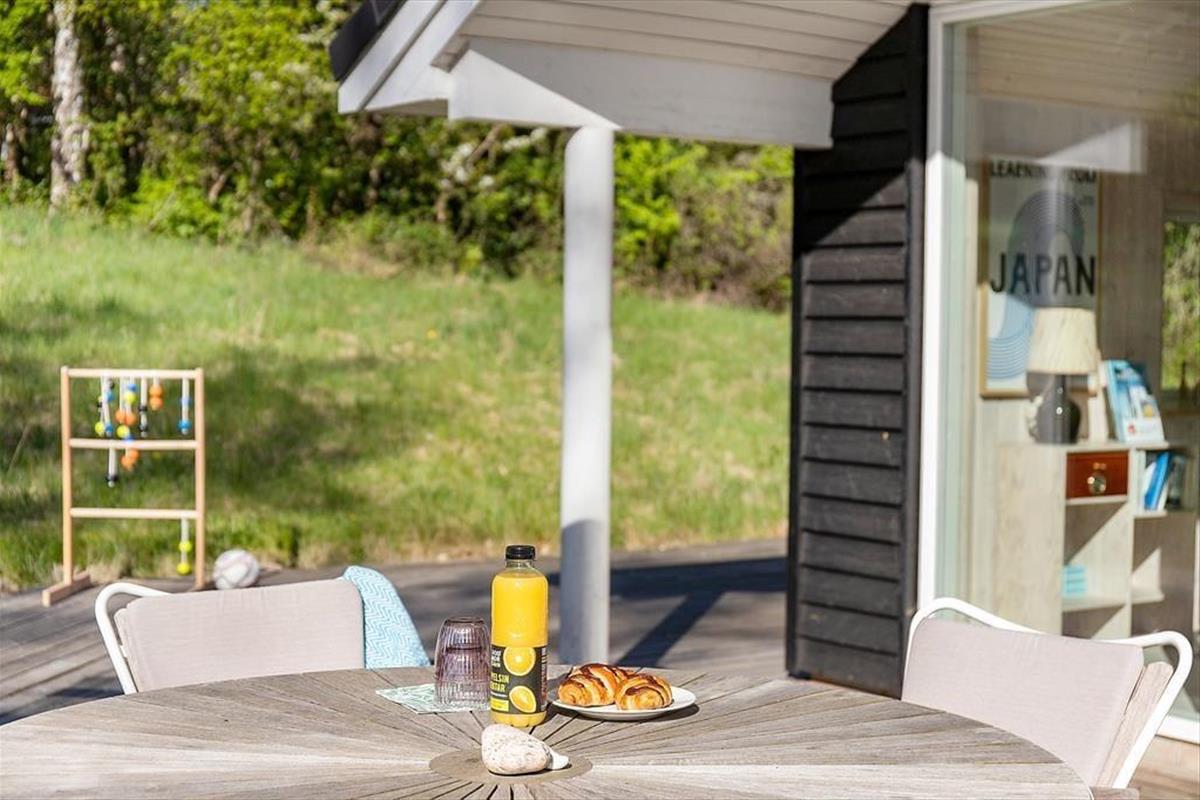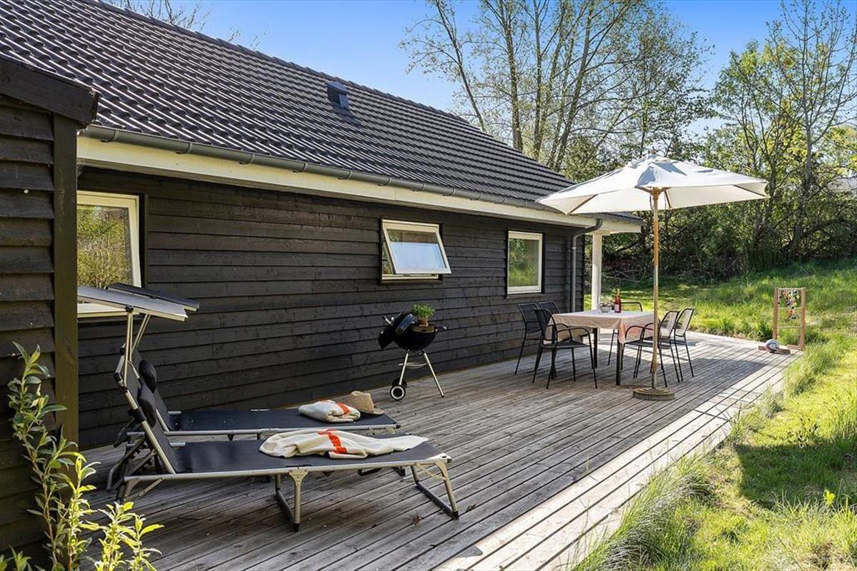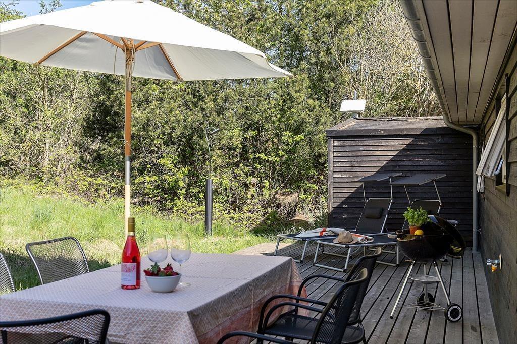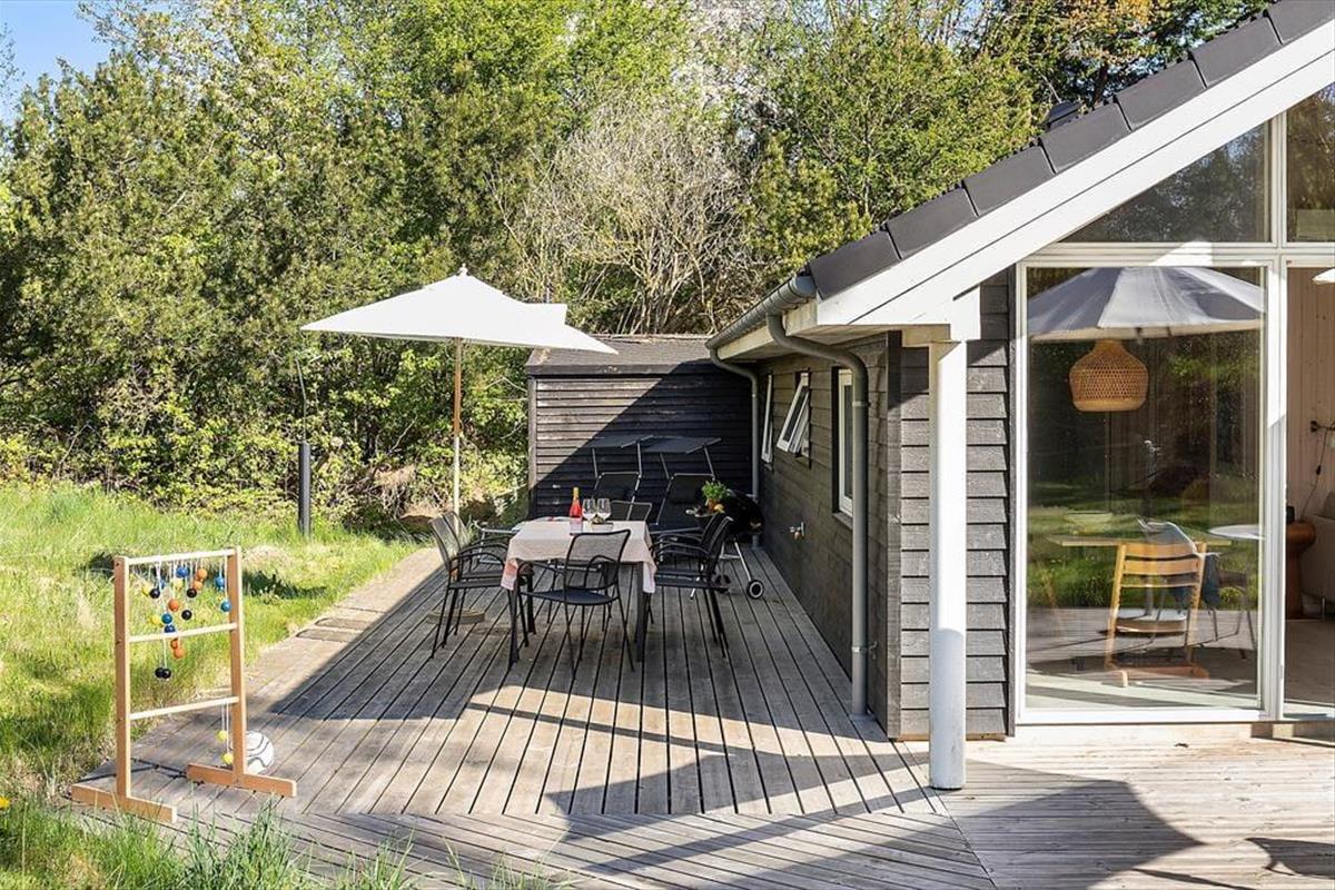 Die große Holzterrasse ist das Herzstück des Außenbereichs – hier kannst du den ganzen Tag über der Sonne folgen oder dir ein schattiges Plätzchen suchen, da die Terrasse das Haus rundherum umgibt. Auf der Rückseite findest du eine völlig private Terrasse, wo du auch die herrliche Außendusche nach einem Strandbesuch genießen kannst. Der gepflegte Rasen im Garten eignet sich perfekt zum Spielen, Ballspielen und Spaßhaben, und im Schuppen findest du Spiele wie Leitergolf für die ganze Familie.