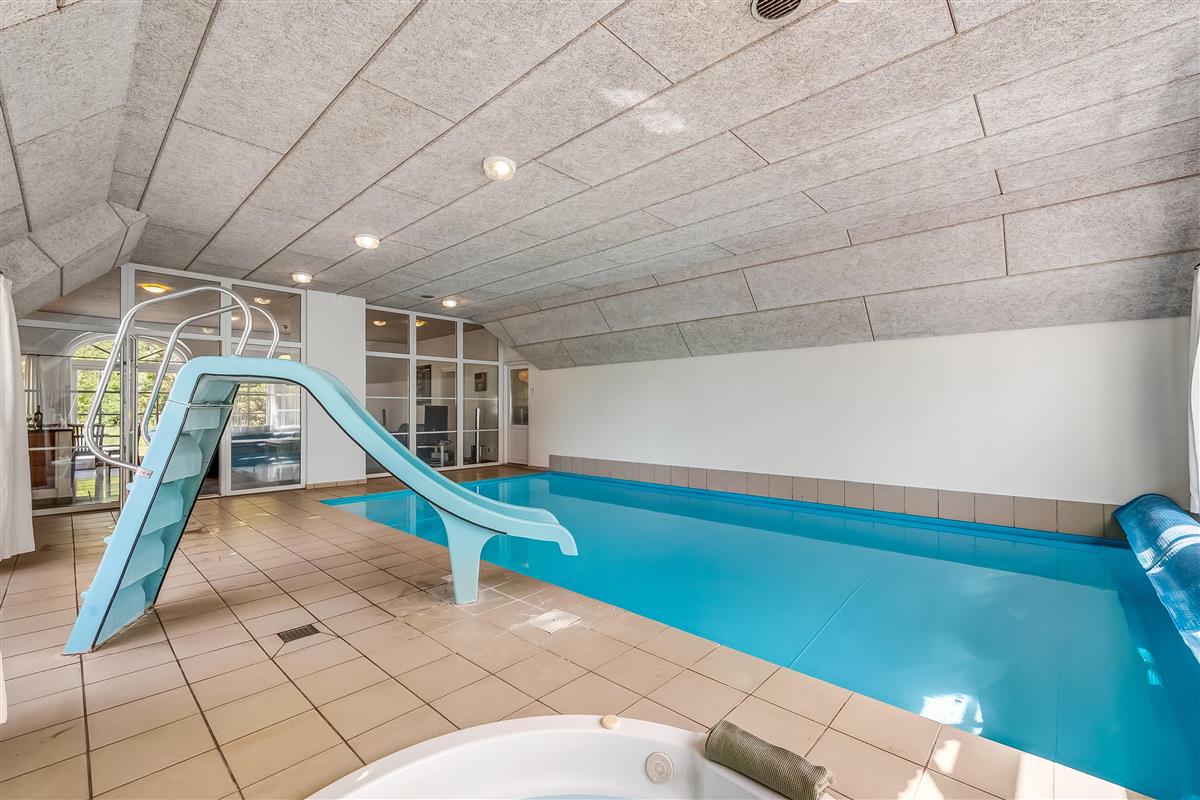 The house's spacious pool area features a 32 square meter swimming pool with an attached water slide, making it a hit with the kids.