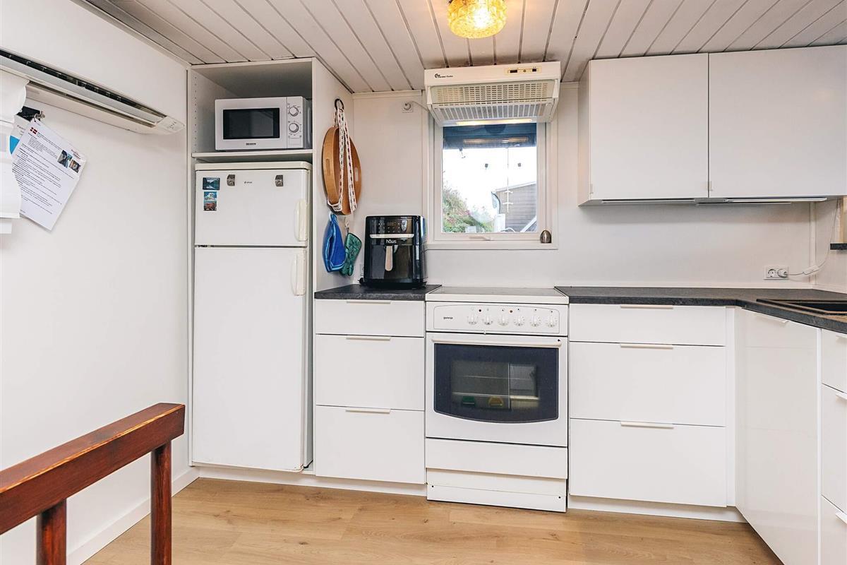 Im ersten Stock befindet sich eine neue, stilvolle KVIK-Küche (2025) mit Cerankochfeld, Heißluftfritteuse, Mikrowelle, Kühl-/Gefrierschrank und Kaffeemaschine.