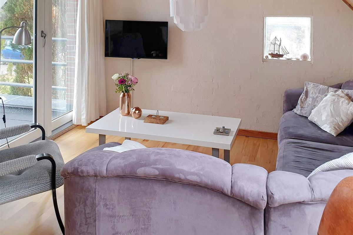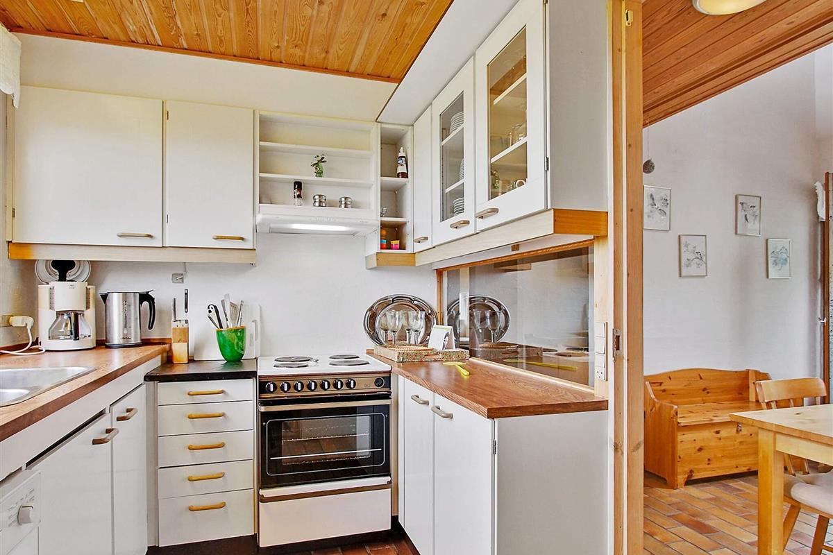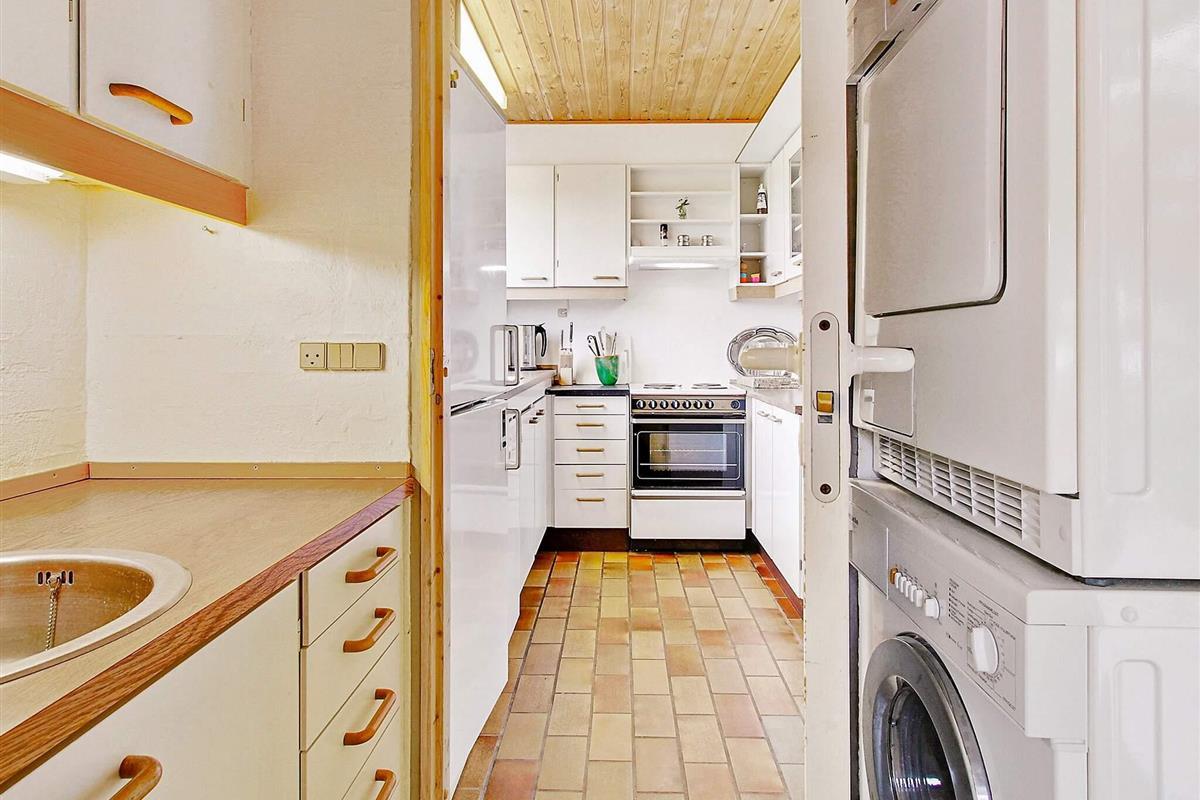 Im Parterre: Funktionale Einrichtung und offener Küchen-/Essbereich mit Dachschrägen. Zur umfassenden Küchenausstattung gehören Herd, Dunstabzugshaube, Mikrowelle, Kühl-/Gefrierschrank, Kaffeemaschine und Geschirrspüler. Darüber hinaus befinden sich im Erdgeschoss folgende Räume: Badezimmer mit WC, Waschbecken, Dusche und komfortabler Fußbodenheizung sowie Schlafzimmer mit zwei Einzelbetten und praktischer Hauswirtschaftsraum mit Waschmaschine und Trockner.