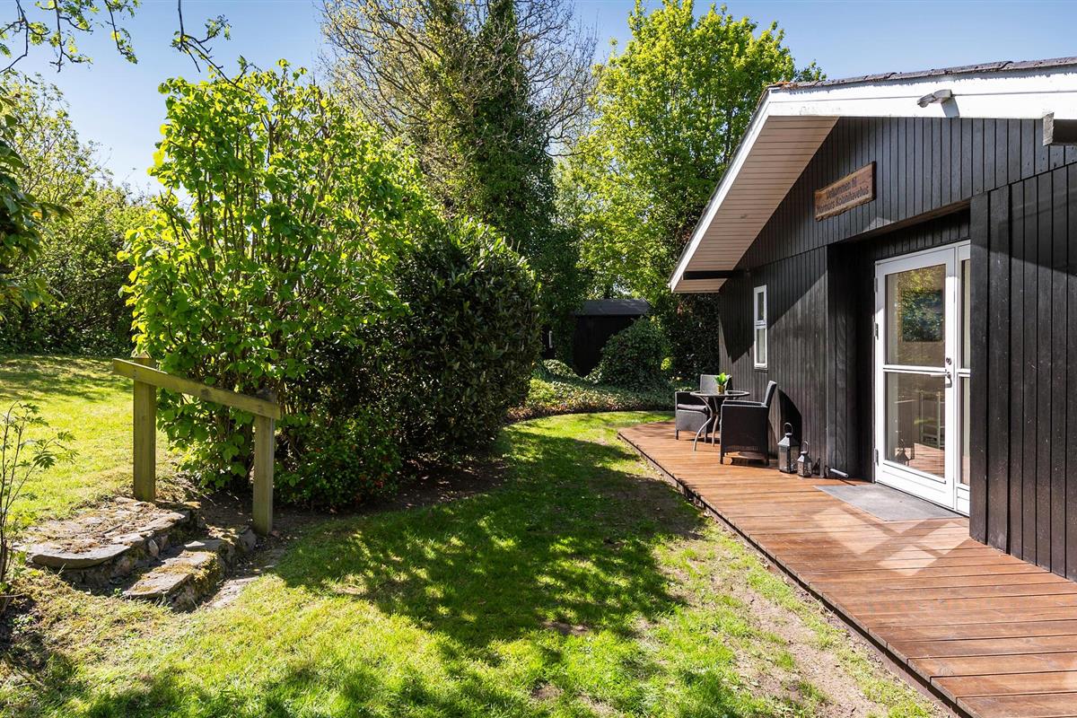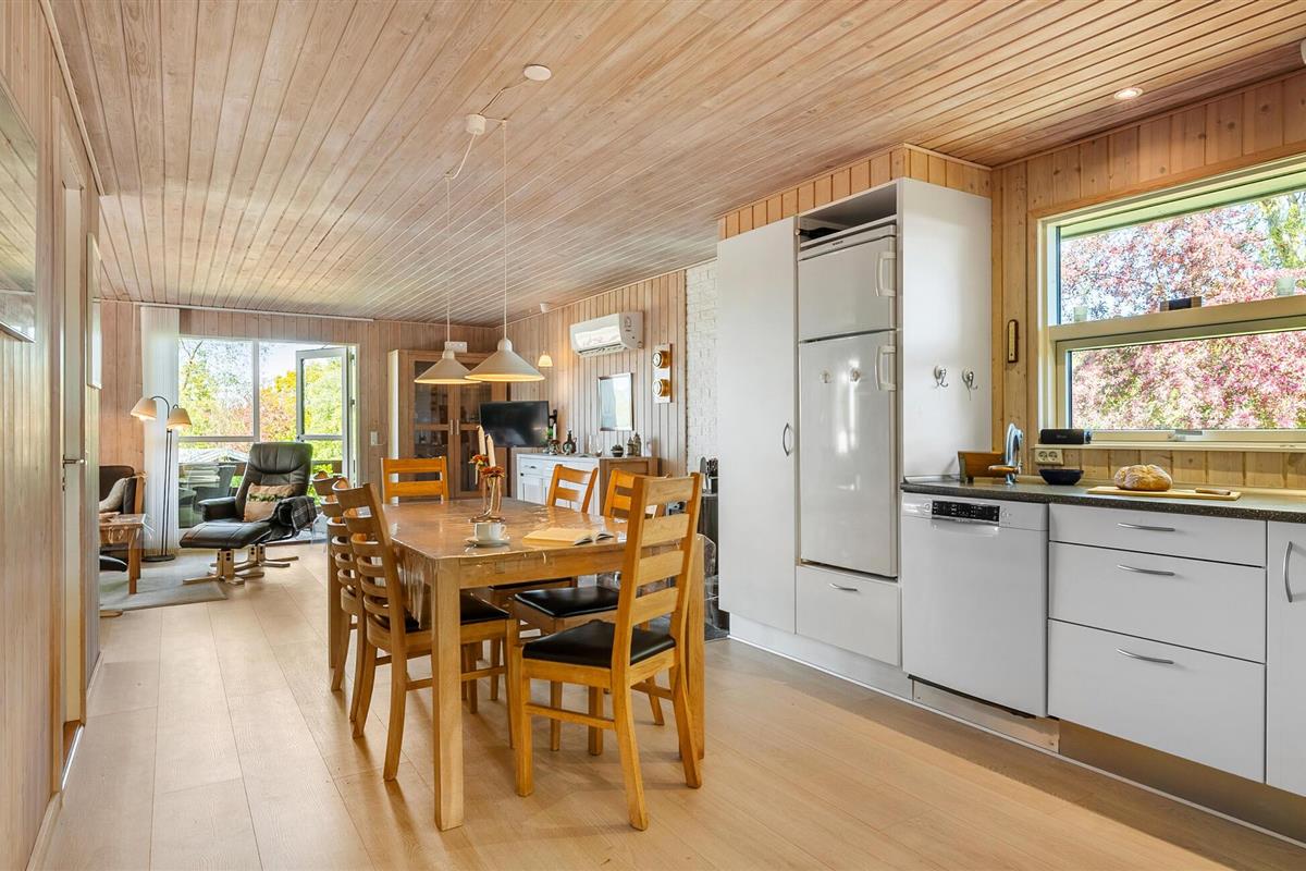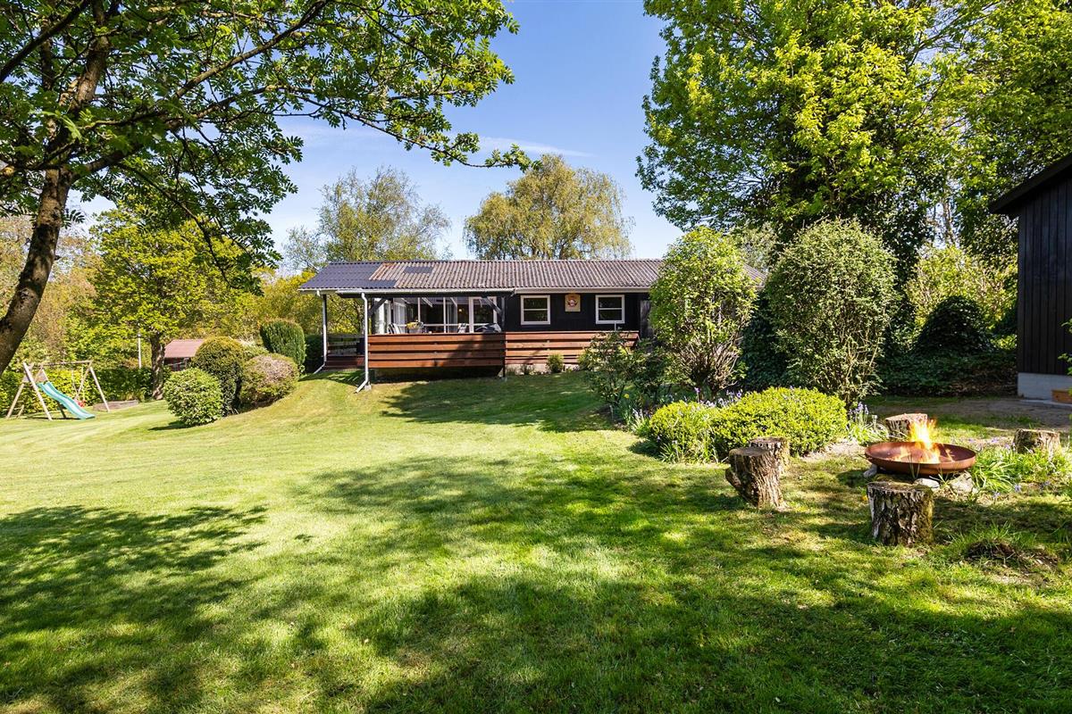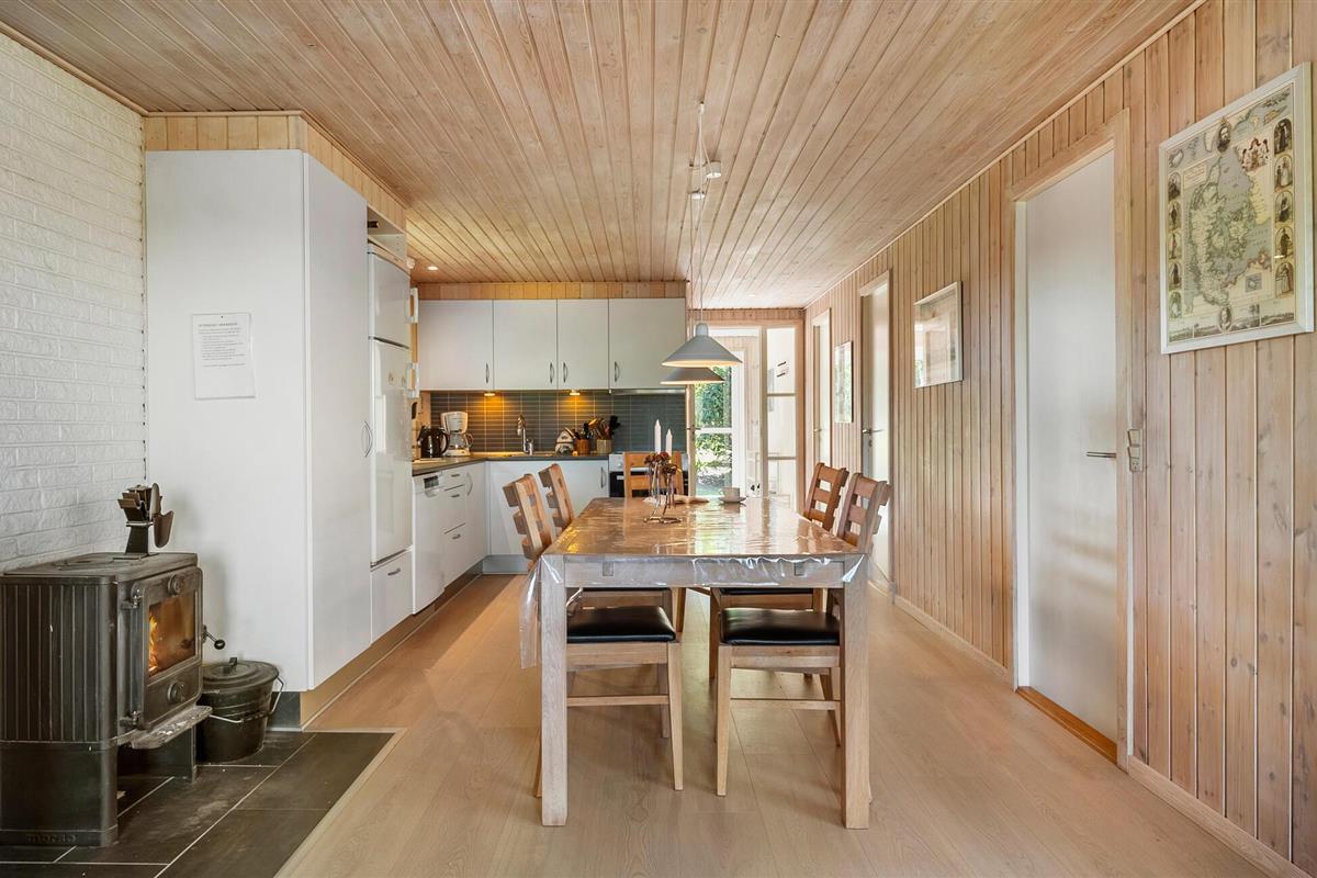 Dit charmante vakantiehuis is genesteld in een goed onderhouden tuinlandschap en biedt de ideale omstandigheden voor een rustige vakantie. Begin de dag met een ontbijt op het overdekte terras of geniet van je maaltijden binnen aan de grote eettafel. De open woon- en eetruimte met zijn grote ramen laat veel natuurlijk licht binnen en creëert een gezellige sfeer. Leun achterover op de comfortabele bank, kijk een film of rond de avond af bij de open haard.