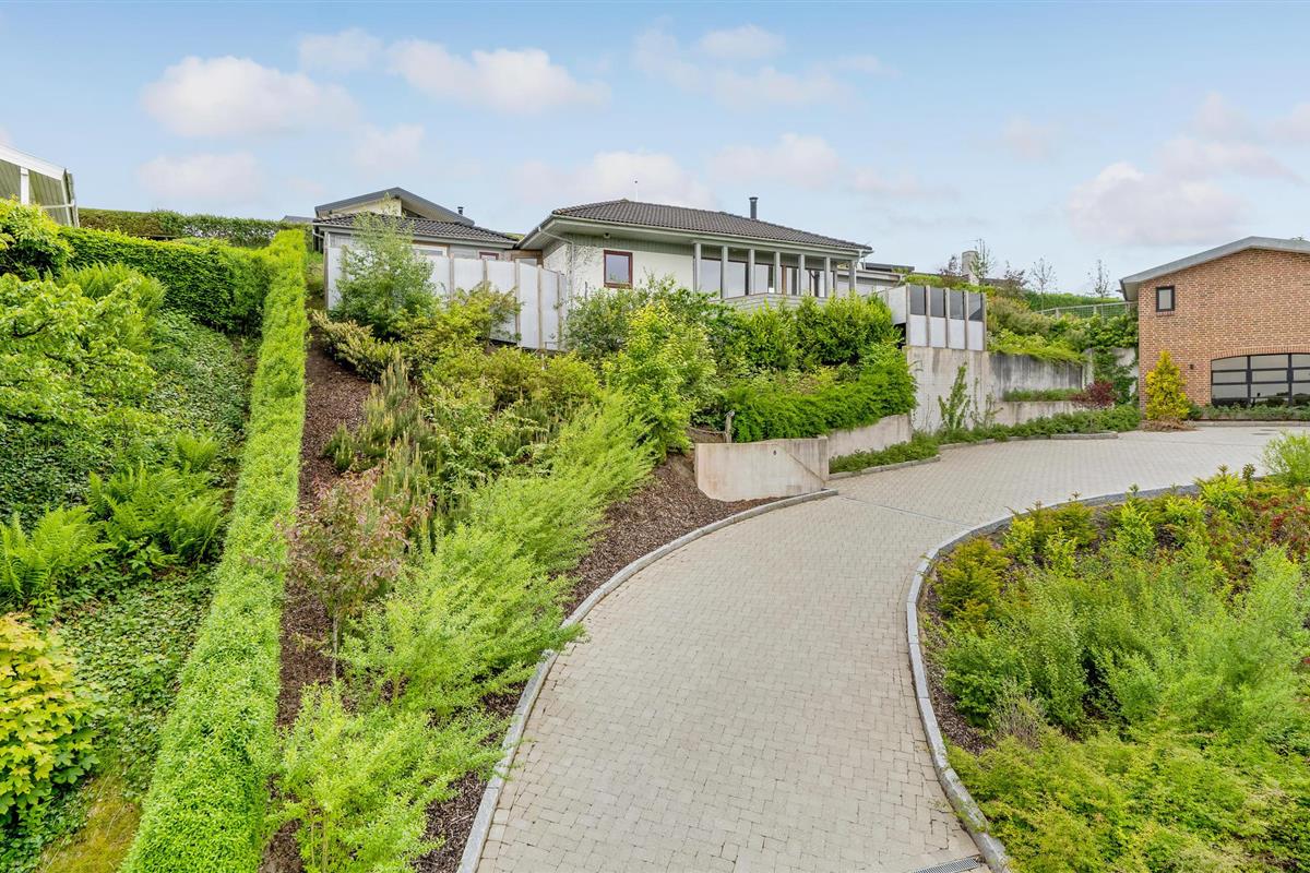 Modern vakantiehuis met panoramisch uitzicht op fjord en omgeving, met twee zonneterrassen en nabij sport- en speelvoorzieningen.