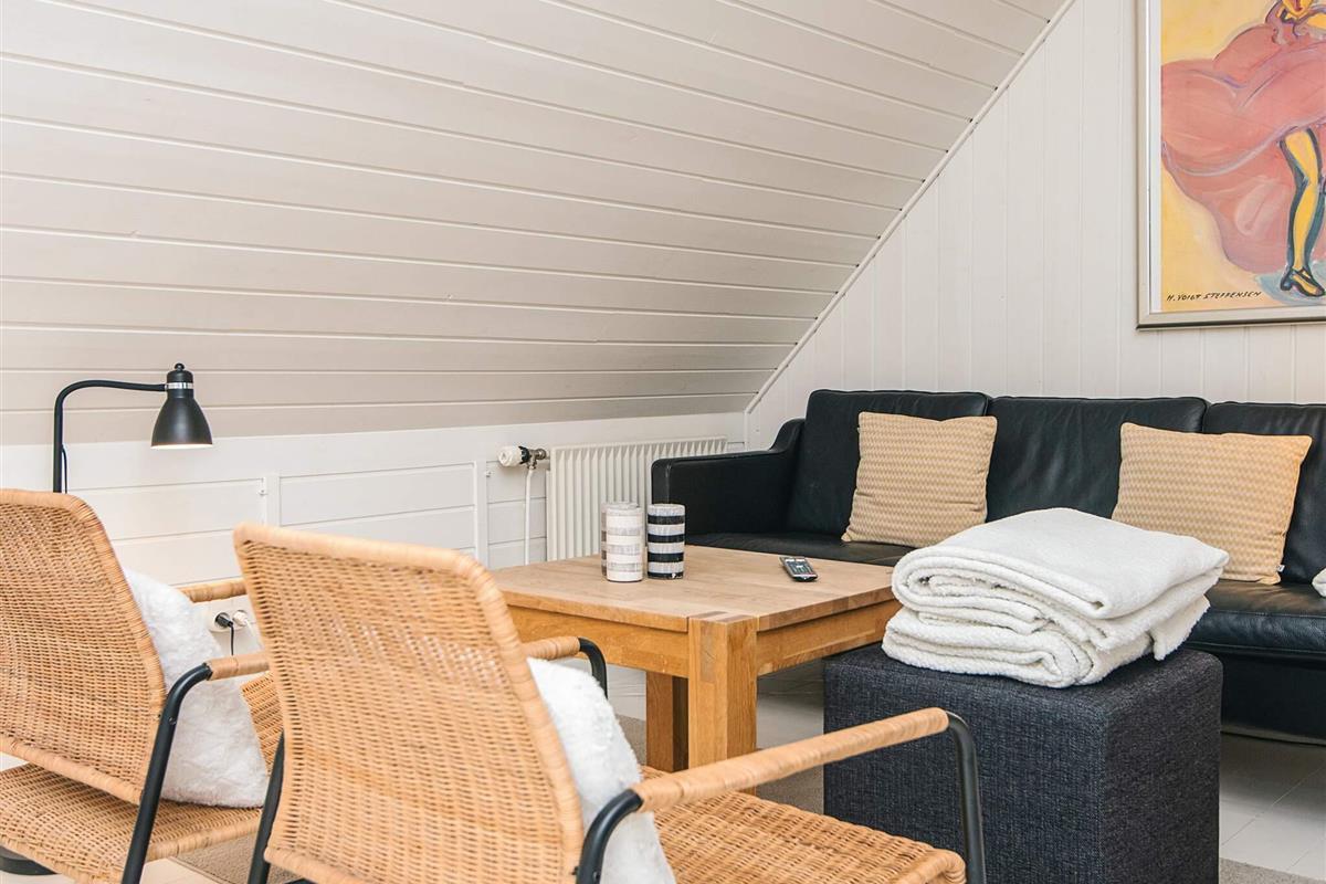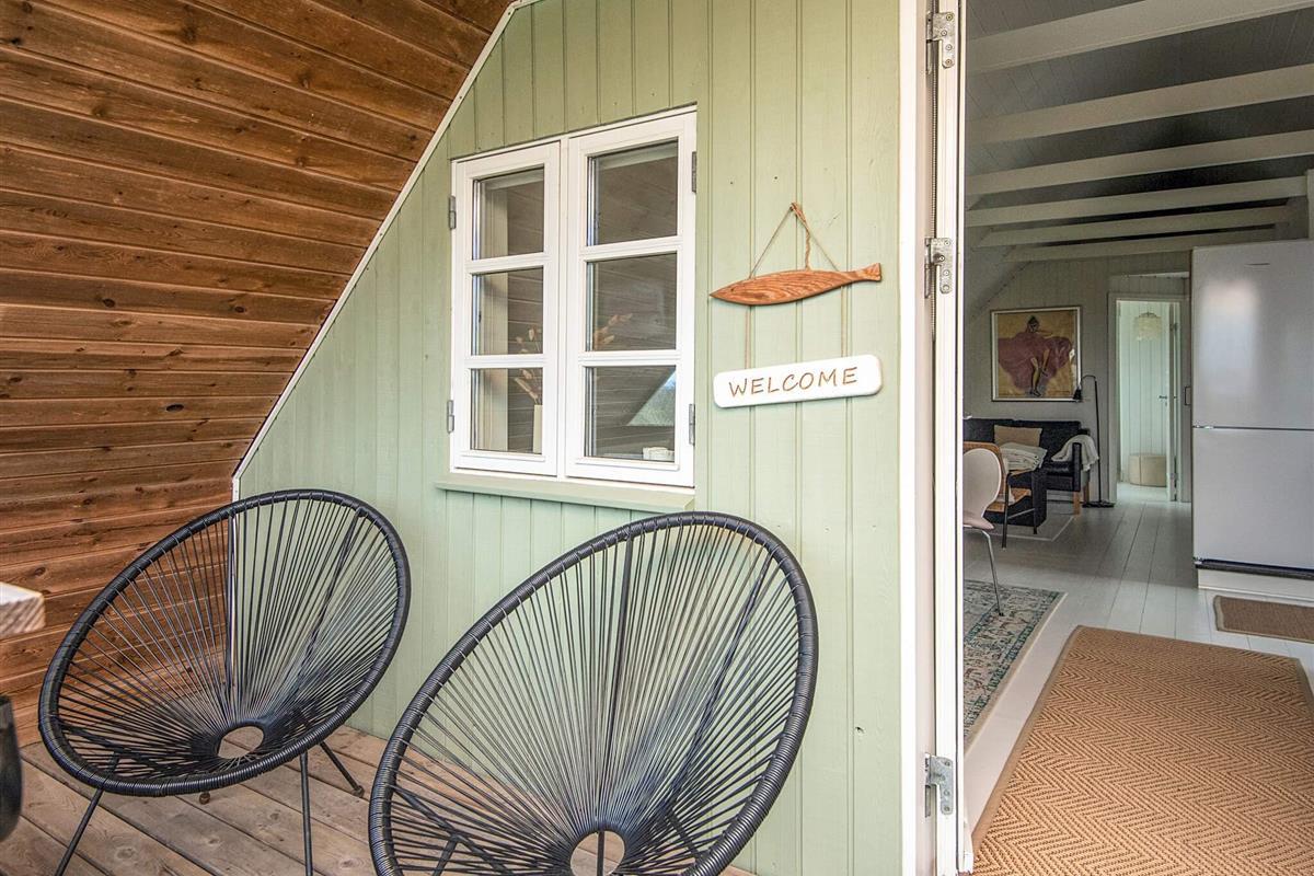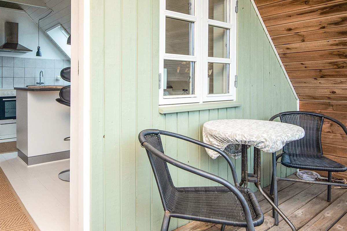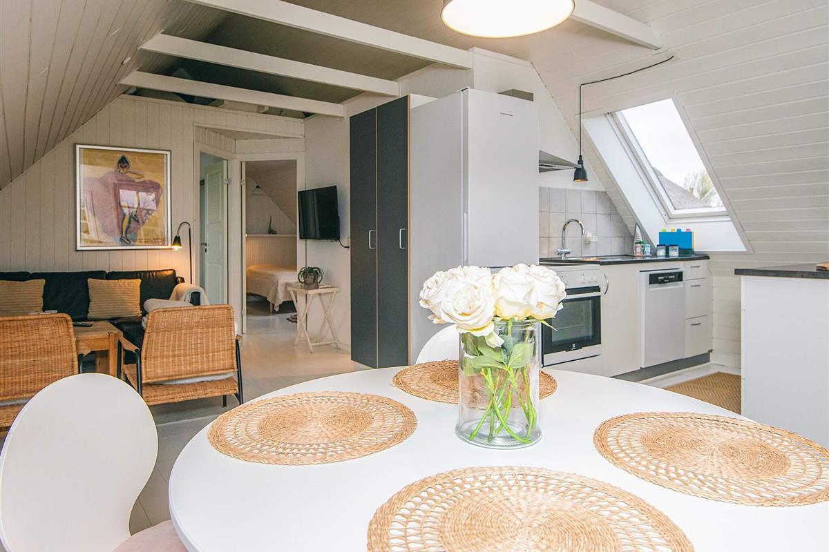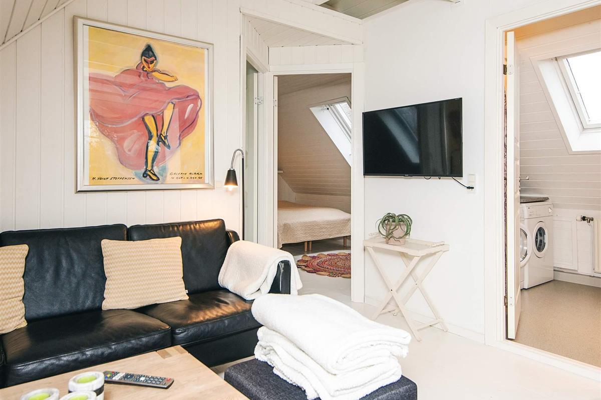 Nicht weit vom Badestrand bei Høll entfernt befindet sich diese helle Ferienwohnung im Dachgeschoss. Separater Zugang über eine Außentreppe zur Wohnung. Vor dem Eingang gibt es einen überdachten Balkon mit Sitzgelegenheiten und schönem Ausblick in die Umgebung. Die Wohnung ist hell und wohnlich eingerichtet und gut ausgestattet mit modermen Mobiliar und guten Betten.