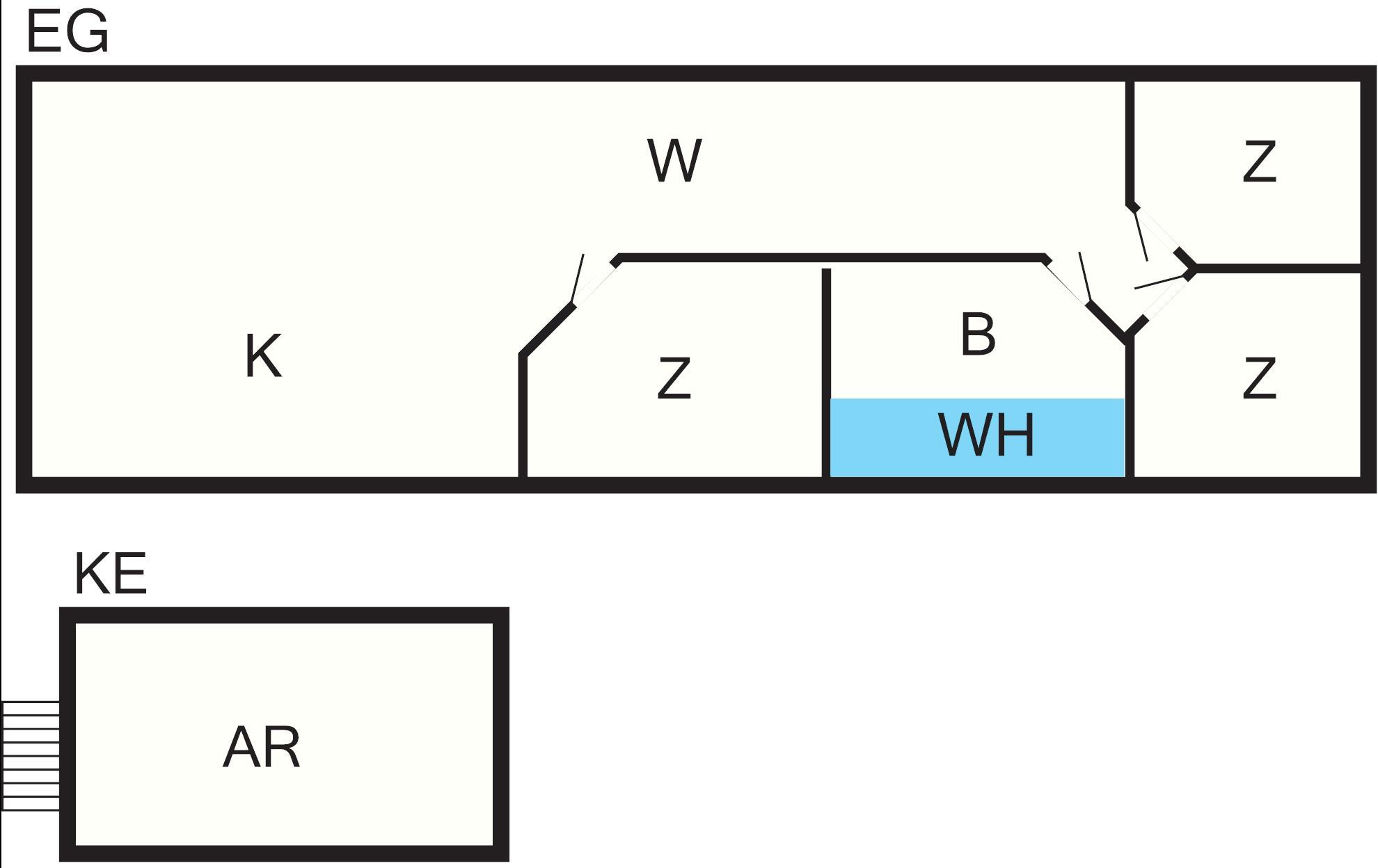Bad: WC, Waschb., Dusche, Fußbodenheiz.
