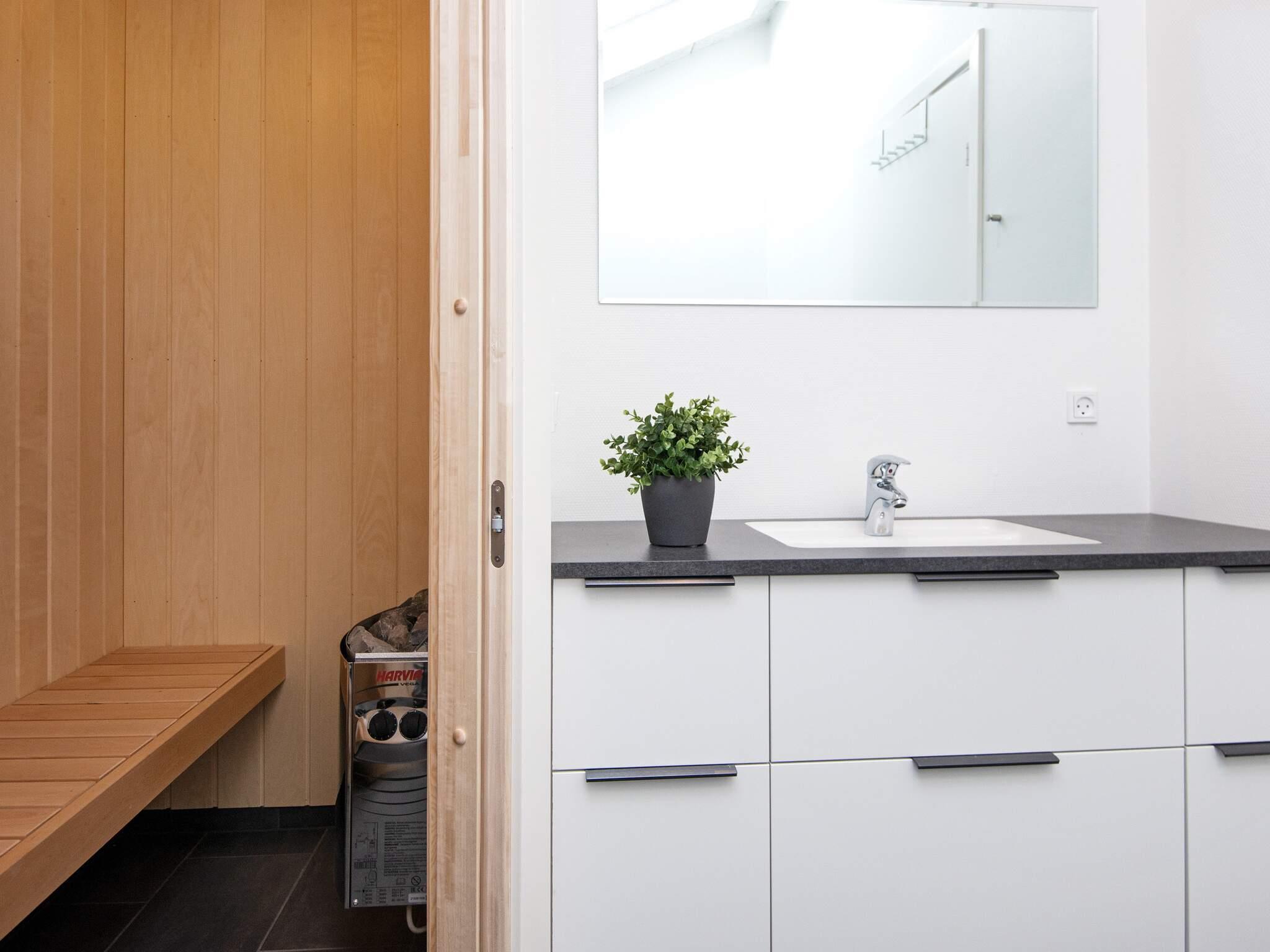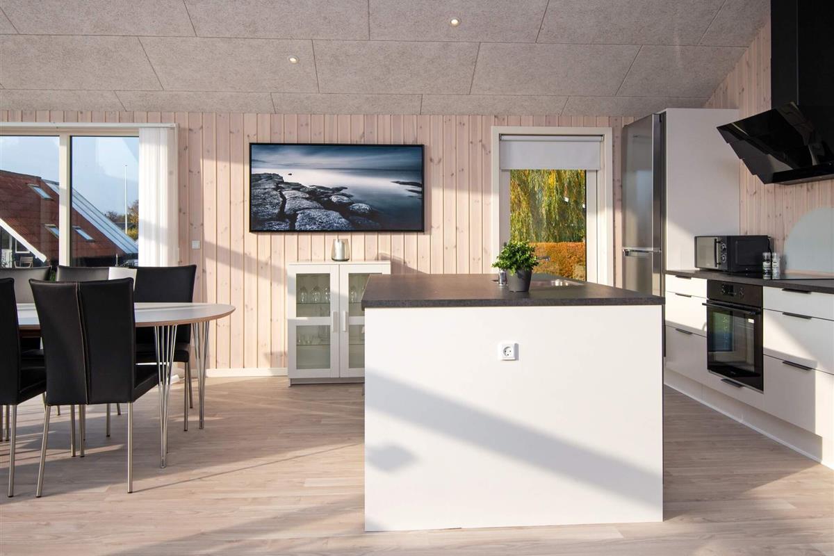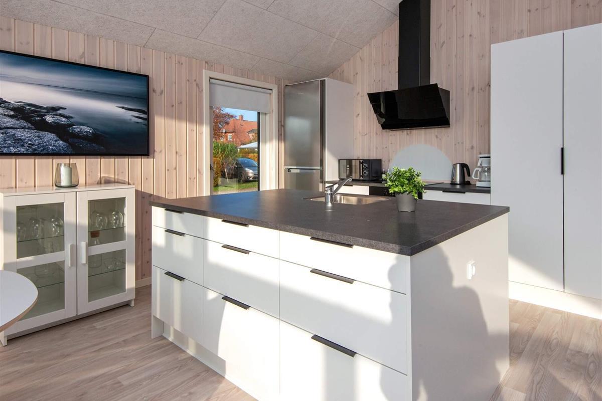 Gäste können im Badezimmer entspannen, das sowohl über einen wohltuenden Whirlpool als auch eine Sauna verfügt und so Wellness und Entspannung bietet, ohne das Haus verlassen zu müssen. Das Herzstück des Hauses ist der offene Küchen- und Wohnbereich mit Ess- und Sitzecke, wo die ganze Familie zum Essen, Spielen oder für ruhige Fernsehabende zusammenkommen kann. Große Fenster schaffen eine helle und einladende Atmosphäre und bieten direkten Zugang zur großzügigen Terrasse, die fast das gesamte Haus umgibt. Ausgestattet mit Gartenmöbeln lädt sie zum Grillen, Sonnenbaden oder einfach zum Genießen der frischen Küstenluft ein.