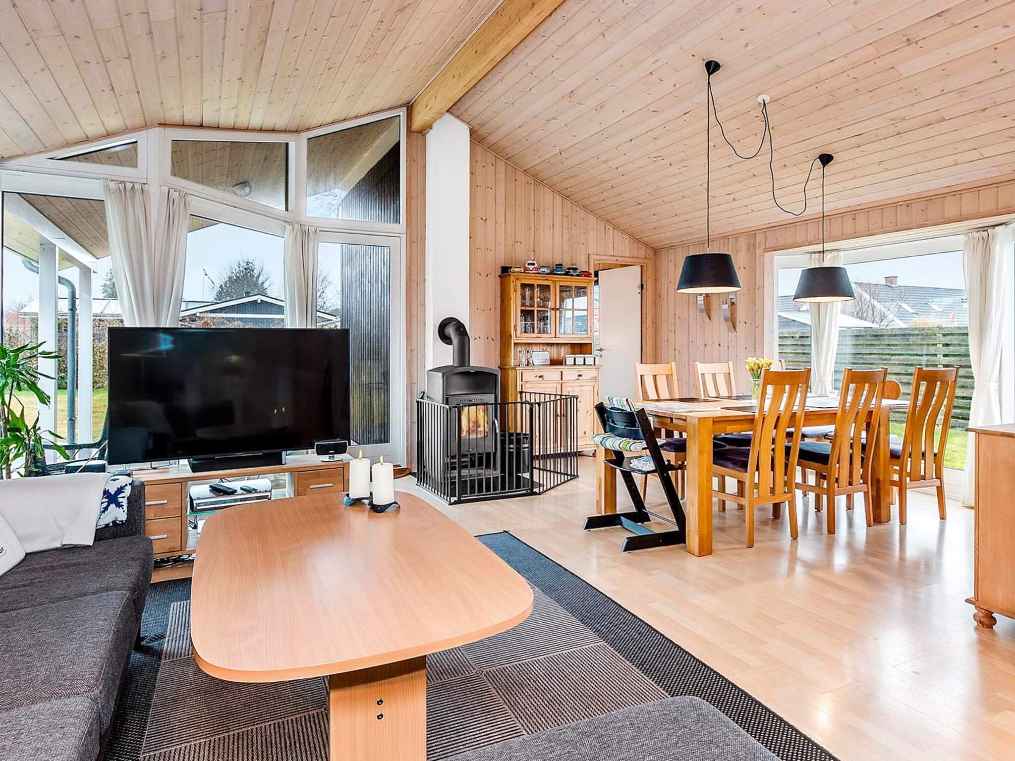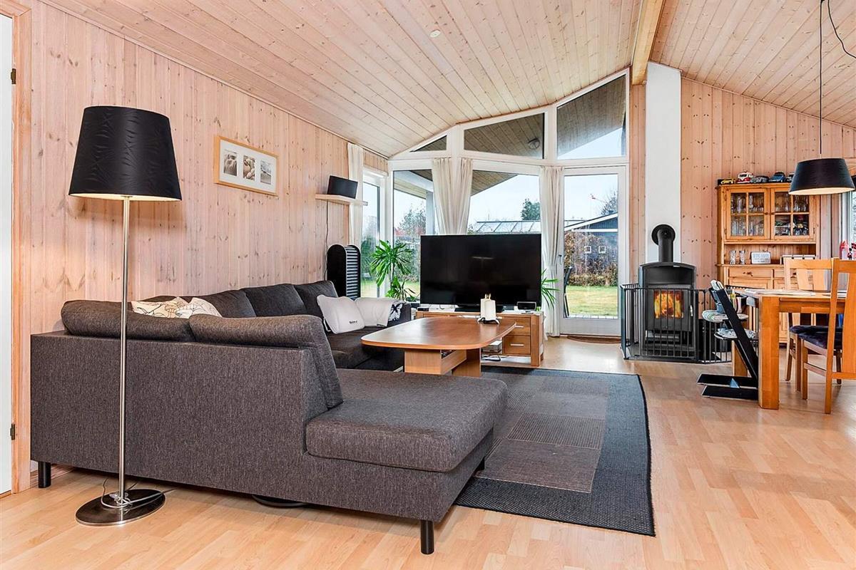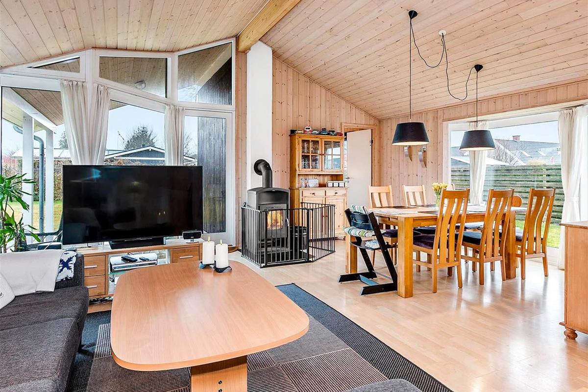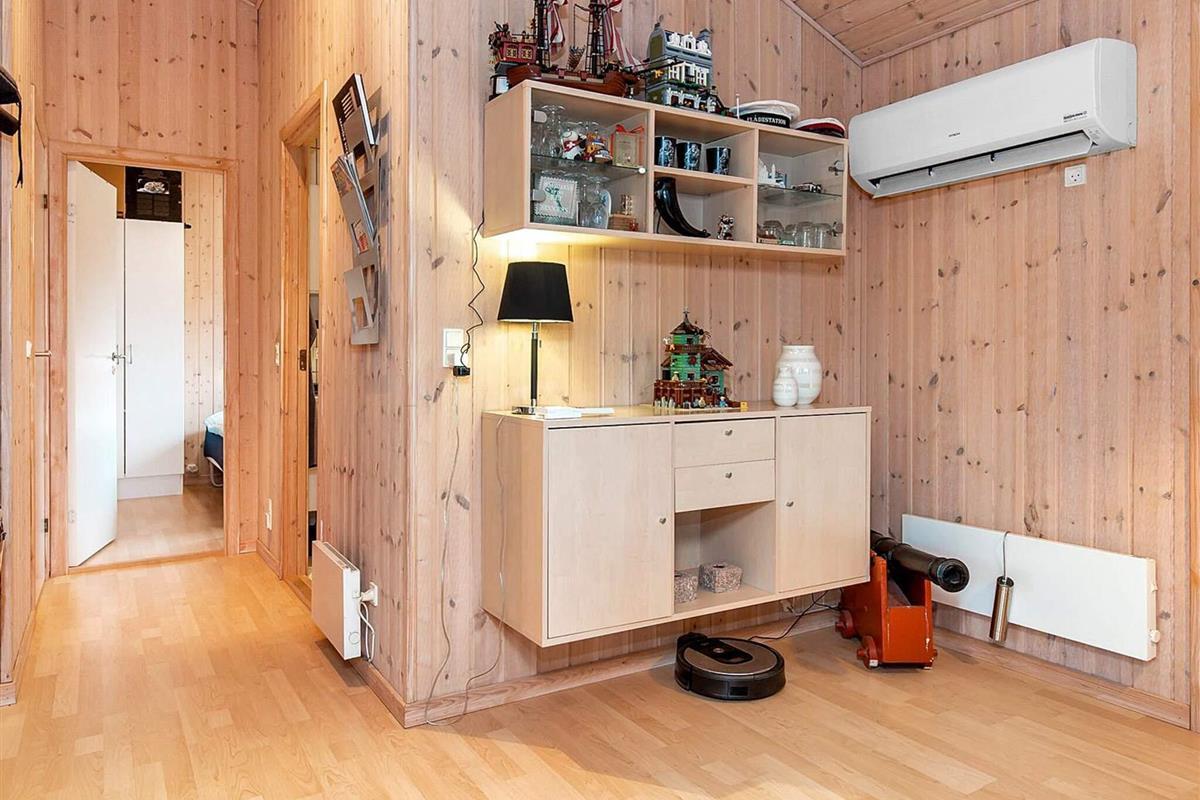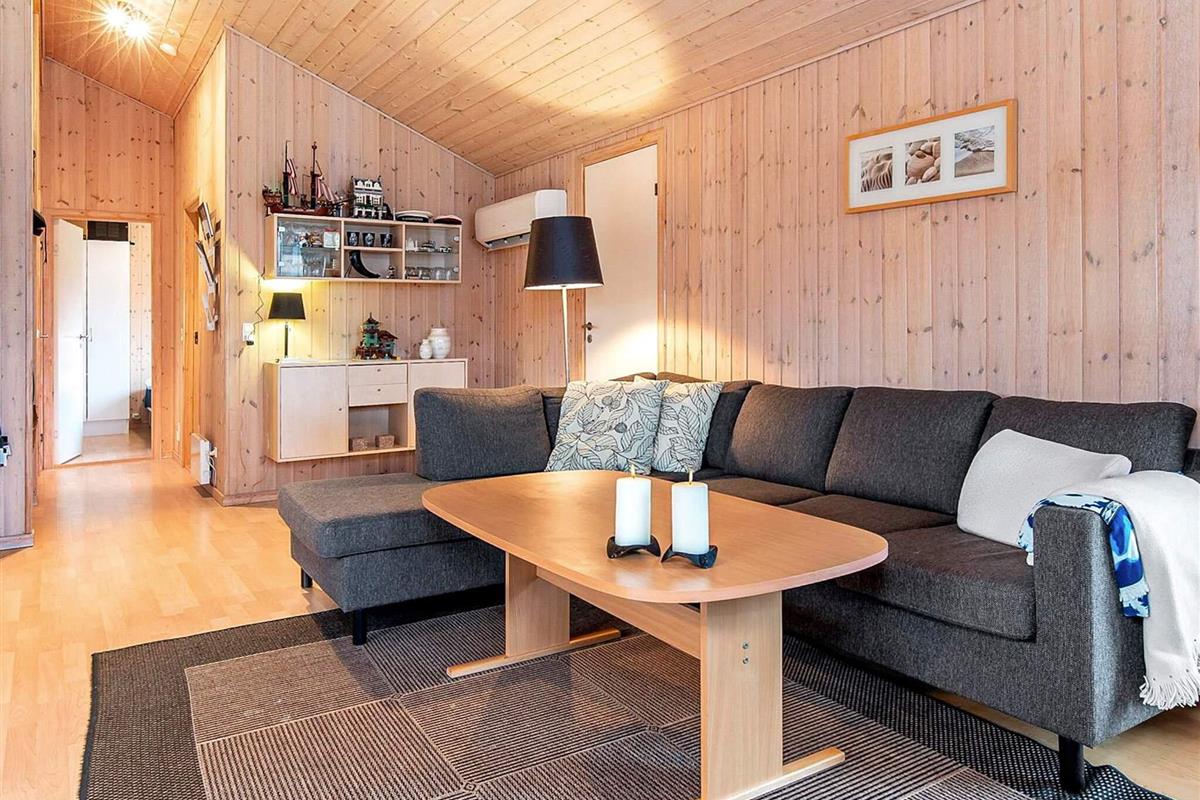 Nur einen kurzen Spaziergang vom Sandstrand von Høll entfernt, ist dieses Ferienhaus der Ort, an dem Familienerinnerungen entstehen. Die entspannte Lage, umgeben von viel Grün, wirkt friedlich und einladend, während sich die kinderfreundliche Rasenfläche im Freien schnell in einen Spielplatz zum Lachen und Spielen verwandelt. Drinnen öffnet sich das gemütliche Wohnzimmer direkt zur Terrasse und zum Garten, sodass der Übergang zwischen sonnigen Morgenstunden im Freien und ruhigen Abenden im Haus leicht fällt. Ob beim Frühstück an der frischen Luft oder beim Zuschauen, wie die Kinder einem Ball über den Rasen hinterherjagen – hier verläuft das Leben in einem gemächlichen Tempo.
