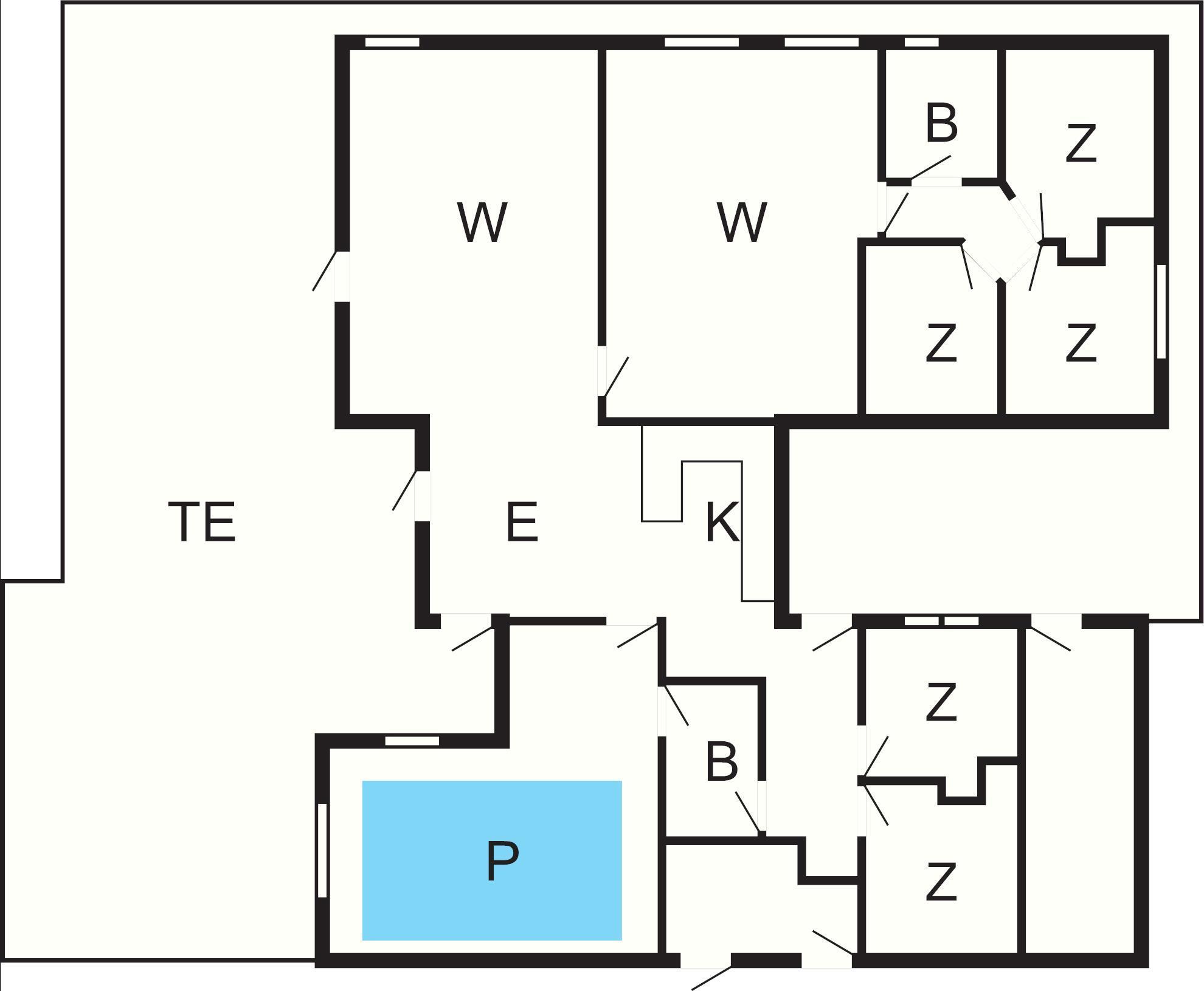 Das Ferienhaus verfügt über zwei Schlafbereiche mit jeweils einem Badezimmer. Es gibt fünf Schlafzimmer und vier weitere Schlafplätze im Dachgeschoss, das bei Kindern und Jugendlichen sehr beliebt ist.