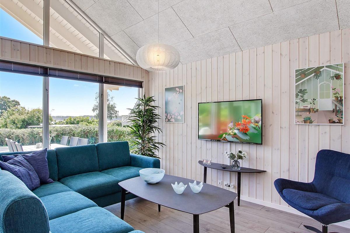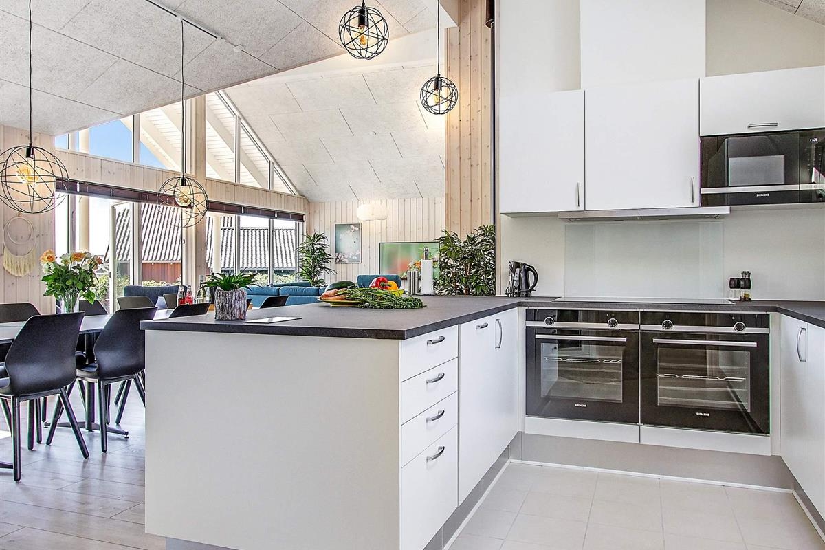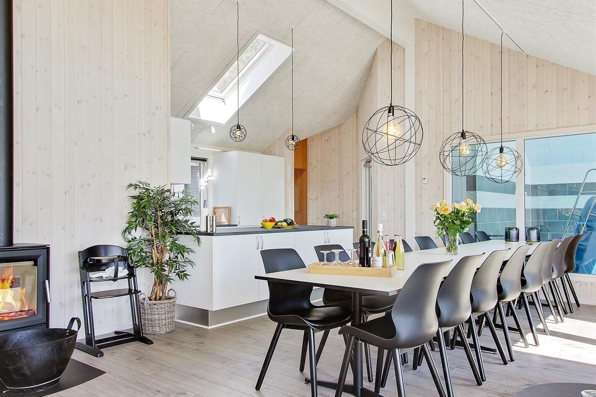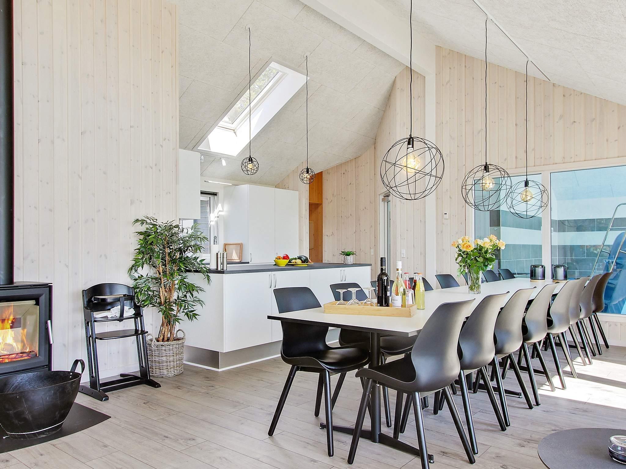 Der Wohnraum mit Essplatz ist geschmackvoll eingerichtet und verfügt u.a. über Stereoanlage, TV, Blu-ray-Spieler, Kinderhochstuhl, Sofagruppe und Kaminofen. In der durchdachten Küche gibt es einen großen Kühlschrank, einen Gefrierschrank, sowie je zwei Spülmaschinen und Herde.