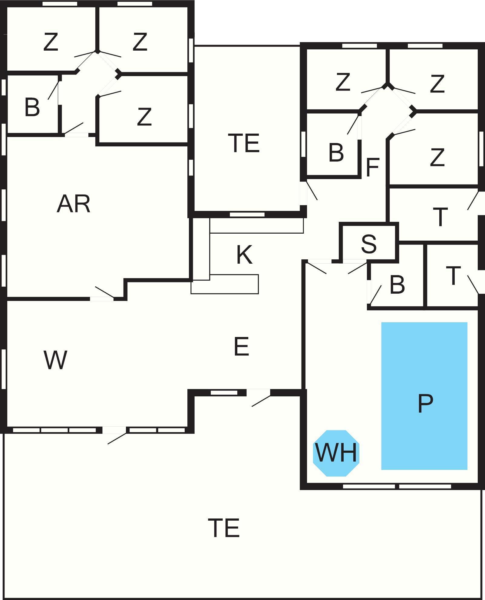 Das Haus ist gut dimensioniert. An beiden Enden des Hauses gibt es einen Schlafbereich mit je drei Schlafzimmern und einem Bad. Das dritte Bad befindet sich im Poolraum. Weiterhin gibt es einen Hems mit vier Schlafplätzen, die vor allem bei Kindern beliebt sind.