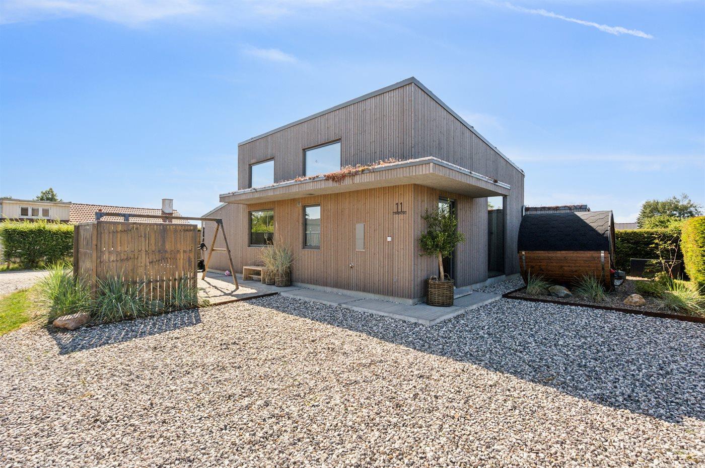 Modern vakantiehuis met duurzame voorzieningen, vlakbij zee en speelplezier buiten.