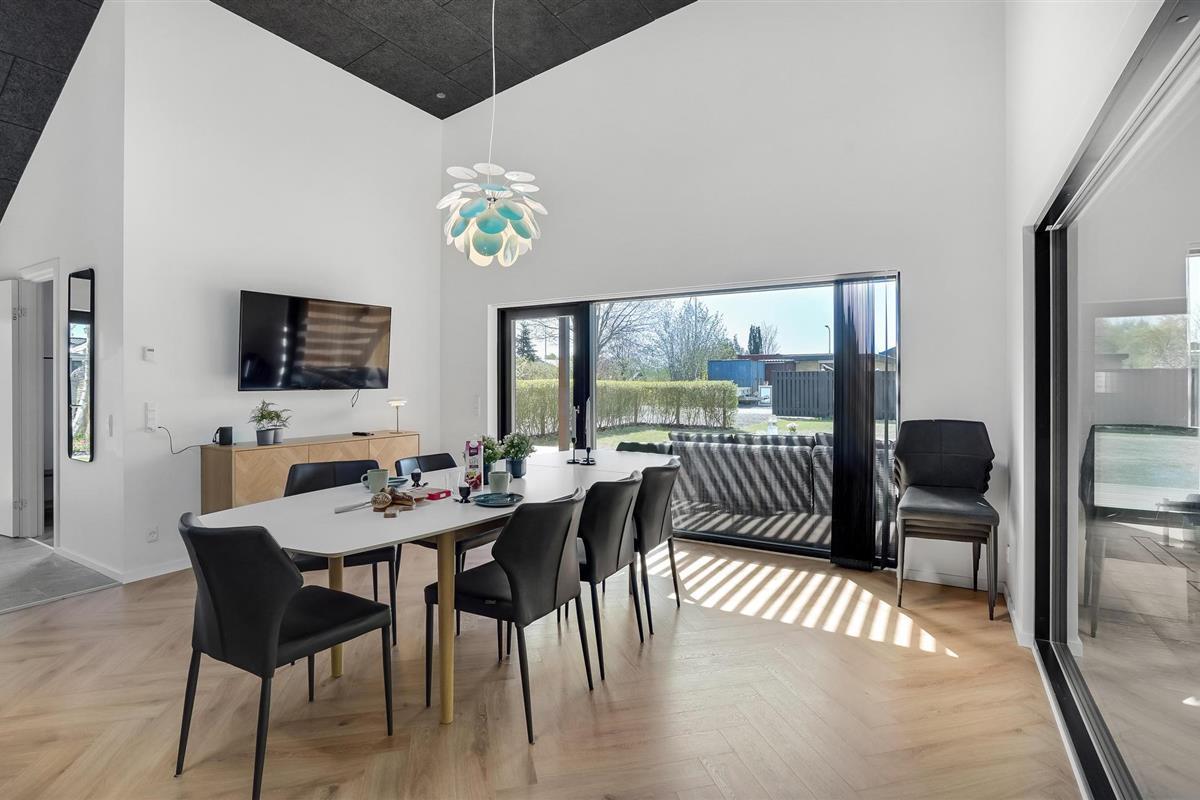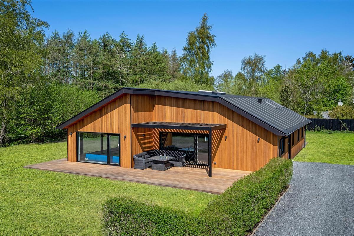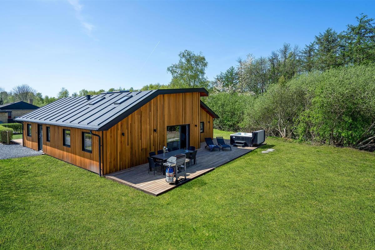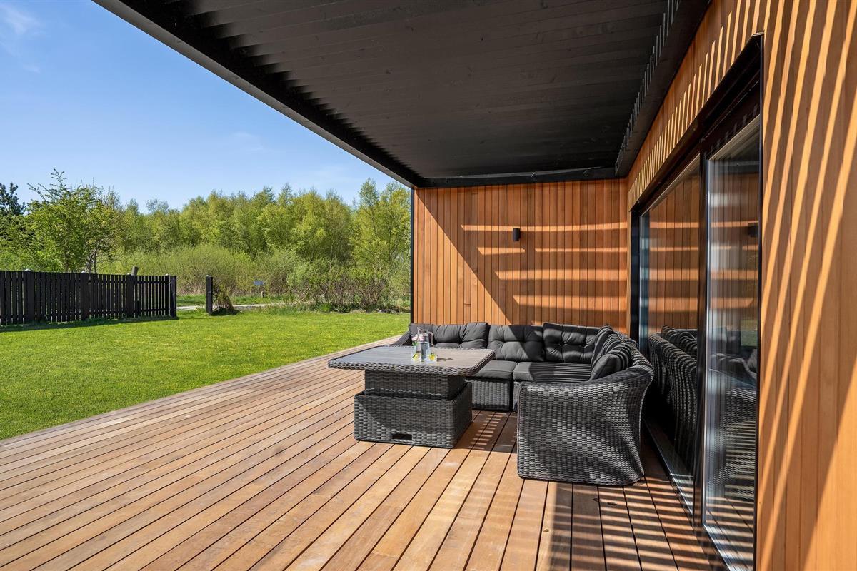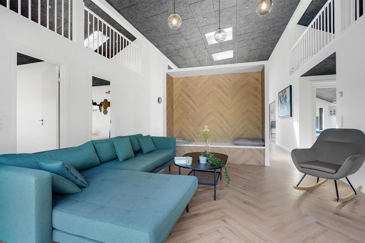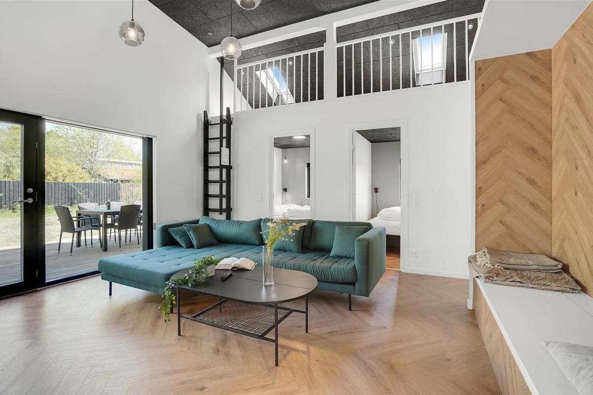 Modern vakantiehuis met luxe inrichting nabij Vejle Fjord en privéterras, ideaal voor ontspannen en watersport.
