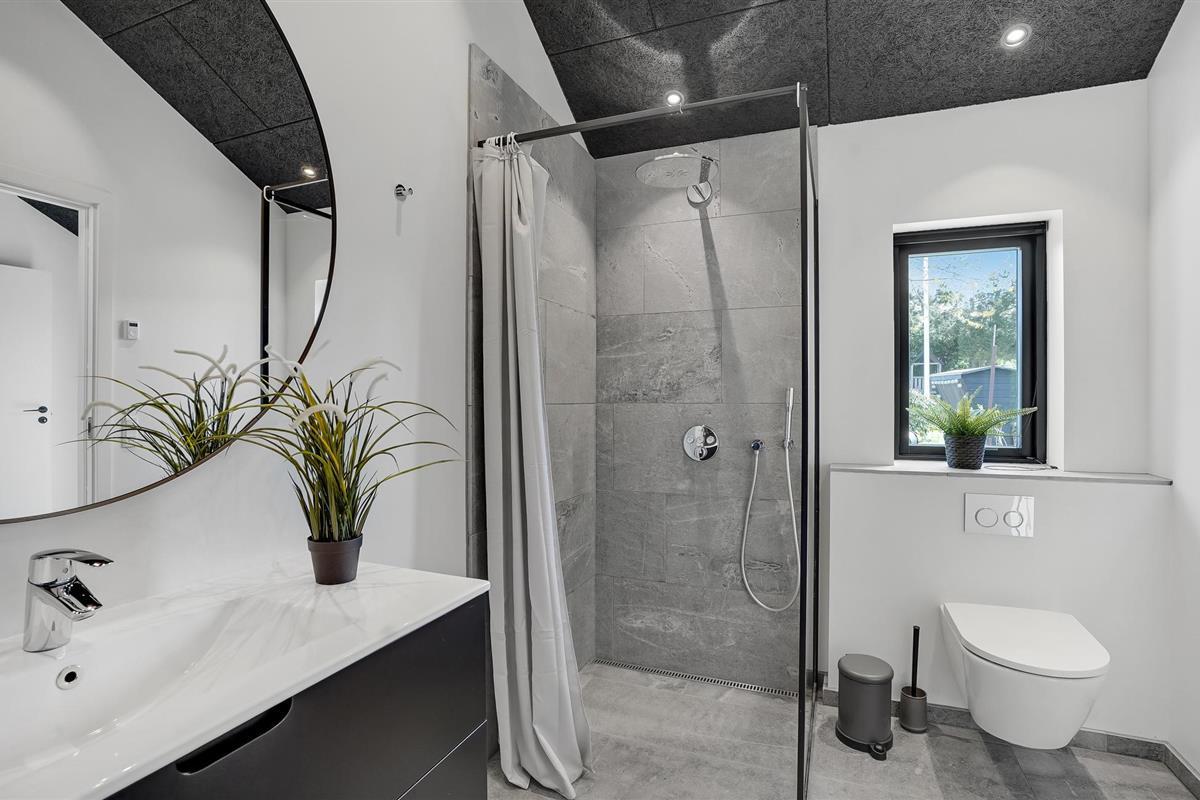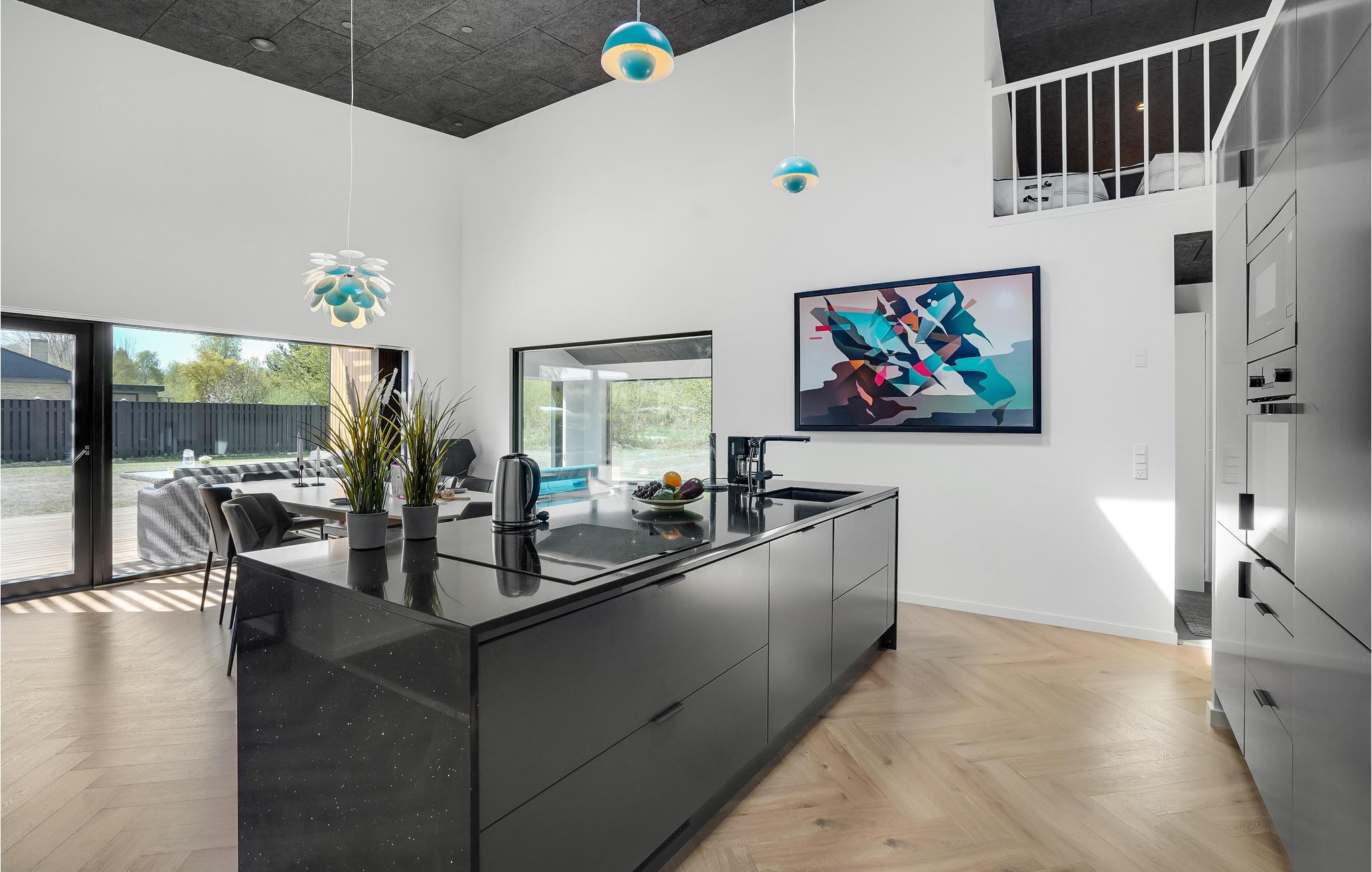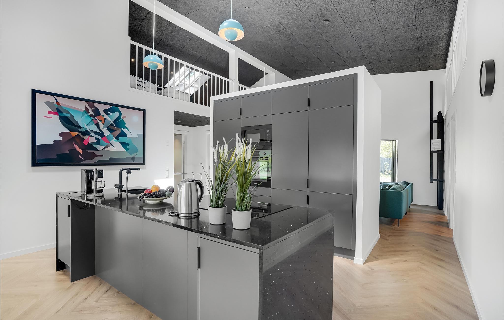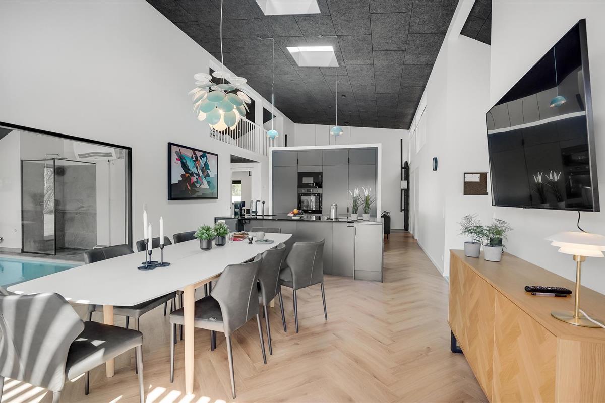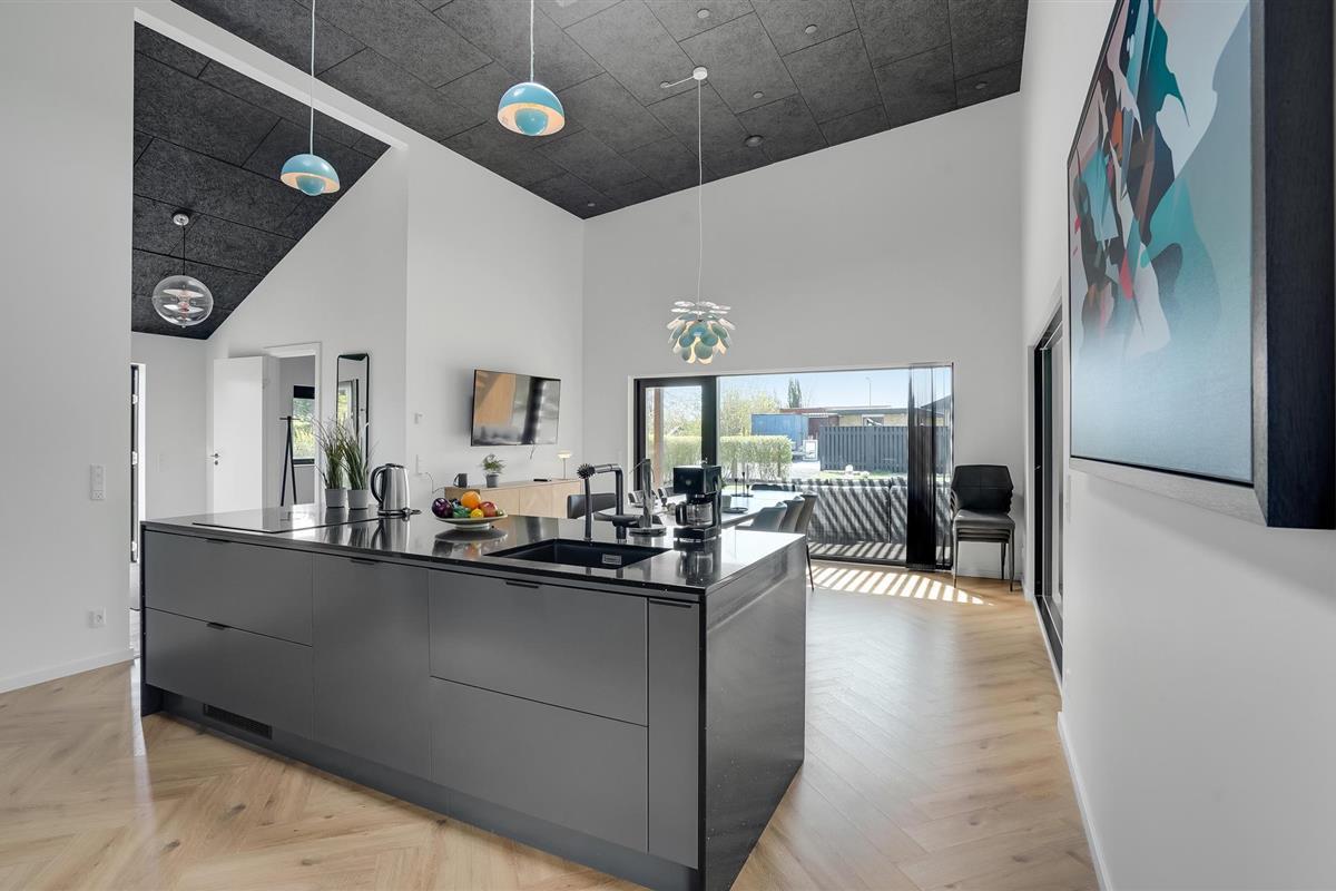 Modern vakantiehuis met luxe inrichting nabij Vejle Fjord en privéterras, ideaal voor ontspannen en watersport.