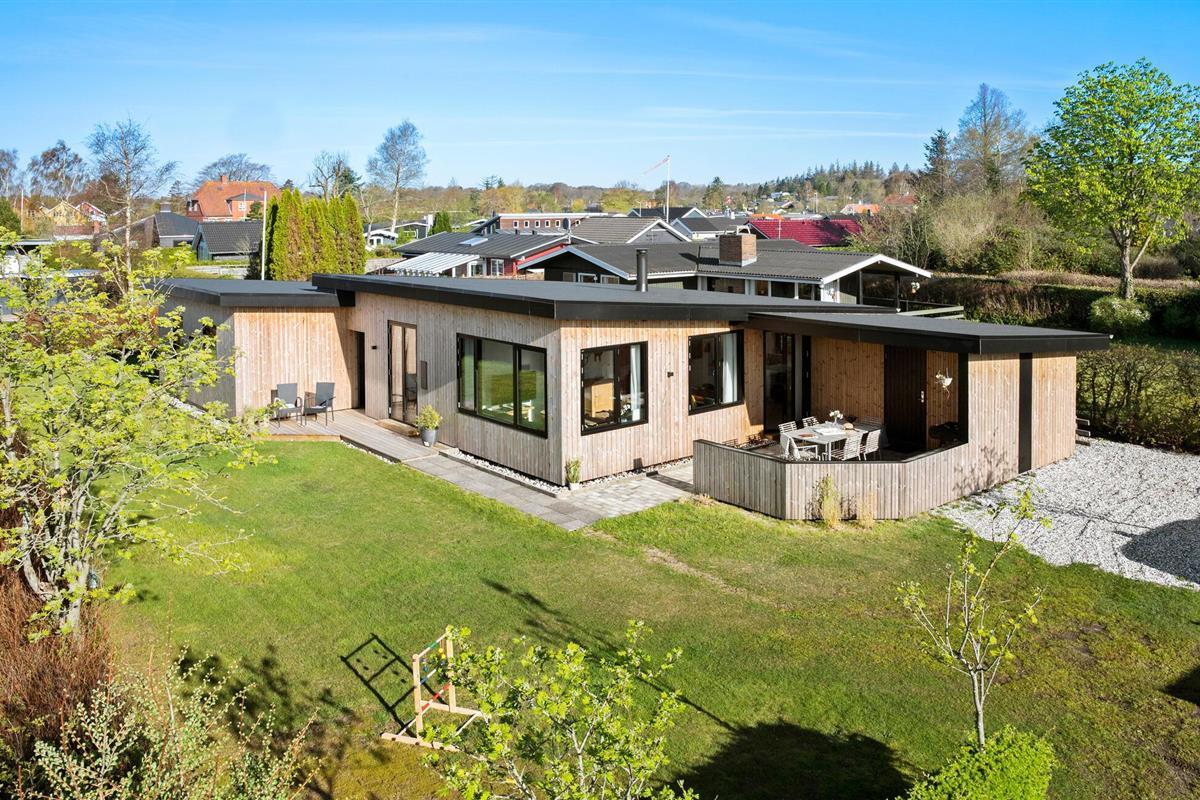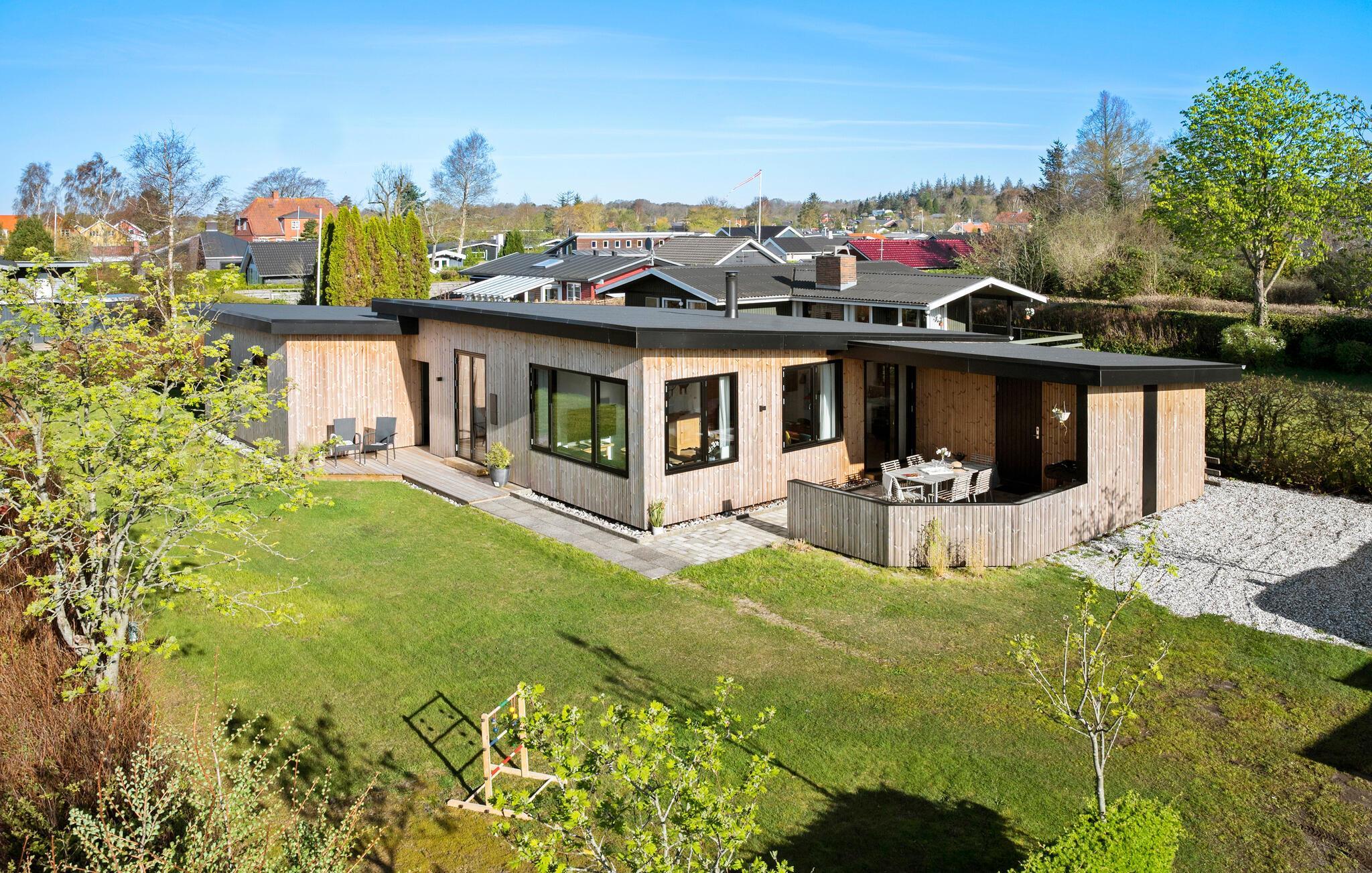 Stijlvol vakantiehuis aan Vejle Fjord met twee terrassen en strand dichtbij.