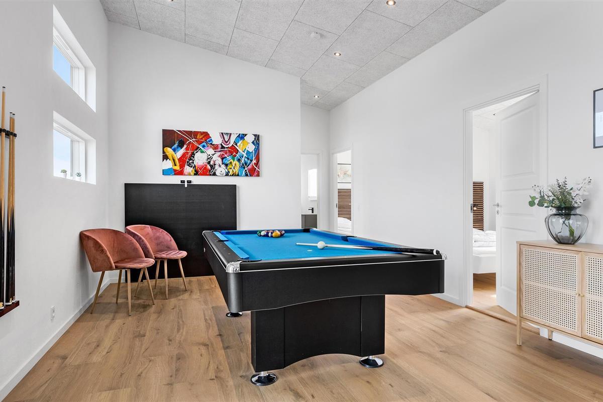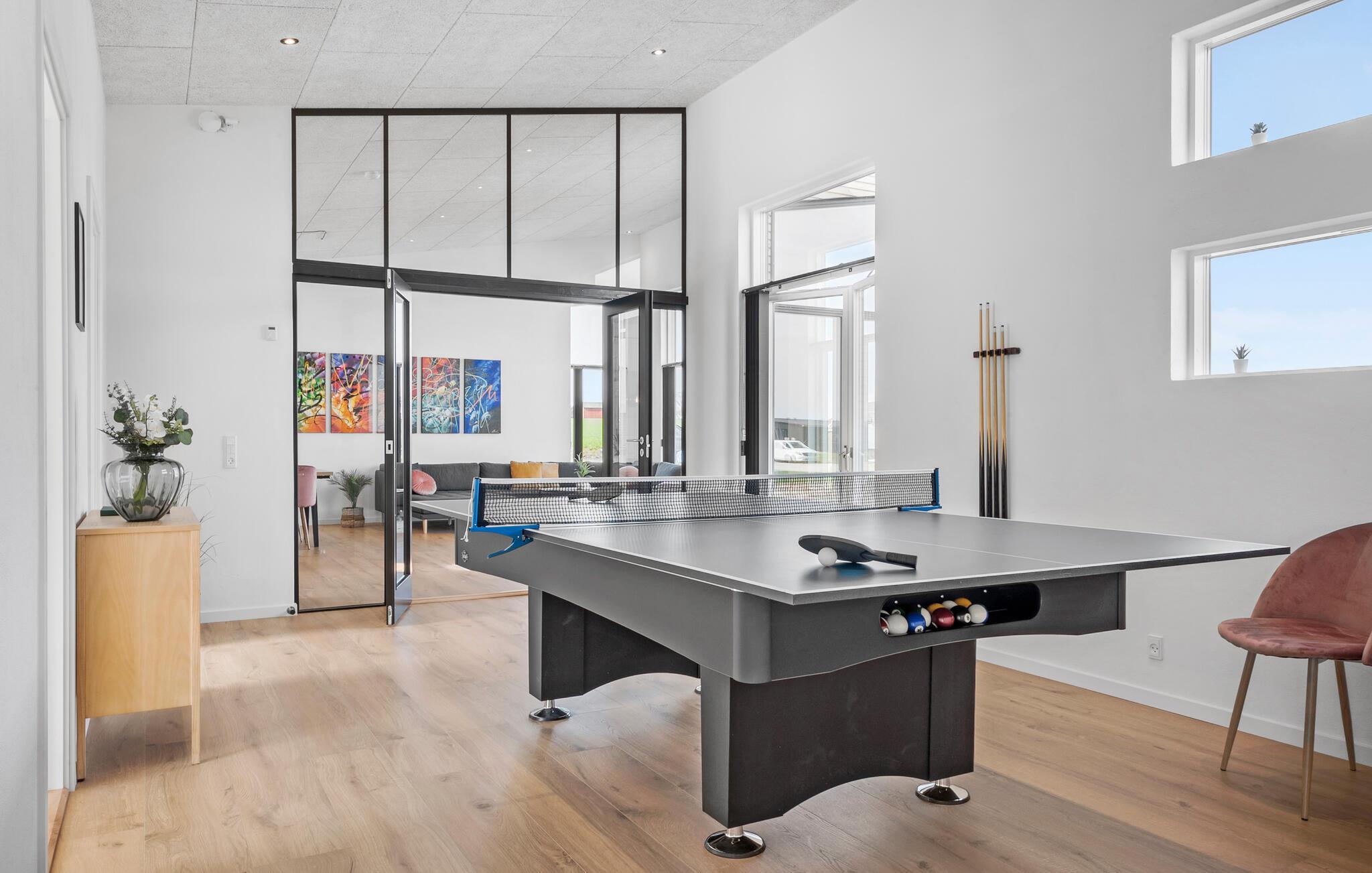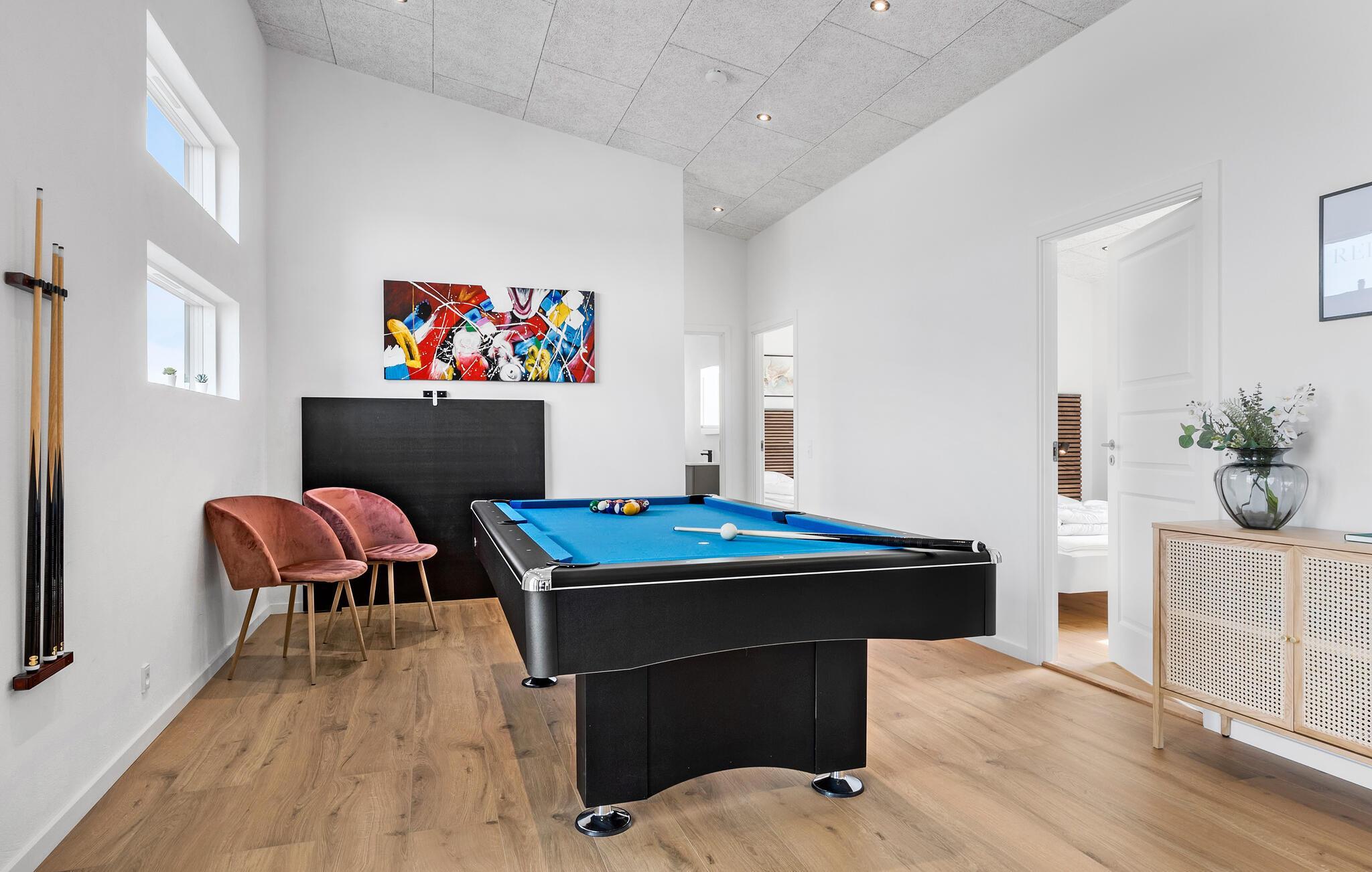 Welkom bij Mørkholt Strand en dit moderne, ruime en hoogwaardige vakantiehuis in Scandinavische stijl. Het huis is een paradijs voor meerdere gezinnen, die kunnen genieten van hun privacy en gezelligheid dankzij de vele, goed uitgeruste kamers. De grote ramen zorgen voor veel natuurlijk licht in de grote woonkamer met een open verbinding naar de keuken. Hier kun je gezellige filmavonden houden met familie of vrienden, je favoriete films streamen of genieten van een goede maaltijd in goed gezelschap. Je vindt ook entertainment in de activiteitenruimte met biljart/pool en tafeltennis, die je volop mogelijkheden biedt voor vrijetijdsactiviteiten tijdens je vakantie.