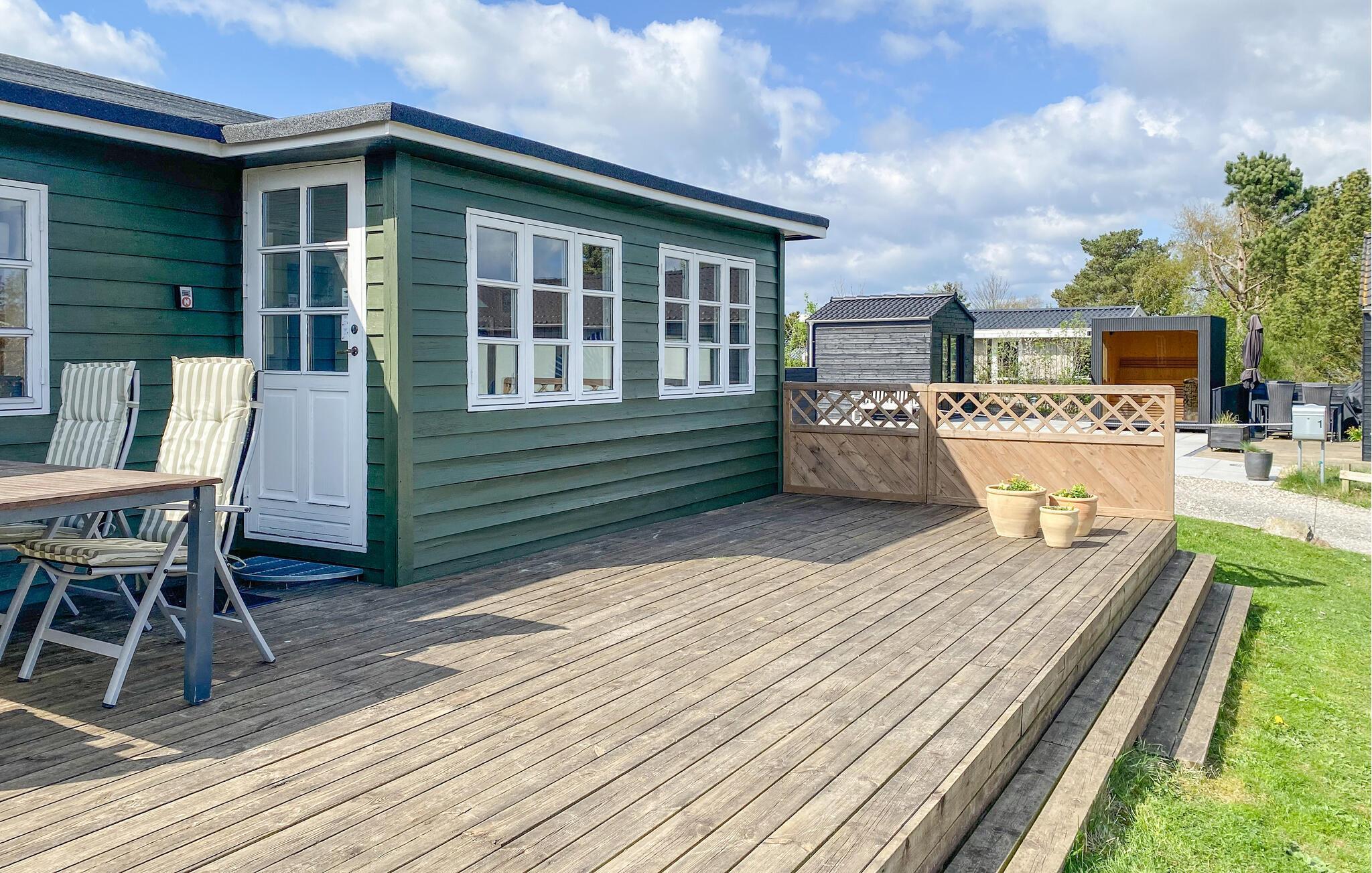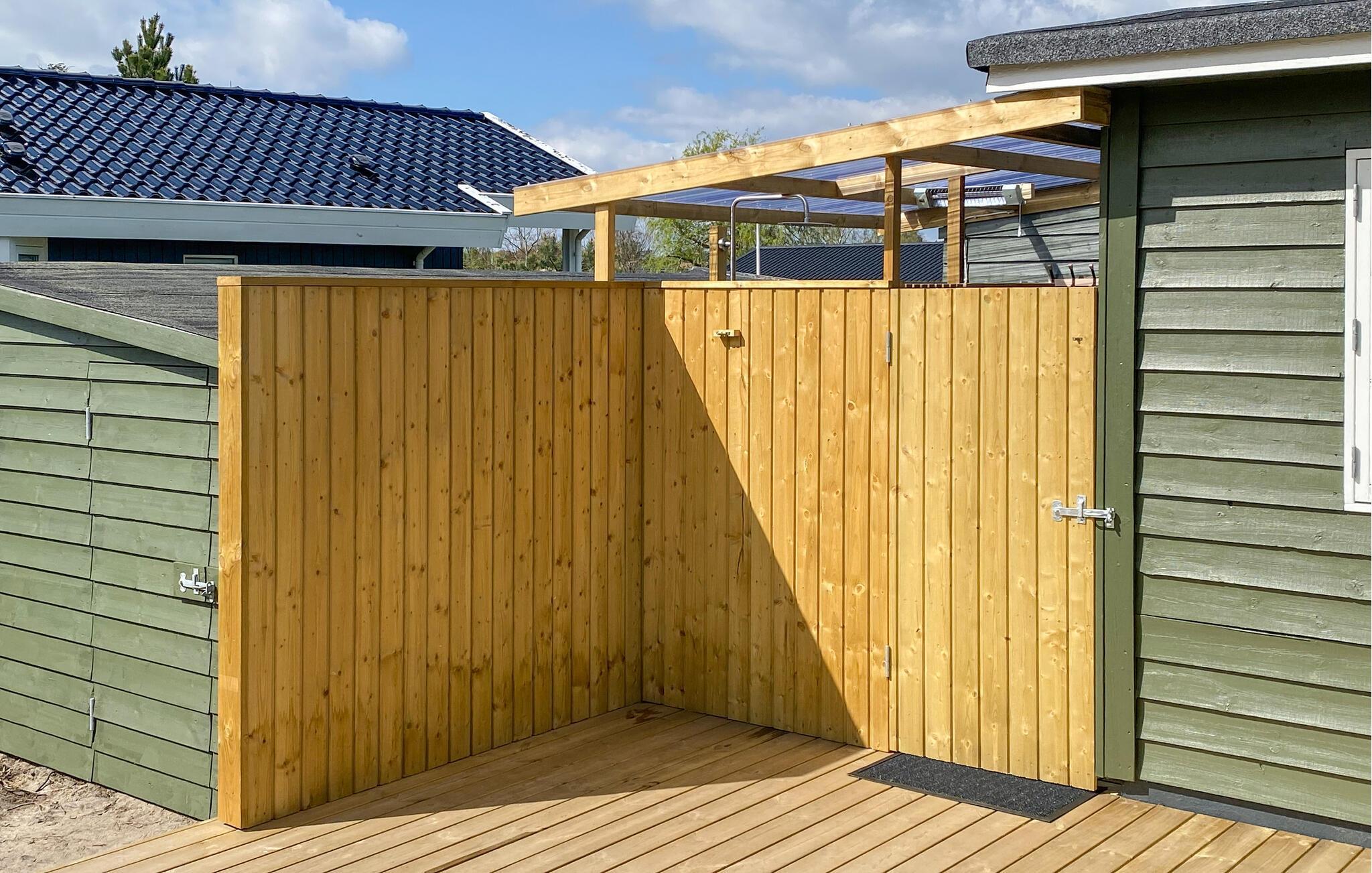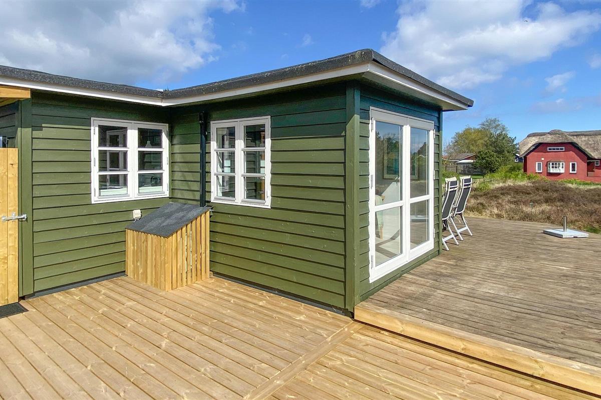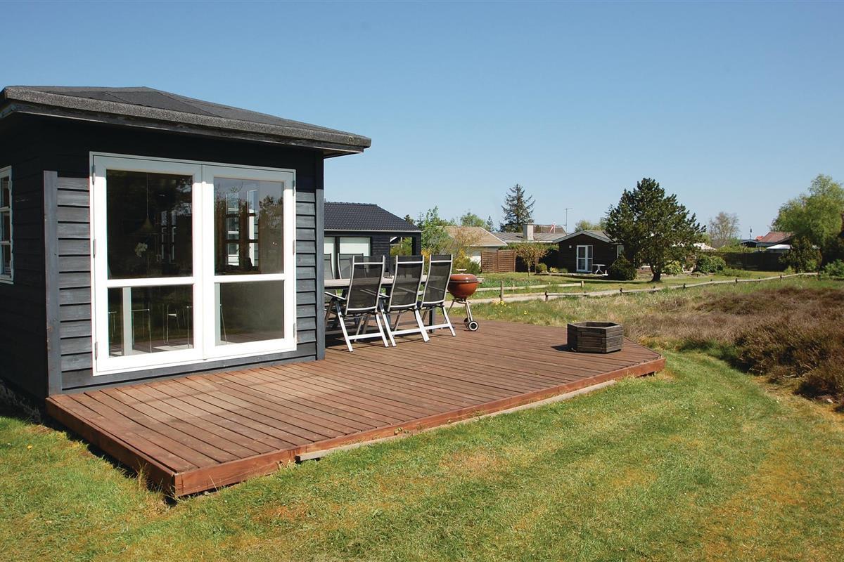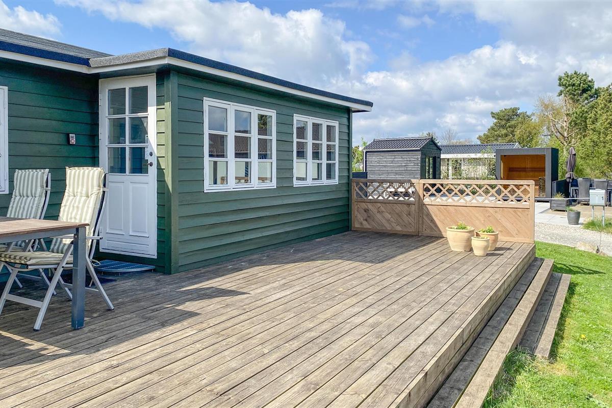 Gezellig houten vakantiehuis nabij Hvidbjerg Strand met groot terras, buitendouche en zeezicht, perfect voor een rustige familievakantie.