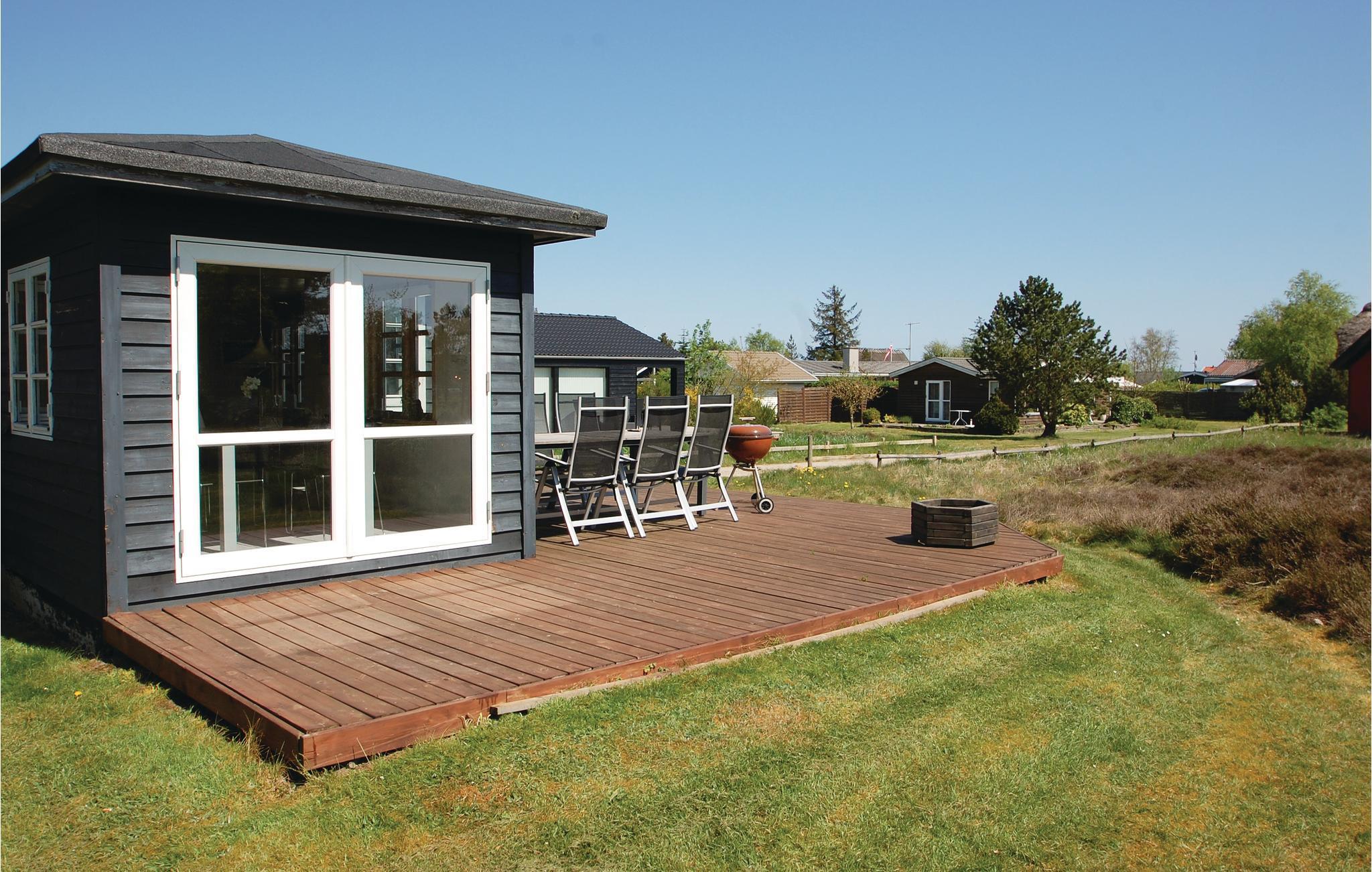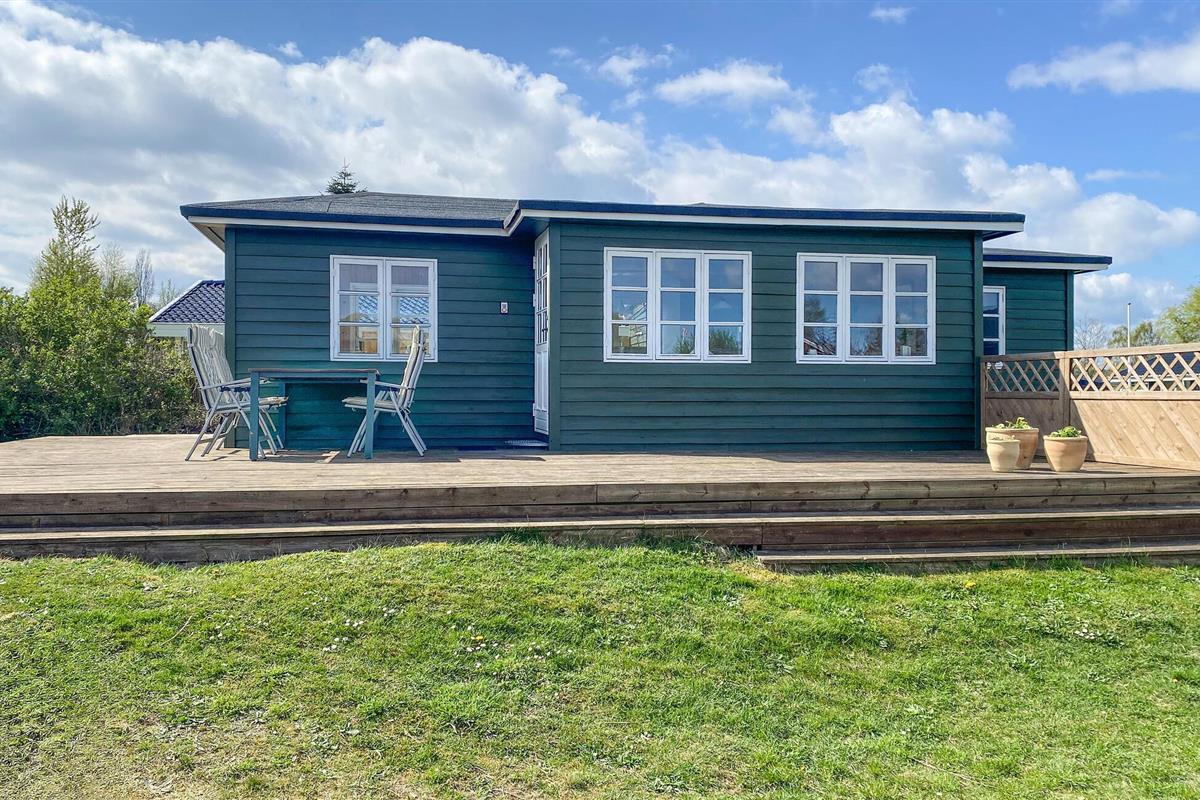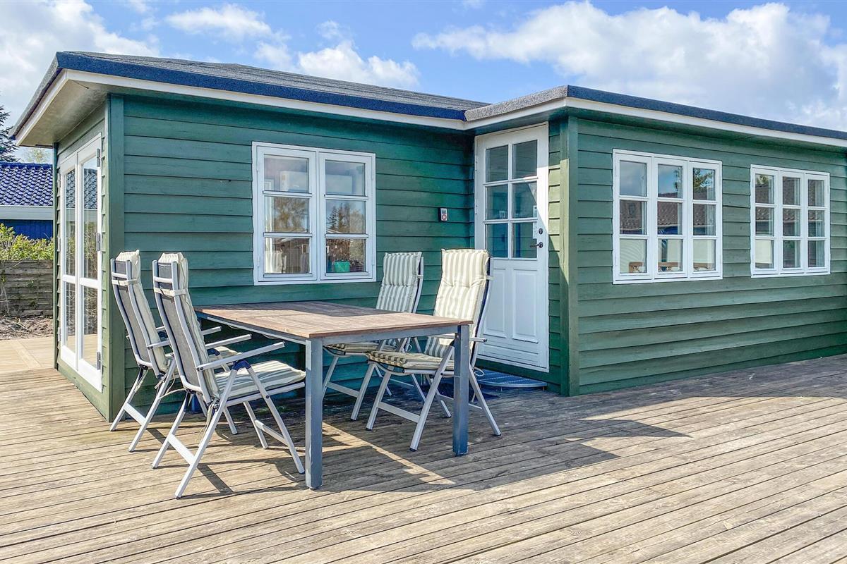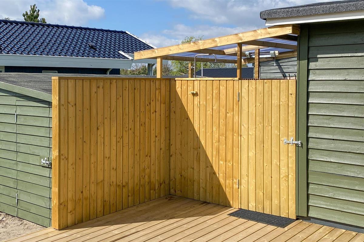 Gezellig houten vakantiehuis nabij Hvidbjerg Strand met groot terras, buitendouche en zeezicht, perfect voor een rustige familievakantie.