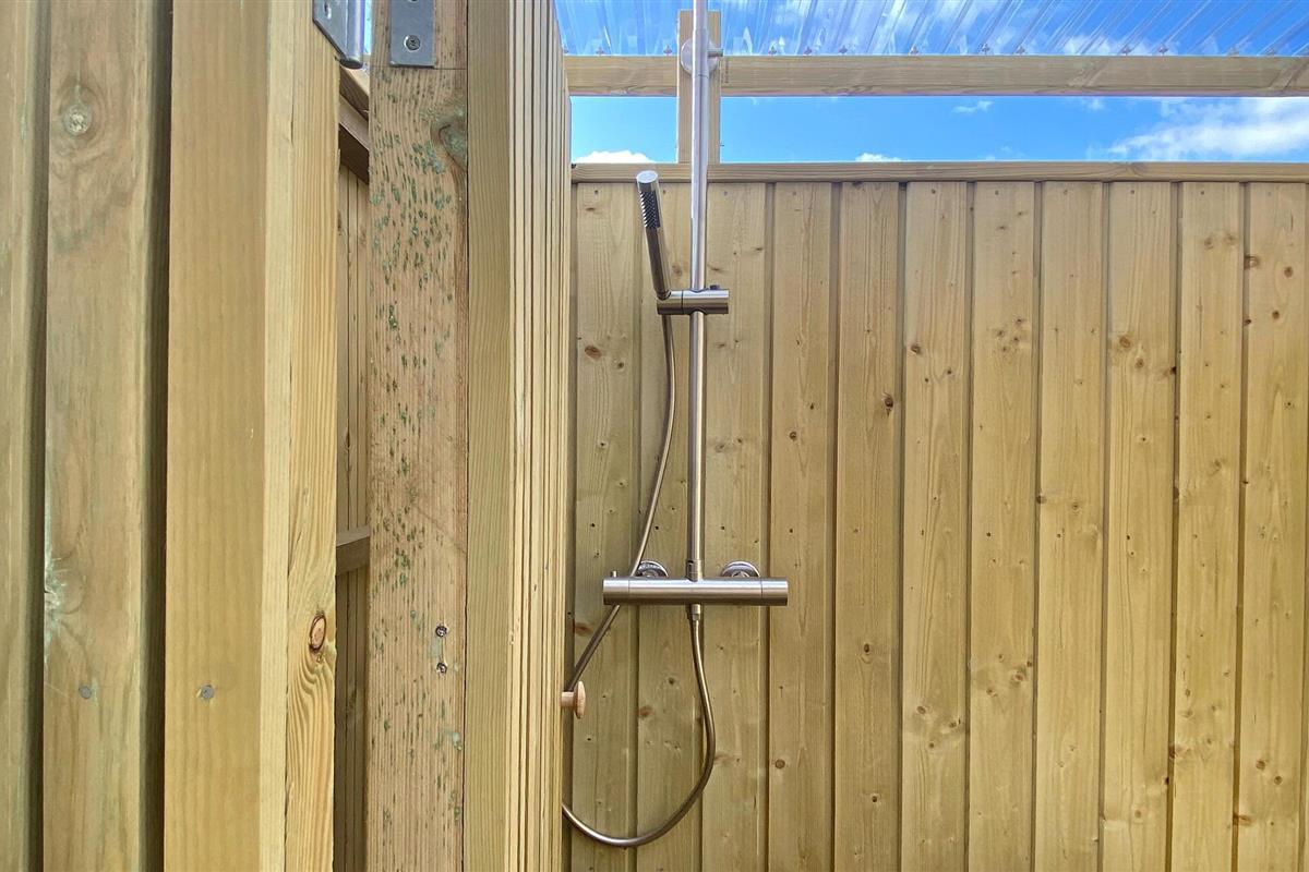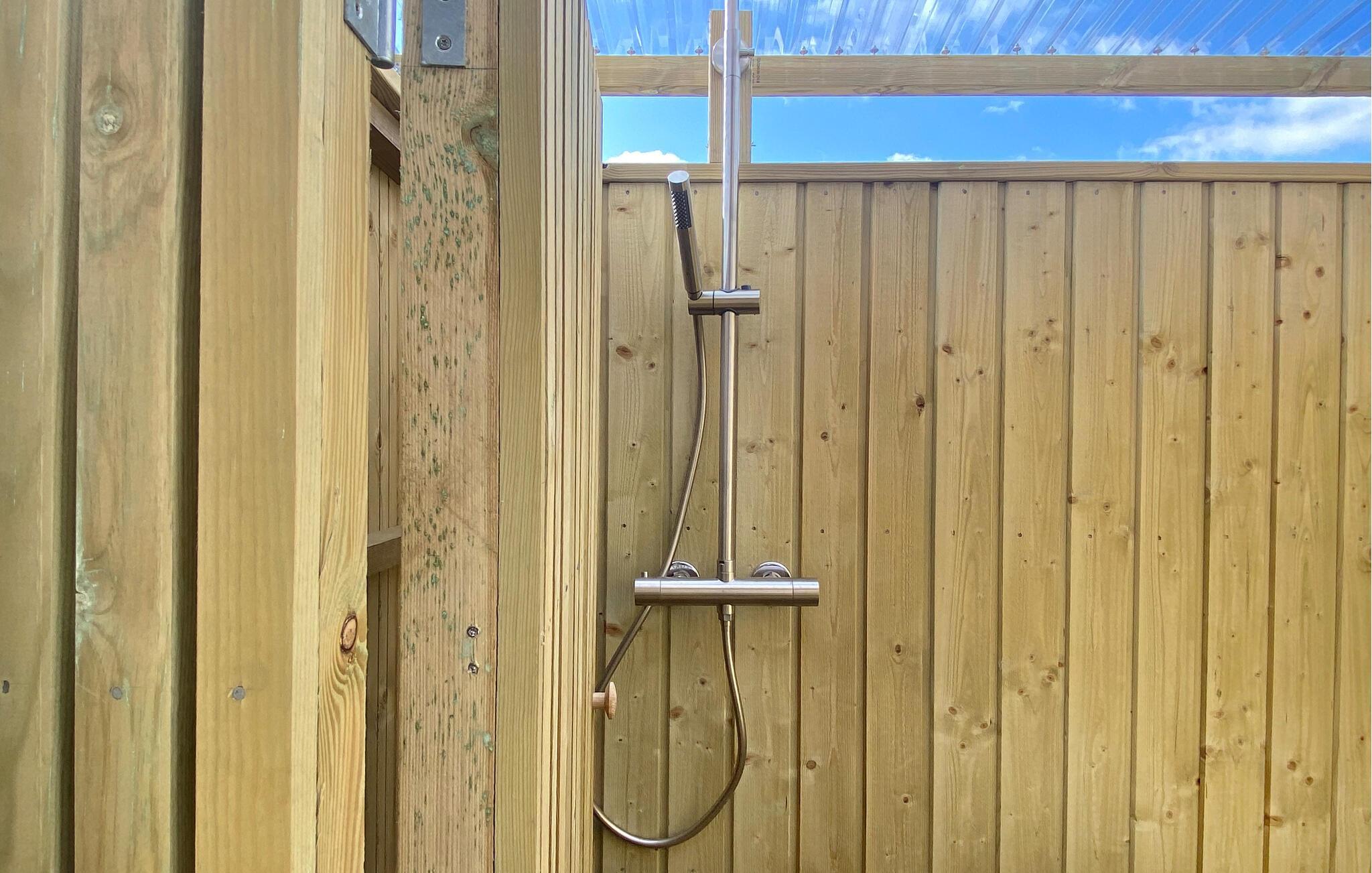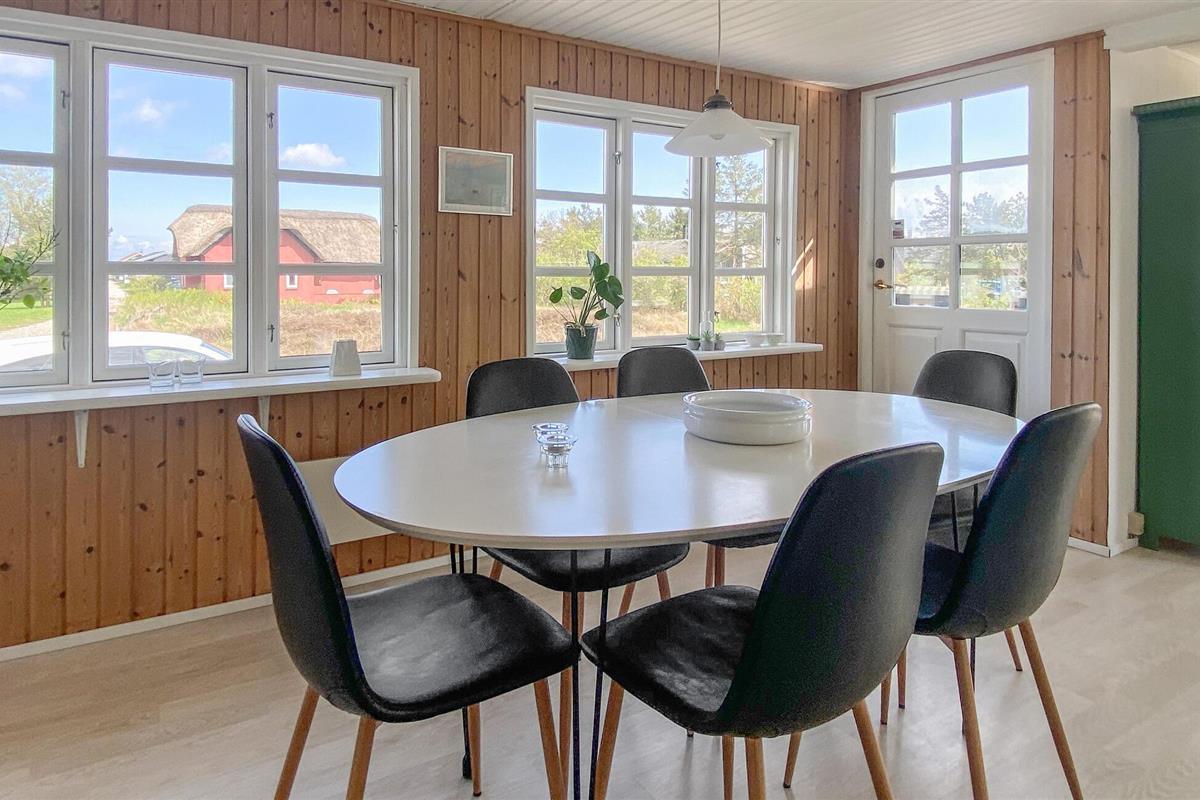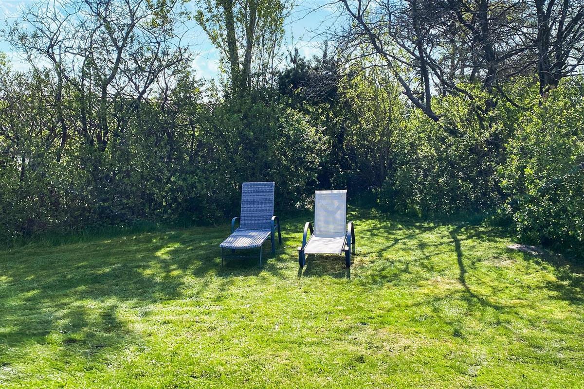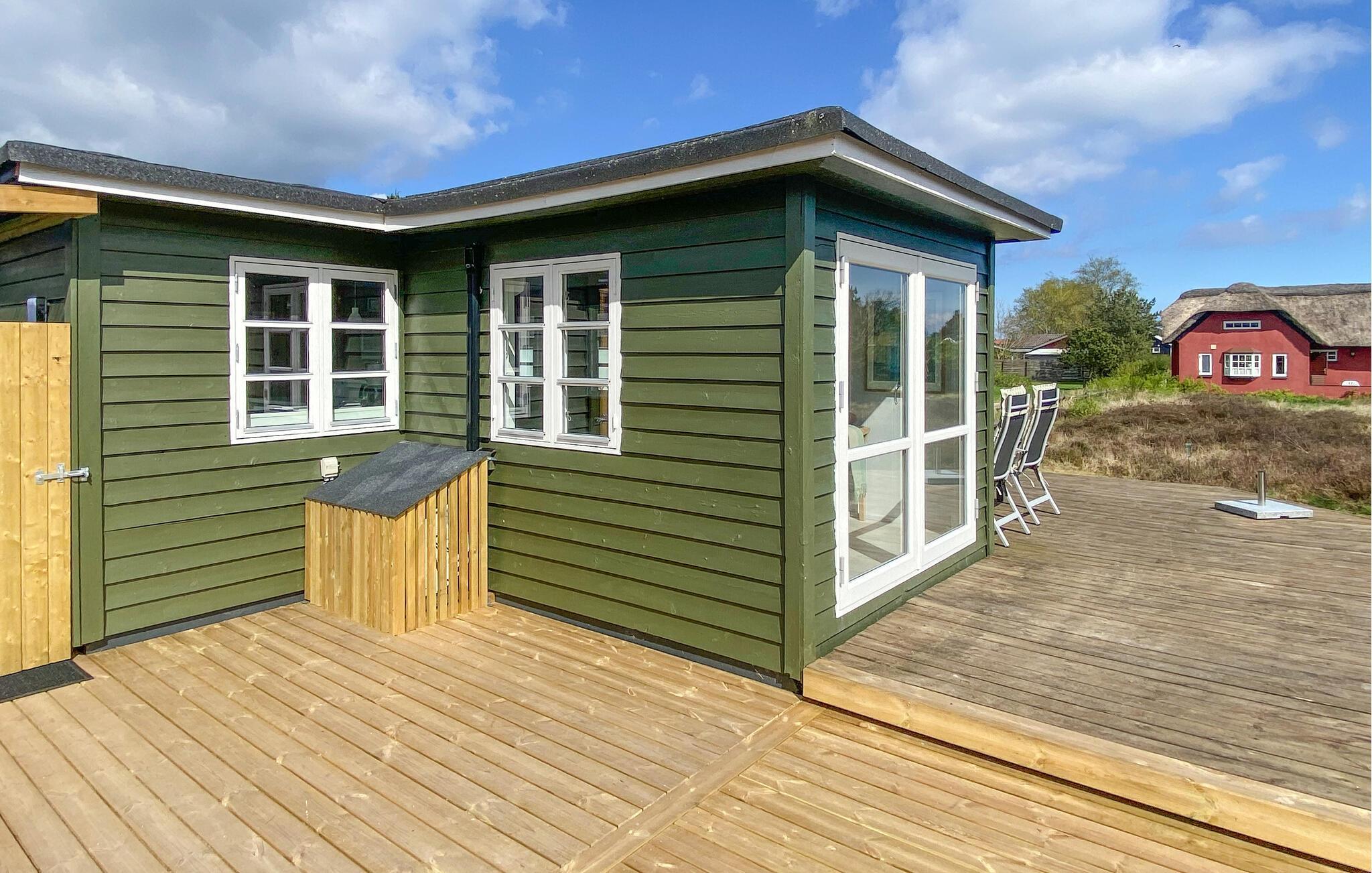 Gezellig houten vakantiehuis nabij Hvidbjerg Strand met groot terras, buitendouche en zeezicht, perfect voor een rustige familievakantie.