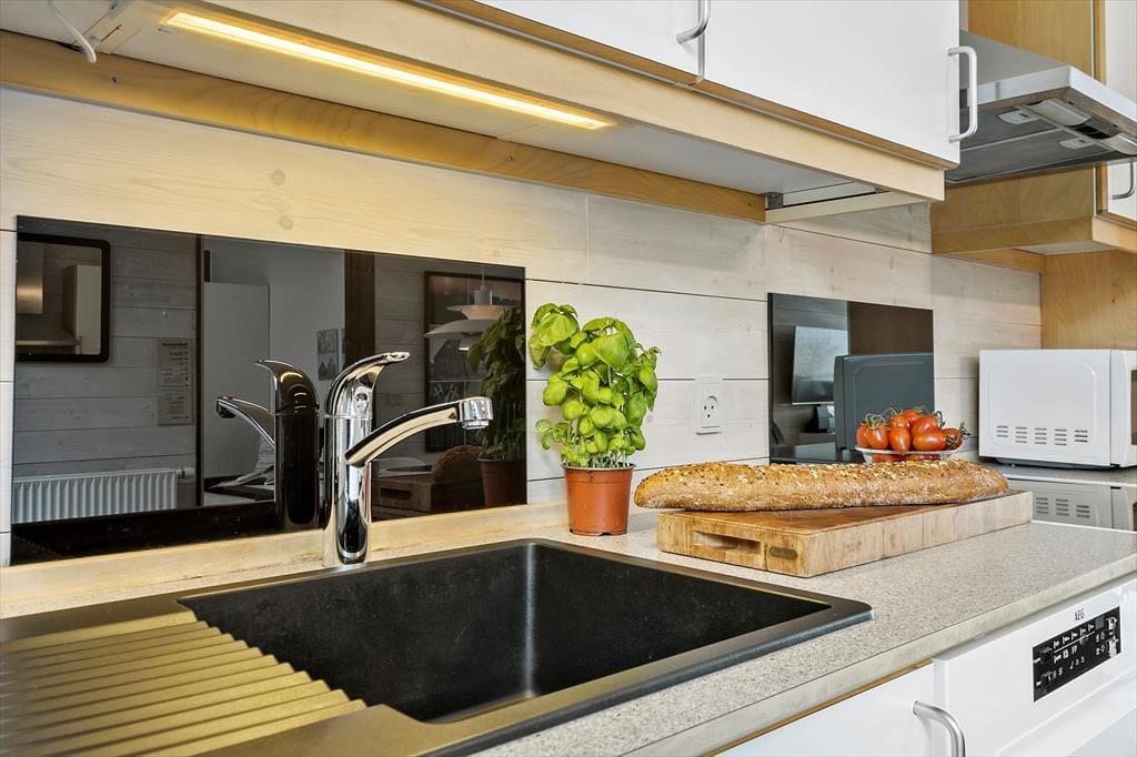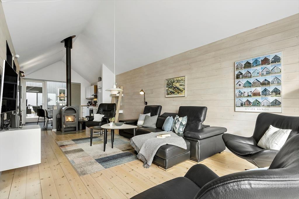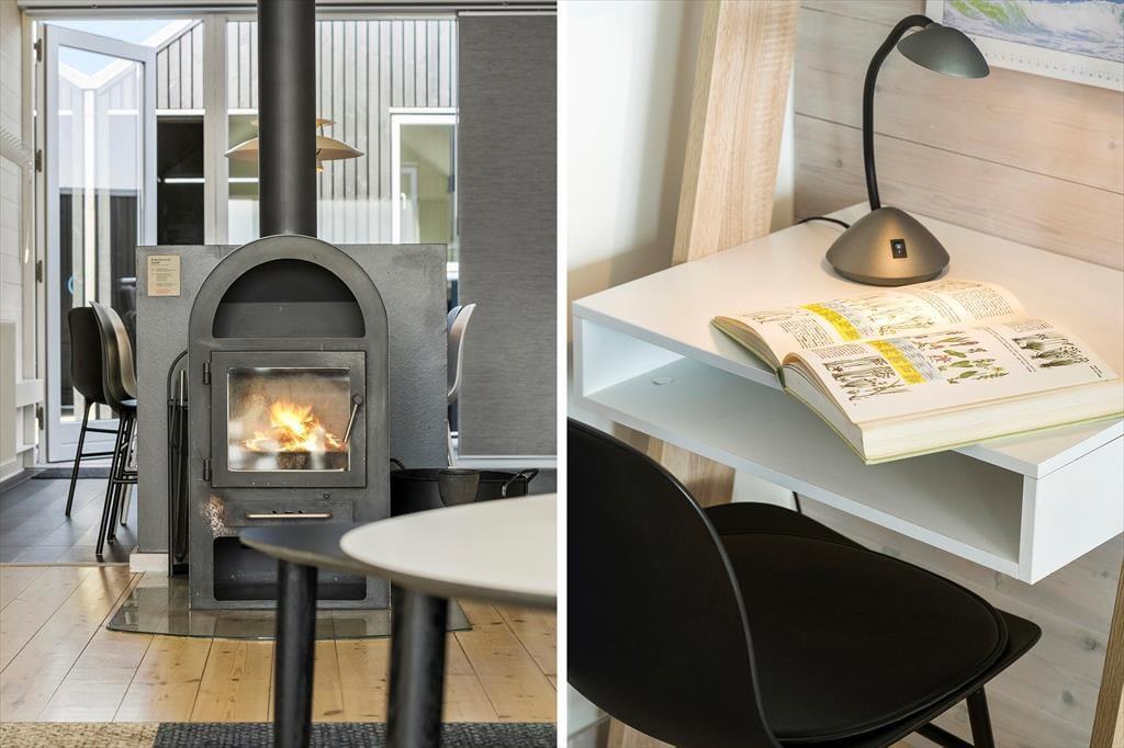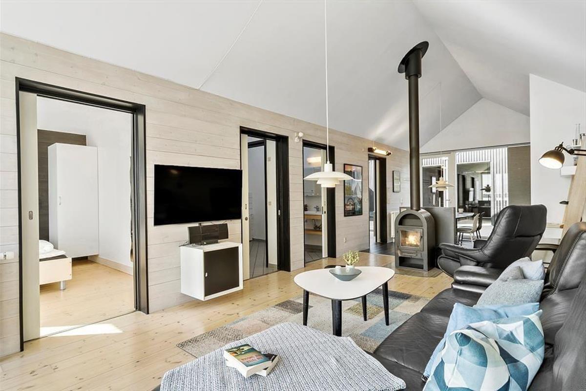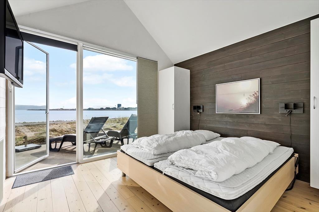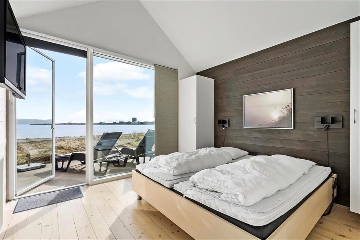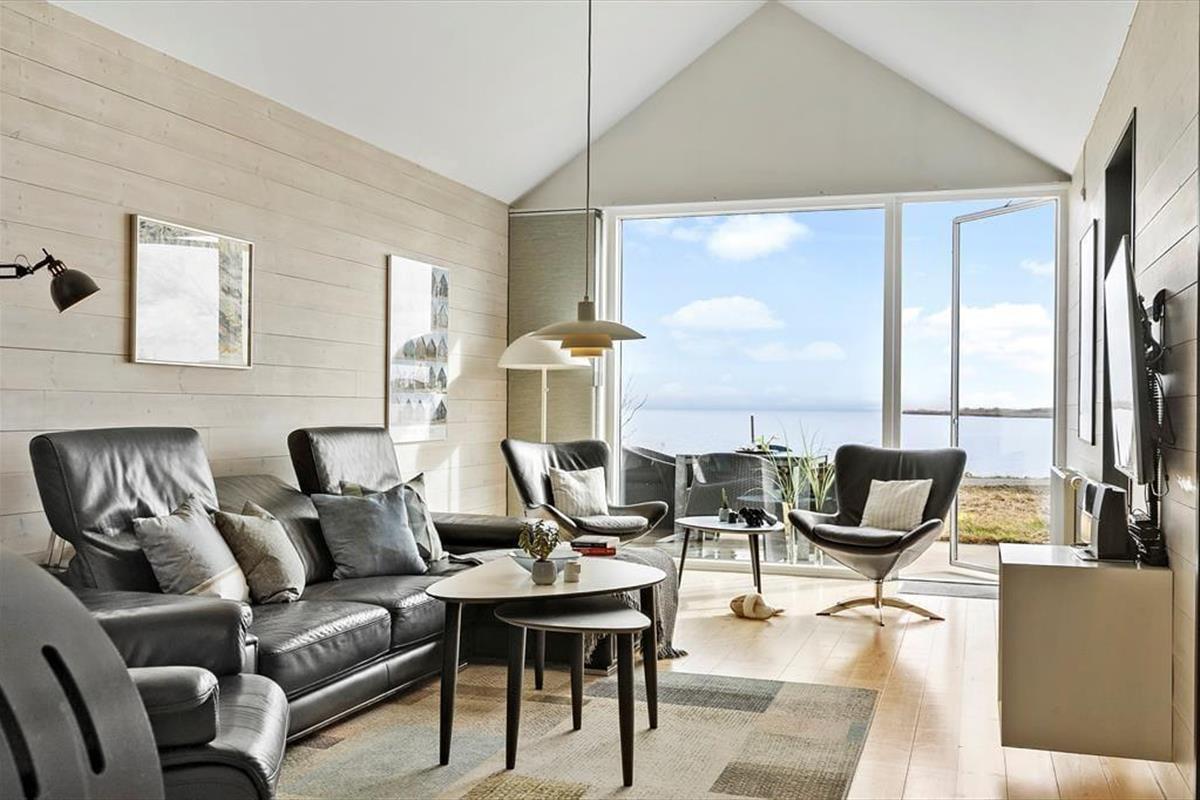 Die beiden Schlafzimmer beinhalten jeweils zwei Schlafplätze, sodass sich das Haus gut für zwei befreundete Paare oder eine kleine Familie eignet. Einer der Schlafräume verwöhnt mit einem TV und einem Zugang zum Hinterhof. Der andere verfügt ebenfalls über einen TV und begeistert mit einem Ausblick auf den Fjord und einem Ausgang auf die Südterrasse. Die beiden Badezimmer verleihen Ihren Urlaubstagen Wellnessflair. Während eines mit einem Whirlpool besticht, überzeugt das andere mit einer Duschnische und einer Sauna. Der Rest der Wohnfläche ist dem großen, offenen Aufenthaltsbereich gewidmet, der Sie mit hohen Decken, einem Kaminofen, einem durchströmenden Tageslichteinfall, einem prachtvollen Fjordblick und einem insgesamt richtig schönen Wohnambiente empfängt. In der gut ausgestatteten Küche bereiten Sie gemeinsam die Mahlzeiten zu, die Sie im Anschluss am Essplatz genießen. Nach einem guten Essen laden die komfortable Polstergarnitur und der Flachbild-TV mit Streaming-Möglichkeit zu entspannten Abenden ein.