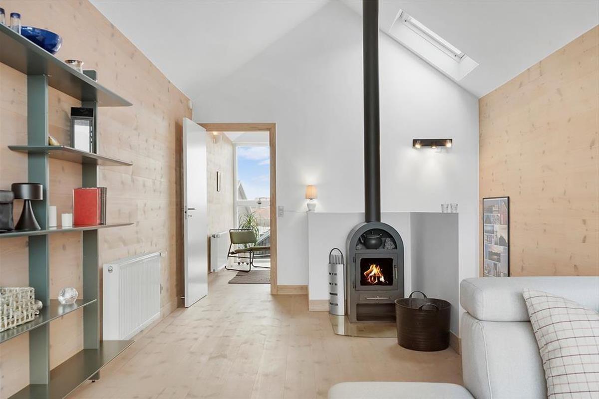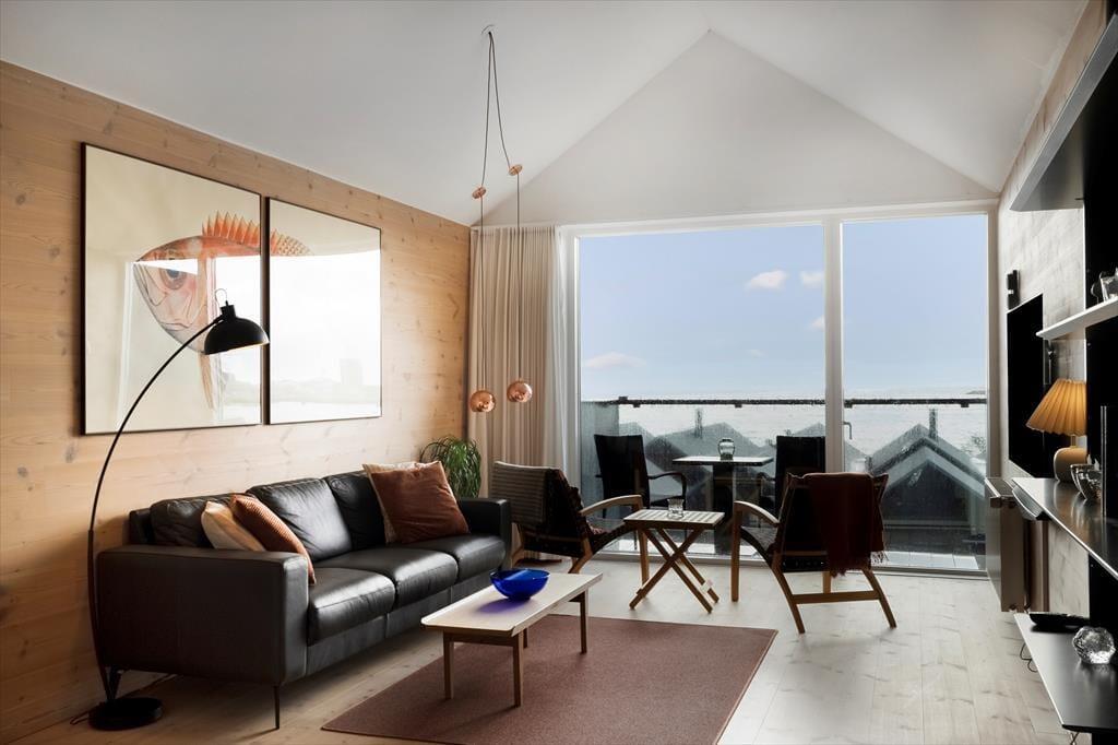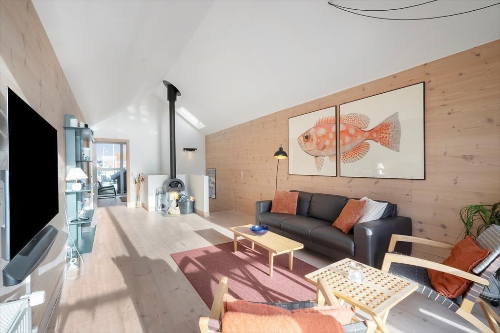 Beim Betreten des Ferienhauses wirst du von einer hellen und modernen Atmosphäre empfangen und die Räumlichkeiten öffnen sich durch die großen Fenster. Im Erdgeschoss findest du einen komfortablen Aufenthaltsraum mit gut ausgestatteter Küche, der zu gemütlichen Stunden bei der Zubereitung und den gemeinsamen Mahlzeiten am Esstisch einlädt. Wünschst du weitere Verwöhnung, befindet sich dort zwei Badezimmer mit einem hauseigenen Whirlpool und der Sauna. Im Obergeschoss erwartet dich eine gemütliche Stube mit Kamin und eine fantastische Aussicht über den Fjord – und dieses sowohl von drinnen vom Sofa als auch vom Balkon, wo die frische Meeresluft dich tief durchatmen lässt.