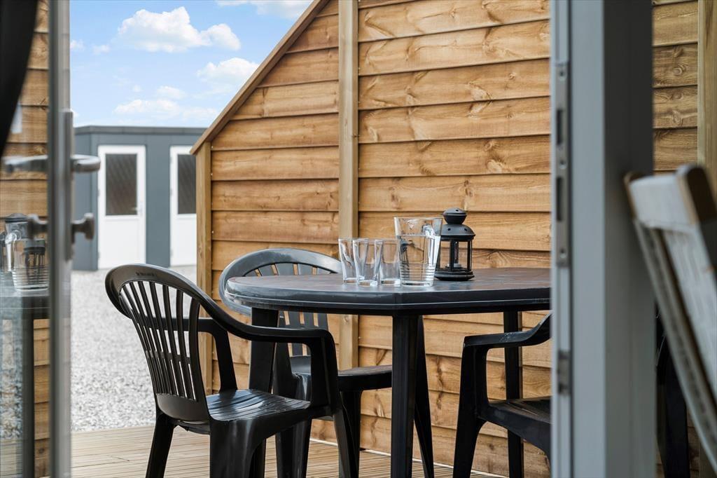 Eine kleine gemütliche Terrasse mit Gartenmöbeln. Die Terrasse ist von einem Zaun umgeben, sodass Sie in Ruhe draußen sitzen können.