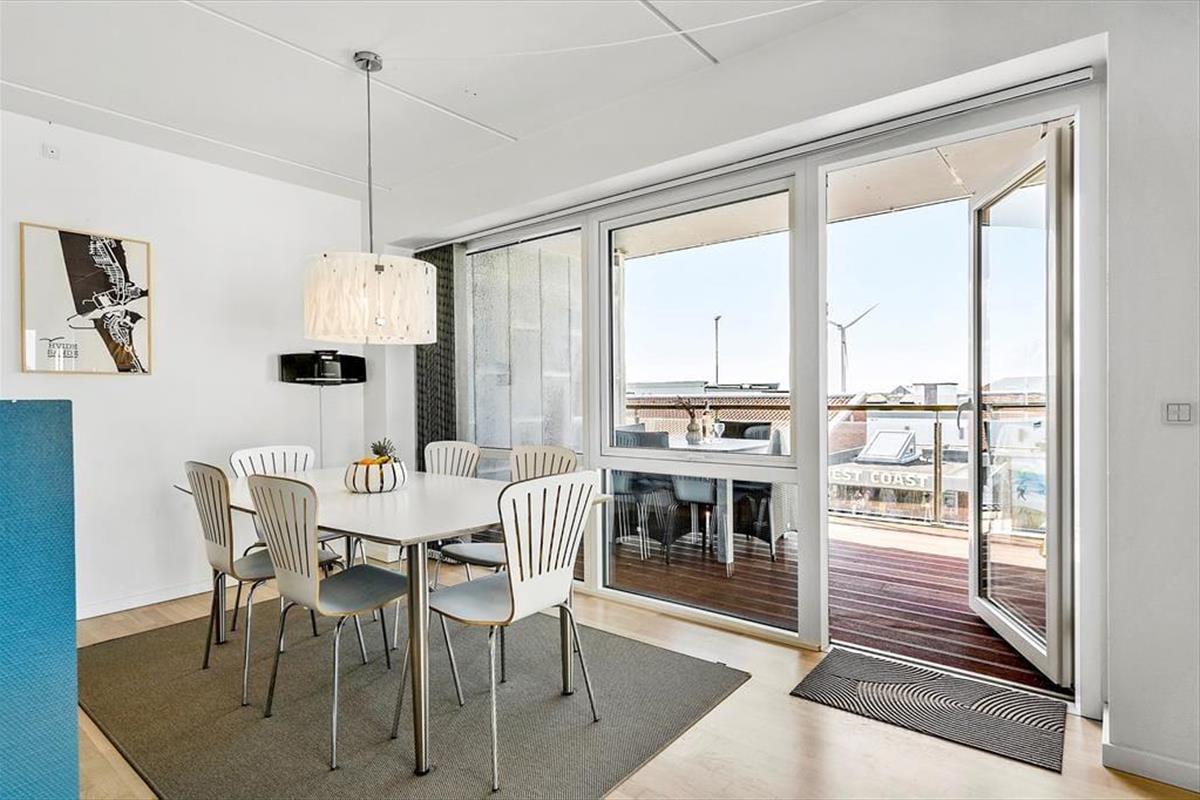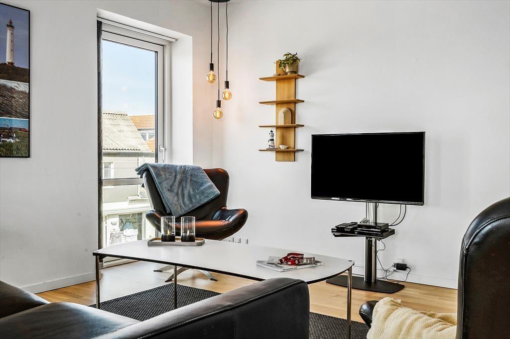 Diese attraktive Ferienwohnung liegt mitten im ansprechenden Zentrum Hvide Sandes. Von Ihrer überdachten, nach westen ausgerichteten Terrasse blicken Sie über die Hausdächer zum Hafen und zur Nordsee.