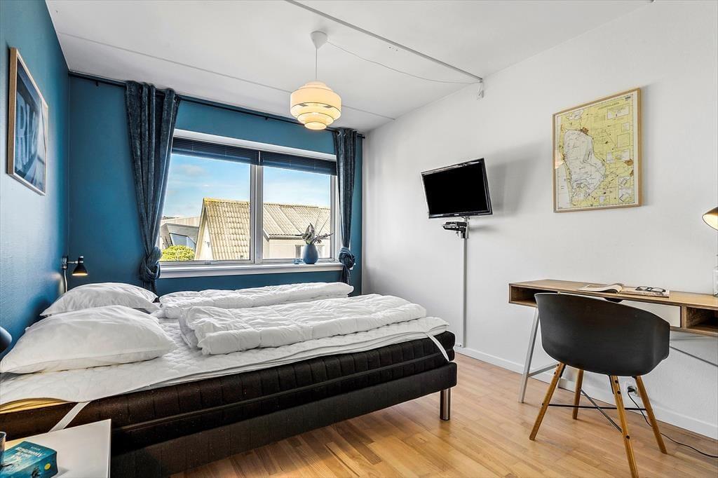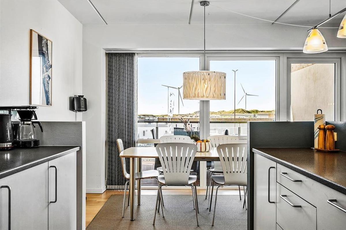 Die Ferienwohnung befindet sich im ersten Stockwerk eines modernen Gebäudes. Ein Fahrstuhl ist vorhanden. Die Räumlichkeiten wirken angenehm luftig und bestechen mit einer modernen und komfortablen Möblierung. Große Fensterpartien gewähren einen tollen Tageslichteinfall. Die vier vorhandenen Schlafplätze verteilen sich auf zwei Schlafzimmer. Eines der beiden Schlafzimmer verwöhnt mit einem begehbaren Kleiderschrank. Im Badezimmer erwarten sie eine Duschnische und eine Fußbodenheizung. Zu den eher praktischen Details gehört der Hauswirtschaftsbereich, der neben einer Spüle und einer Arbeitsplatte auch Schrankfläche und eine Waschsäule umfasst. Der Rest der Wohnung ist offen gestaltet und präsentiert sich Ihnen in Form eines reizvollen Aufenthaltsbereichs. In der integrierten Küche mit einer Kücheninsel wird das gemeinsame Zubereiten der Mahlzeiten zum reinen Vergnügen. Den ungeliebten Abwasch erledigt selbstverständlich der Geschirrspüler. Das Essen genießen Sie am Esstisch, von dem sie auf das Wasser blicken können. Zu entspannten und erholsamen Abenden laden Polstermöbel samt Fernseher ein. Zur Wohnung gehört ein Abstellraum mit einem Tiefkühler. Von Ende März bis Ende Oktober können Mieter dieser Wohnung kostenfrei den Fischreinigungsplatz beim Campingplatz von Hvide Sande nutzen.