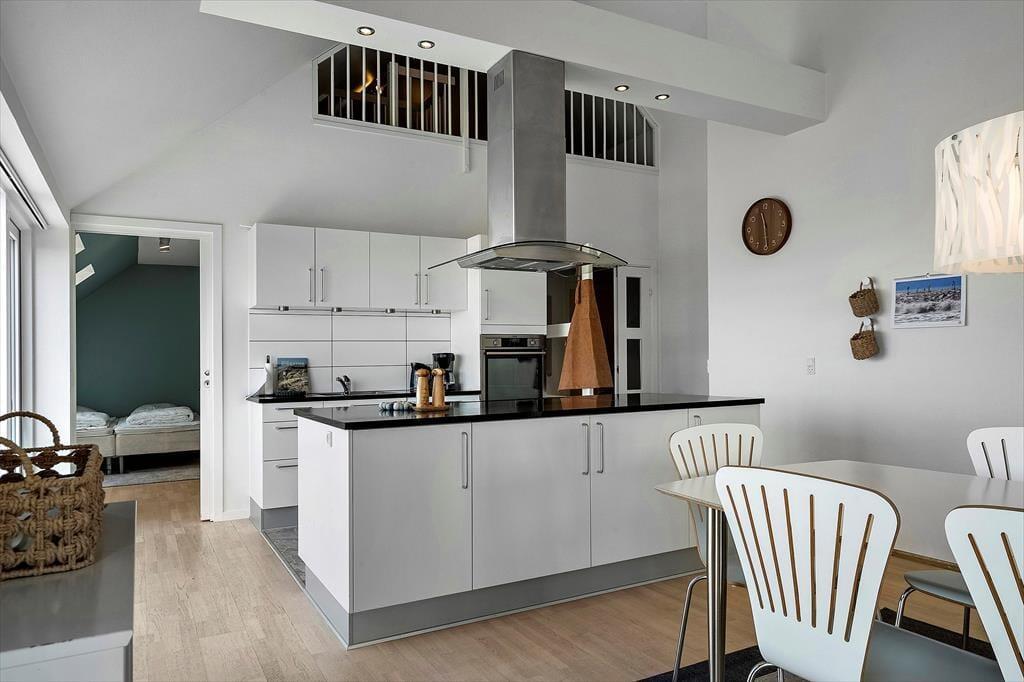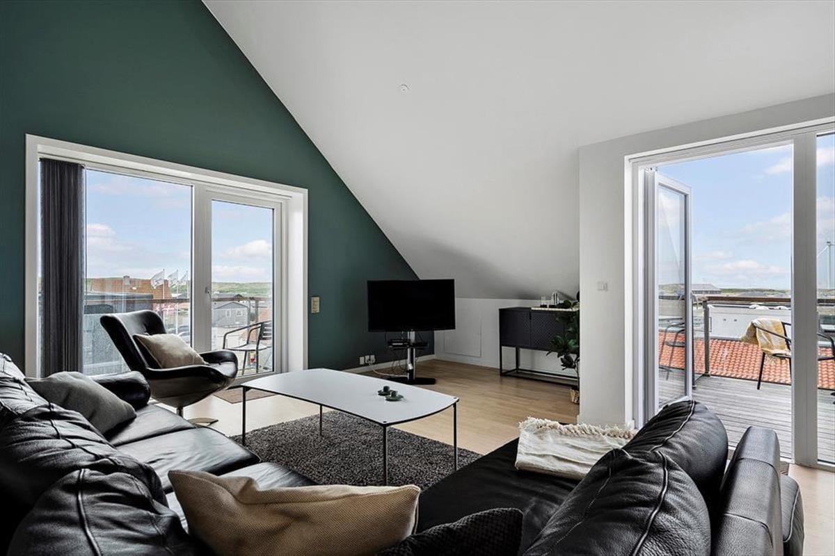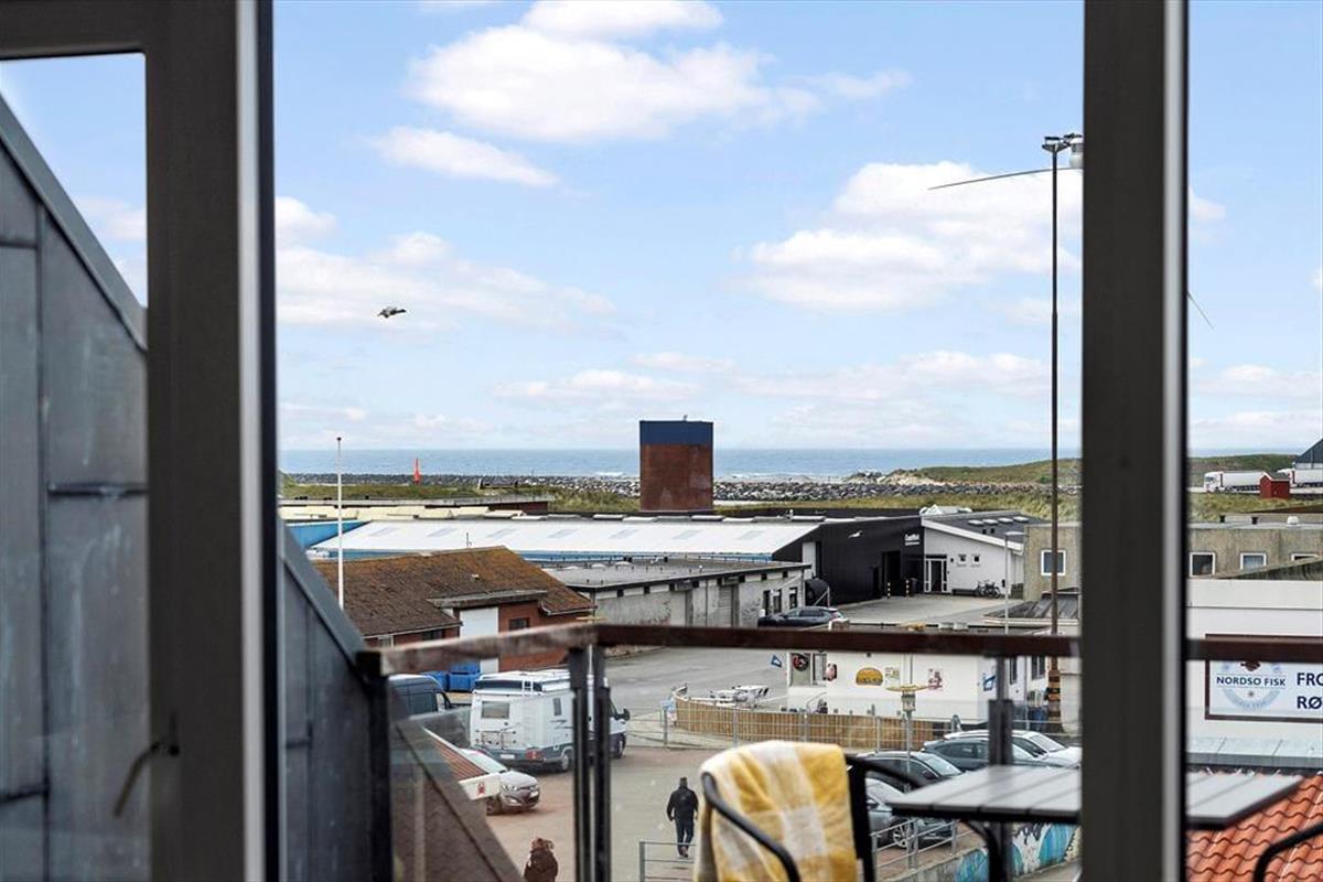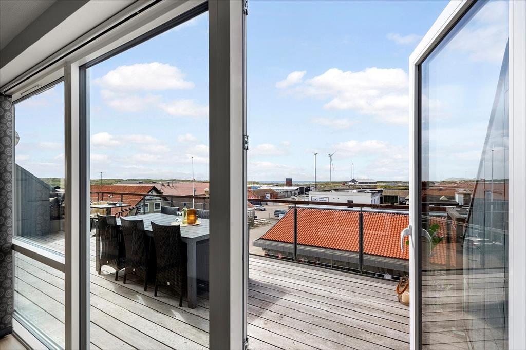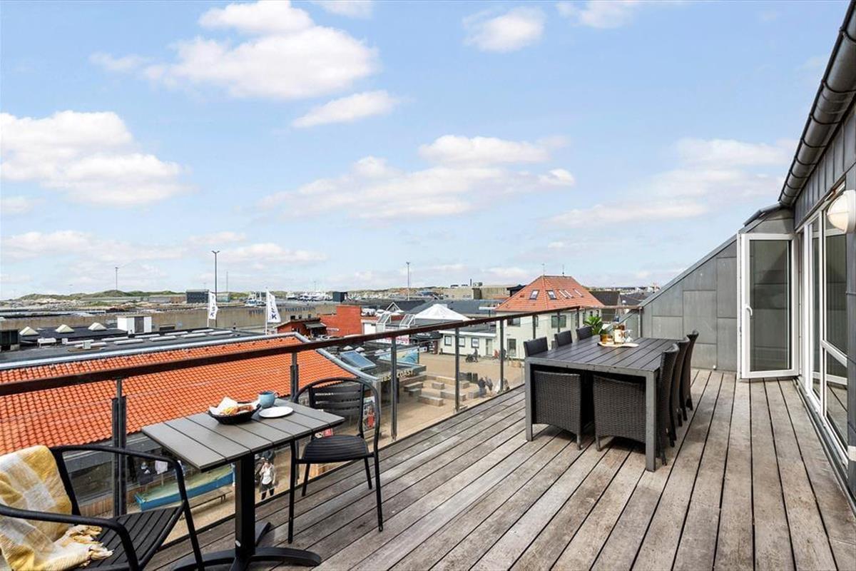 Die Ferienwohnung befindet sich in einem ansprechenden Gebäudekomplex mit Fahrstuhl. Im Wohnungsinneren empfangen Sie große, helle und luftige Räume. Die Schlafplätze für sechs Personen verteilen sich auf drei gute Schlafräume. Ein eingezogener Hängeboden bietet weiteren Platz. Die Wohnung umfasst zwei Badezimmer, die beide mit einer Dusche ausgestattet sind. In einem der Bäder sorgt ein Whirlpool für optimale Entspannung. Vom Eingangsbereich gelangen Sie in einen praktischen Hauswirtschaftsbereich mit einer Spüle samt Arbeitsplatte und einer Waschsäule ausgestattet ist. Am meisten beeindrucken wird Sie der Aufenthaltsbereich, der aufgrund der Panoramafenster einen Ausblick über Hvide Sande und die Nordsee gewährt. Der Aufenthaltsbereich vereint den Wohnraum und die offene Küche in ansprechender Weise. Die Küche mit einer Kücheninsel ist gut ausgestattet und macht das gemeinsame Zubereiten der Mahlzeiten zum reinen Vergnügen. Im Wohnraum laden ein Esstisch, weiche Polstermöbel und ein Fernseher zu geselligen Runden und gemütlichen Stunden ein. Zur Wohnung gehört ein Abstellraum mit einem Tiefkühler. Von Ende März bis Ende Oktober können Mieter dieser Wohnung kostenfrei den Fischreinigungsplatz beim Campingplatz von Hvide Sande nutzen.