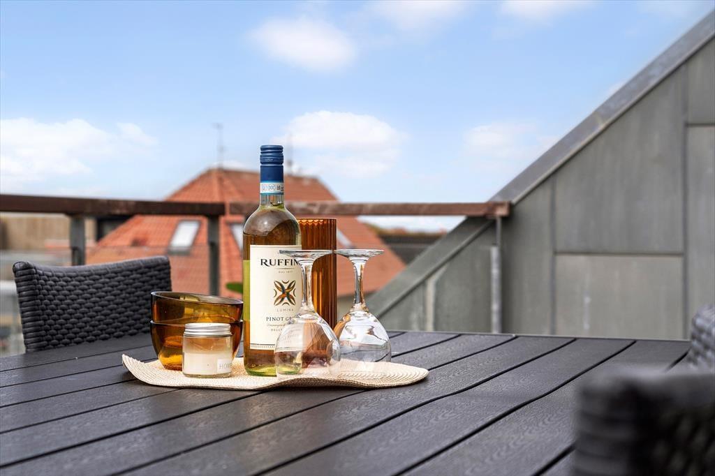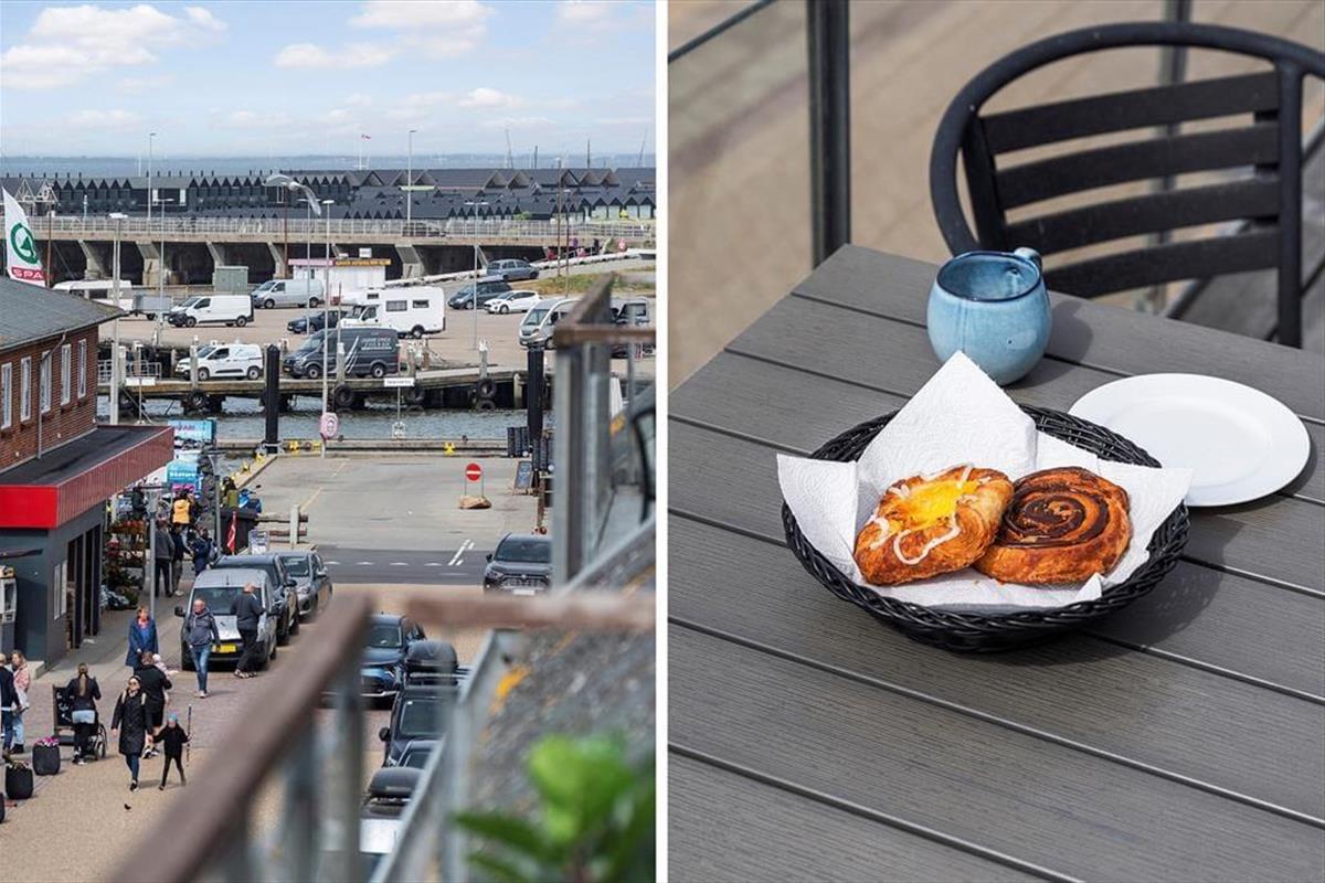 Vom Aufenthaltsbereich gelangen Sie hinaus auf eine große, gen Westen weisende Dachterrasse, auf der Sie viele Mittagessen in der Sonne und Abendessen im Abendlicht genießen. Untermalt werden Ihre erholsamen Stunden auf der Dachterrasse von einem Panoramablick über den Ort und den Hafen und mit Aussicht auf die Nordsee.
