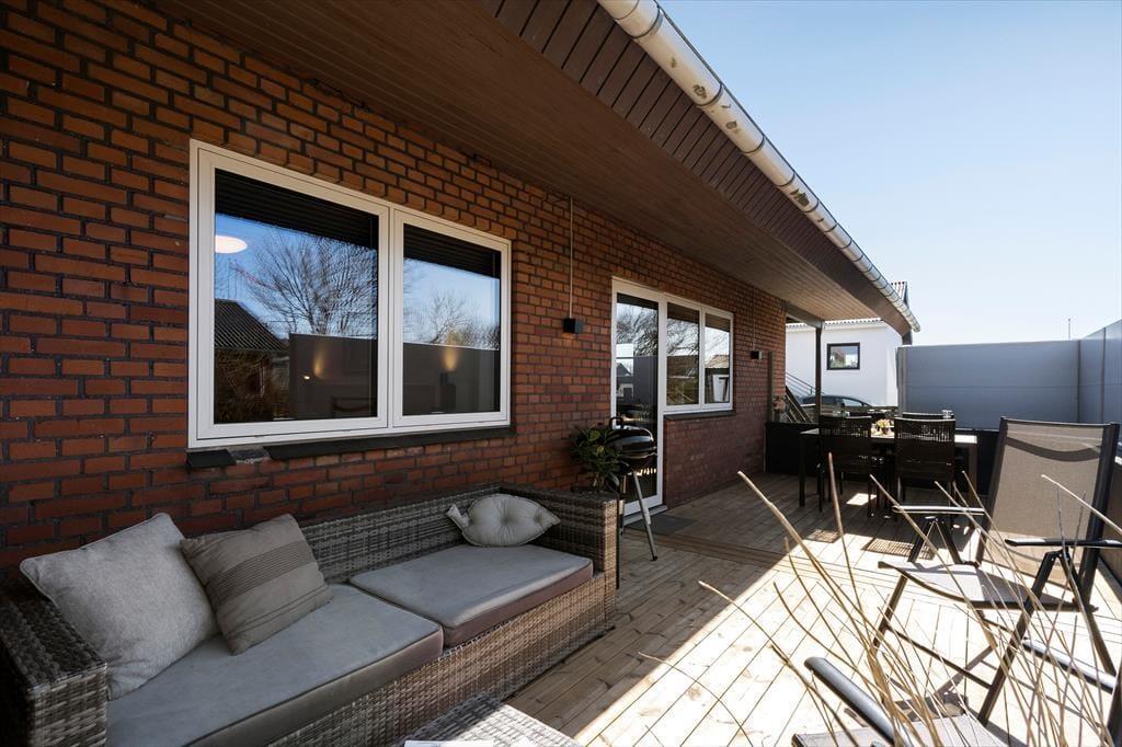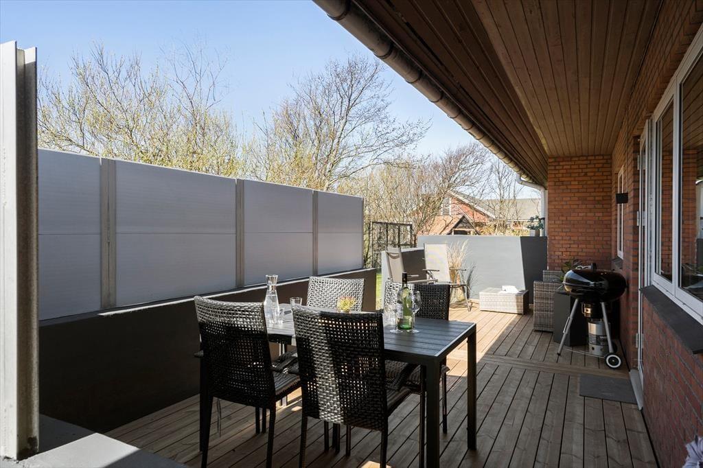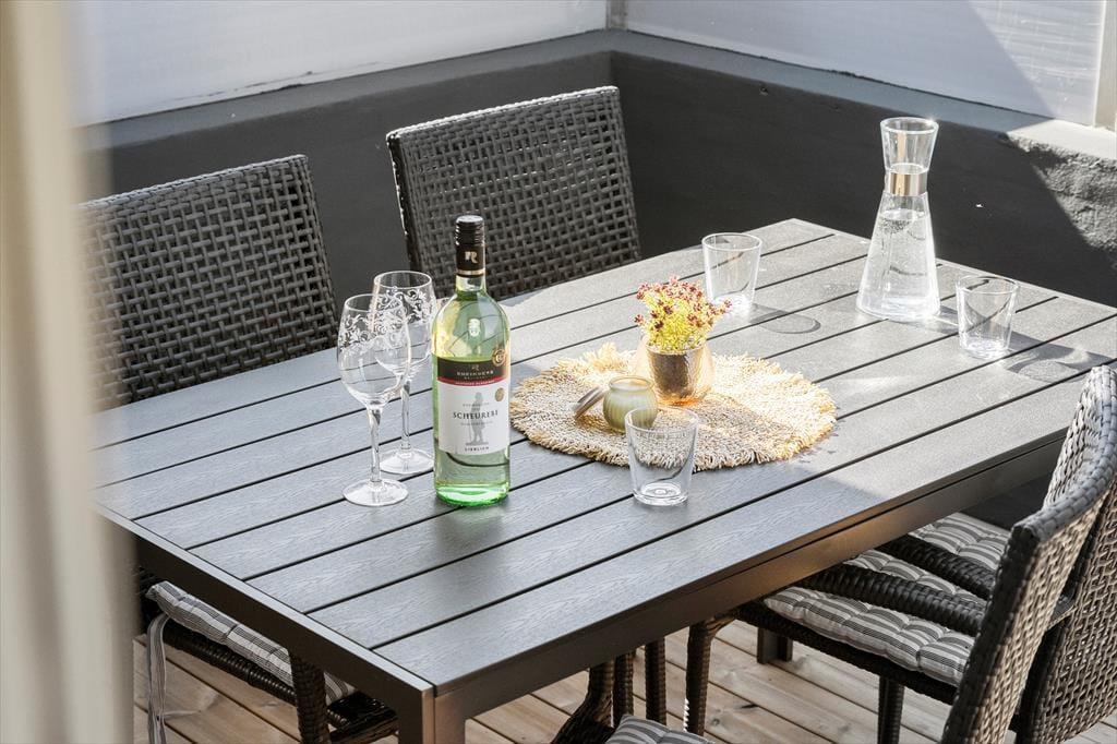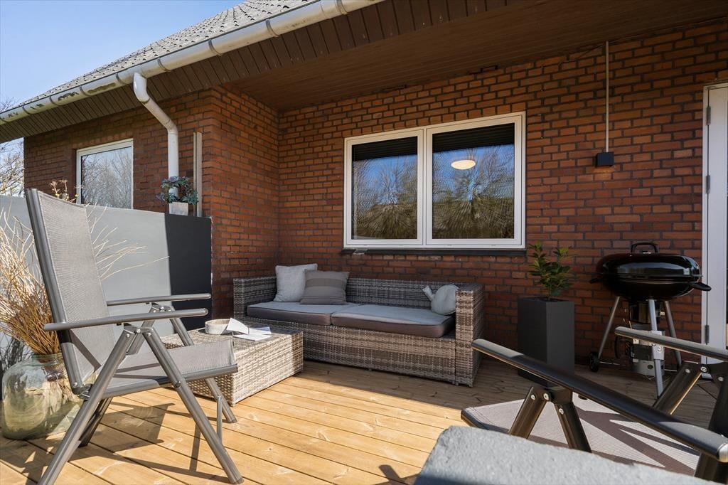 Draußen erwartet dich eine private Holzterrasse - du kannst recht ungestört die Sonne bei einem leckeren Kaffee genießen oder euer Abendessen auf dem Grill zubereiten – mit Blick auf den begrünten Garten. Von der Terrasse aus gelangst du direkt in den dazugehörigen Gartenbereich und dieser lädt sowohl zum Relaxen als auch zu Aktivitäten wie Ballspielen ein. Besonders zu erwähnen ist auch das große Gartenhaus – ein echtes Plus an der Sache: Jeder Wohneinheit steht ein abschließbarer Raum zur Verfügung – mit reichlich Platz für Surfausrüstung, E-Bikes, Angelausrüstung und alles, was zum aktiven Outdoorleben dazugehört. Hier findest du auch einen Fischreinigungsplatz, wo du deinen Fang des Tages bequem für den Grill vorbereiten kannst. Und das Auto wird direkt in der Einfahrt geparkt – einfacher geht’s nicht.
