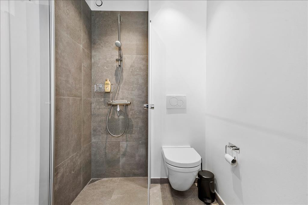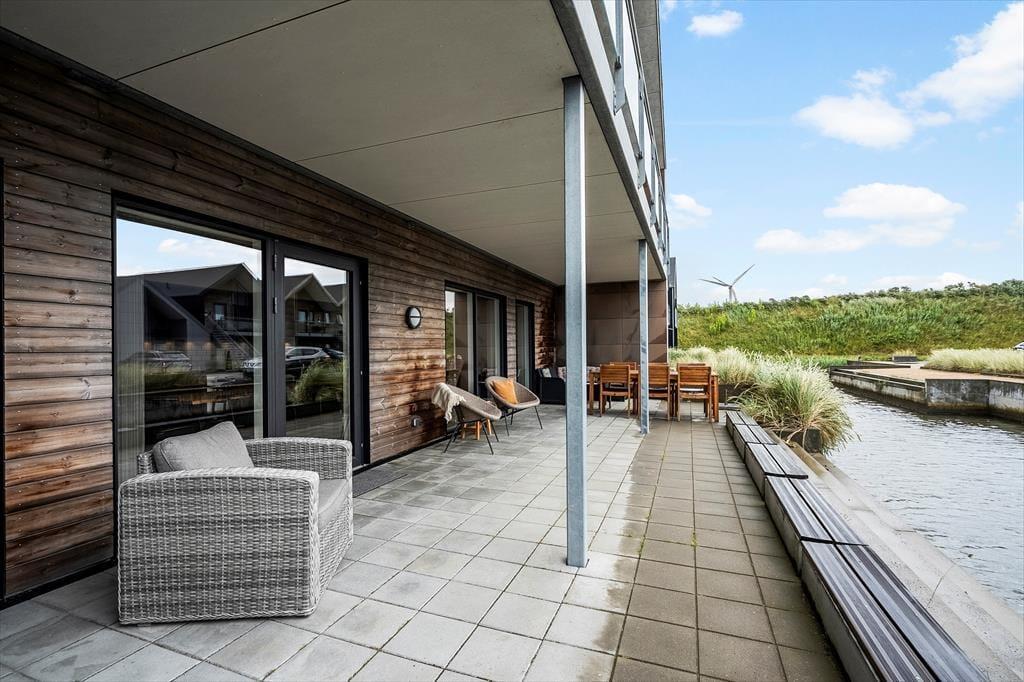 Bei den Entwürfen für das Wohnviertel legten die Architekten großen Wert darauf, dass alle Häuser und Wohnungen nah am Wasser liegen. Dies gilt selbstverständlich auf für diese Wohnung, zu der eine große Südterrasse gehört, die direkt an den Kanal grenzt. Auf dieser Terrasse können Sie sich im Liegestuhl entspannen und den ein oder anderen gemütlichen Grillabend verleben. Richtig schön ist es, auf der Treppe, die zum Wasser hinunter führt zu sitzen und den Ausblick zu genießen. An der anderen Seite der Wohnung treffen Sie auf einen Parkplatz. Hier können Sie sich ebenfalls niederlassen und das stimmungsvolle Abendlicht am Himmel bewundern.