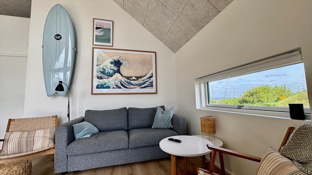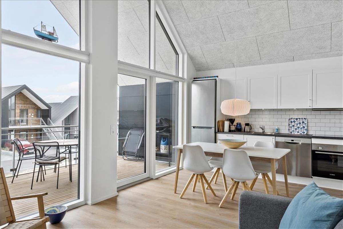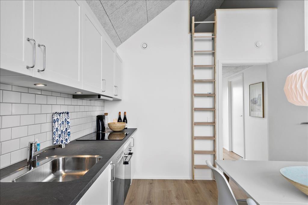 Es gibt viel zu sehen und zu erleben in Hvide Sande und Umgebung - aber es empfiehlt sich auch, etwas Zeit für Entspannung und Gemütlichkeit in der Wohnung im ersten Stock zu reservieren. Die Atmosphäre ist hell und luftig dank der großen Fenster und der bis zum Dach reichenden Decke. Die moderne Einrichtung steht im Einklang mit der Architektur, und mit einer offenen Küche, einem ansprechenden Badezimmer und einem schönen Schlafzimmer wurde sowohl auf Funktionalität als auch auf Komfort geachtet. Von der Küche aus haben Sie Zugang zu einem Hängeboden, der mit einem kleinen Fenster und Blick auf das Wohnzimmer als gemütlicher Schlafplatz für Kinder und Erwachsene dient.