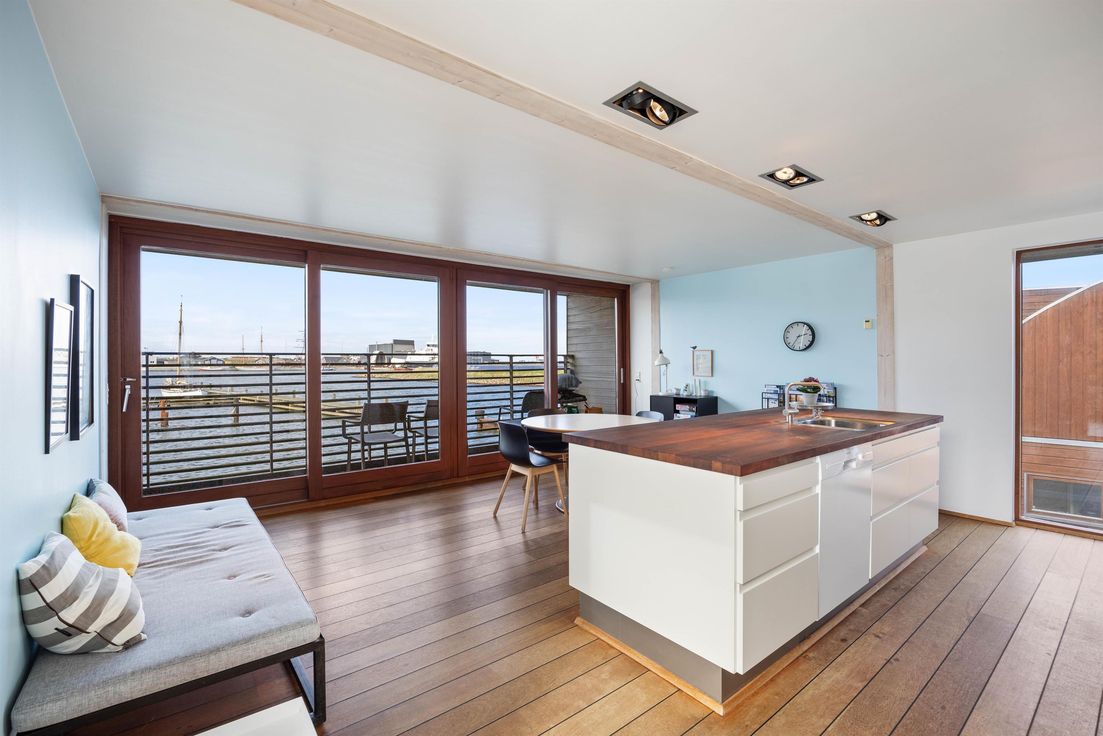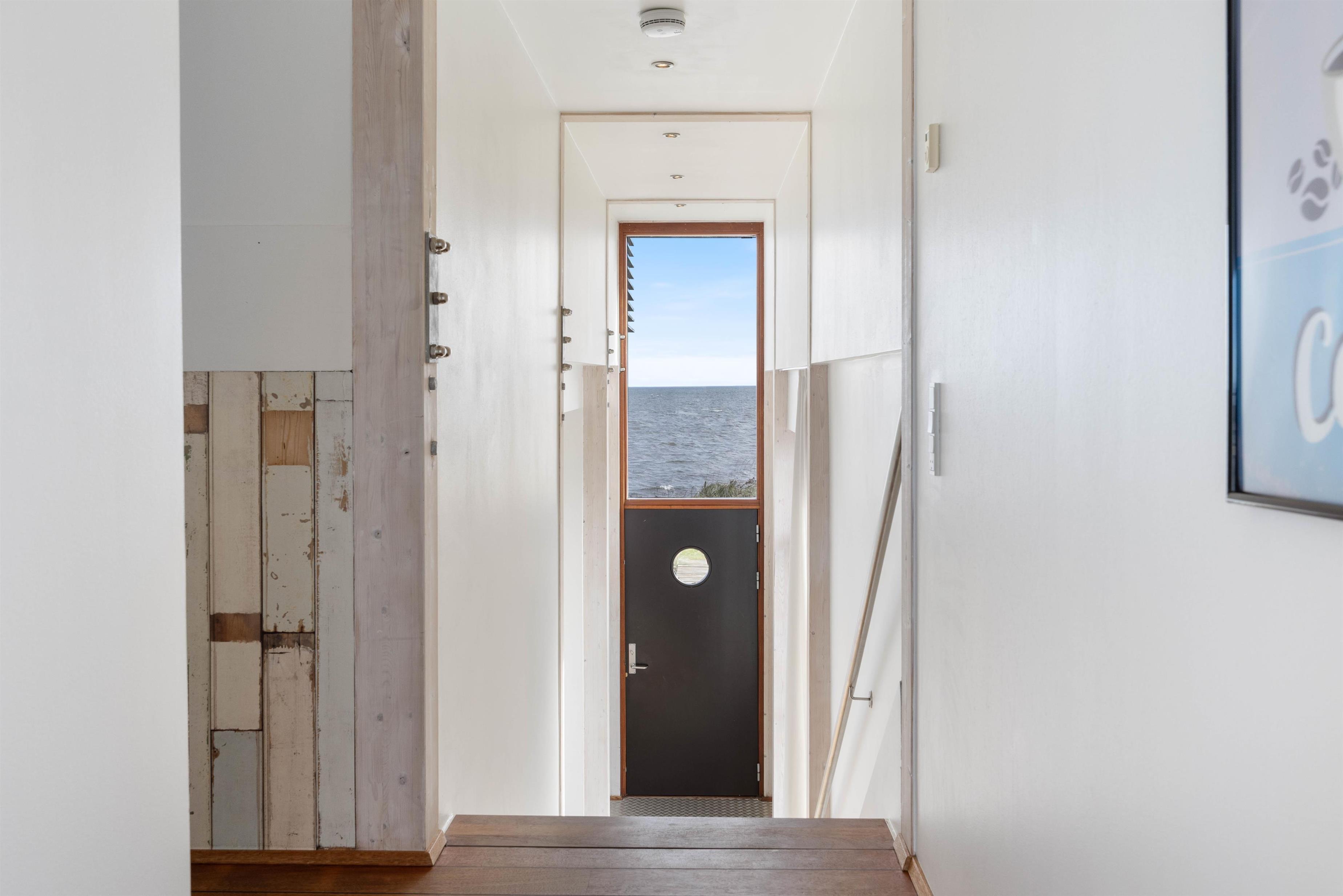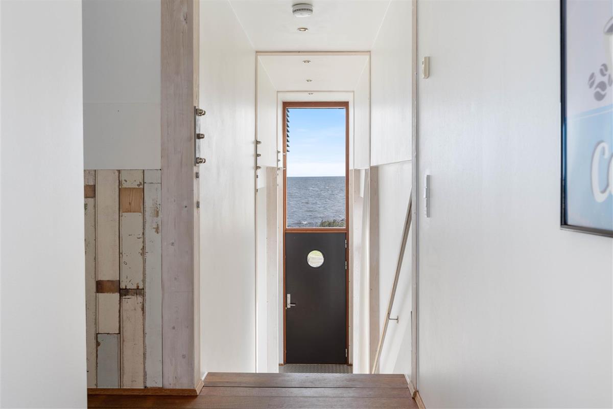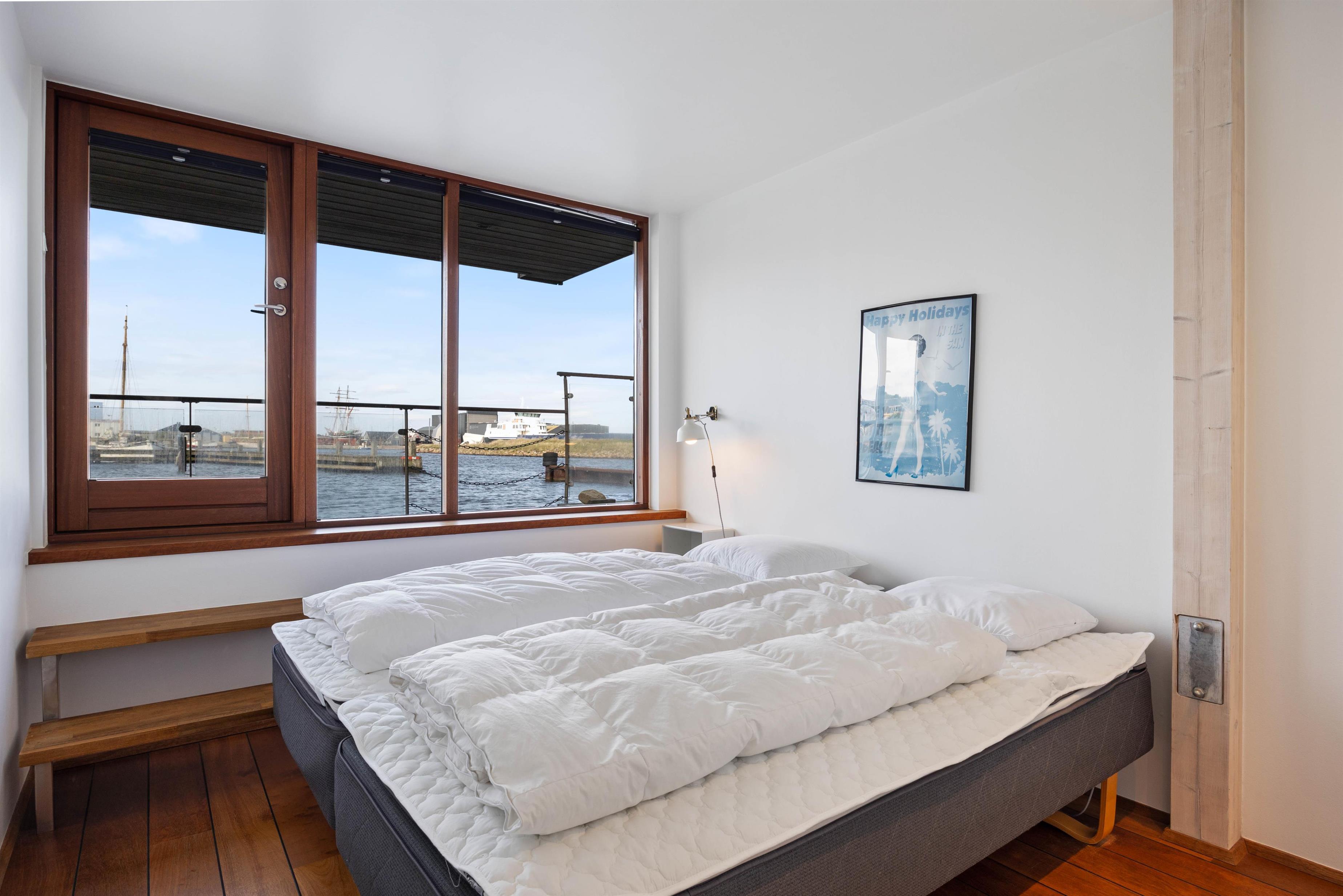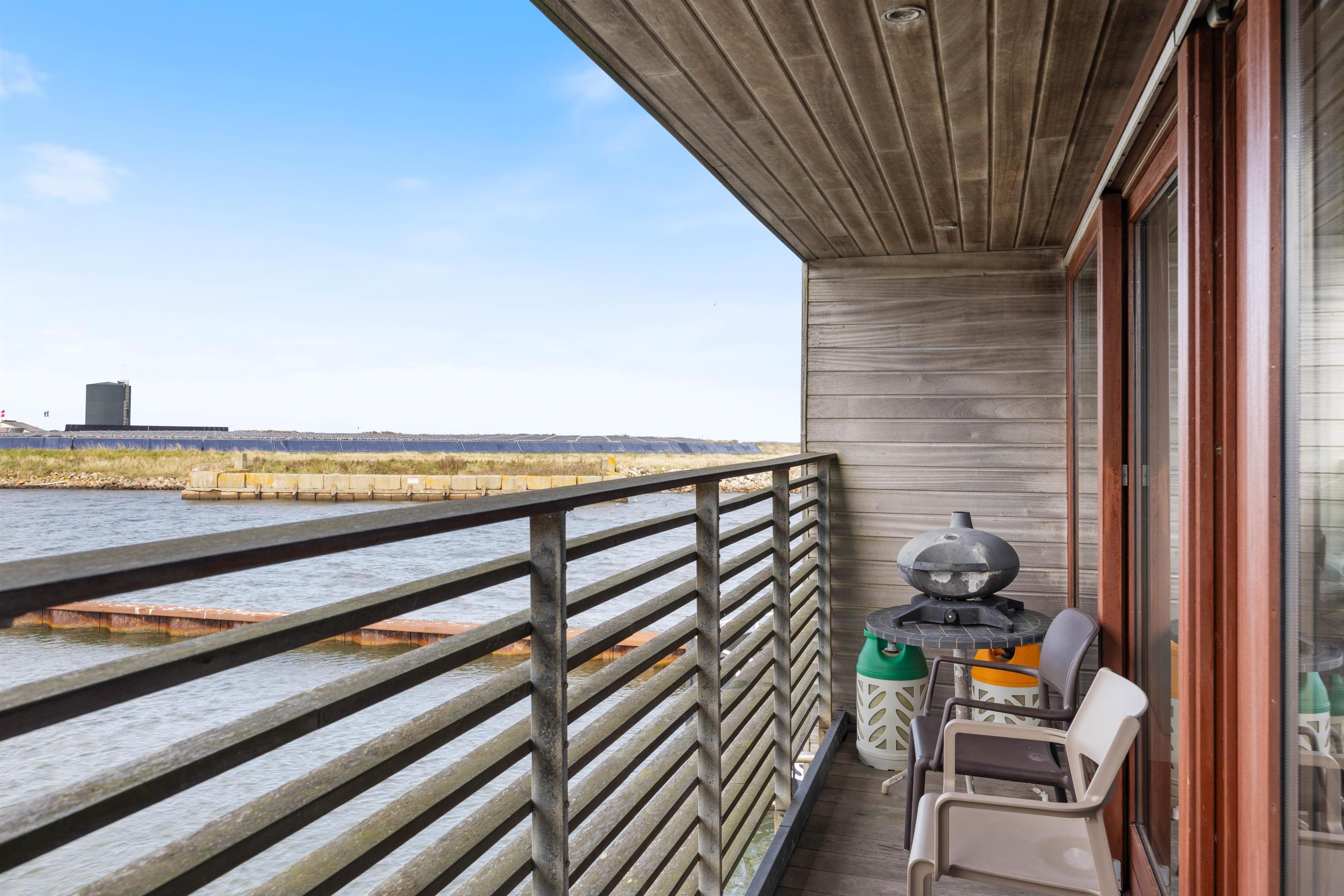 The houseboat features terraces on both levels. The lower level has a smaller terrace, while upstairs you'll find a considerably larger, partially sheltered terrace. From here, you can enjoy beautiful views across the fjord and Hvide Sande harbour.