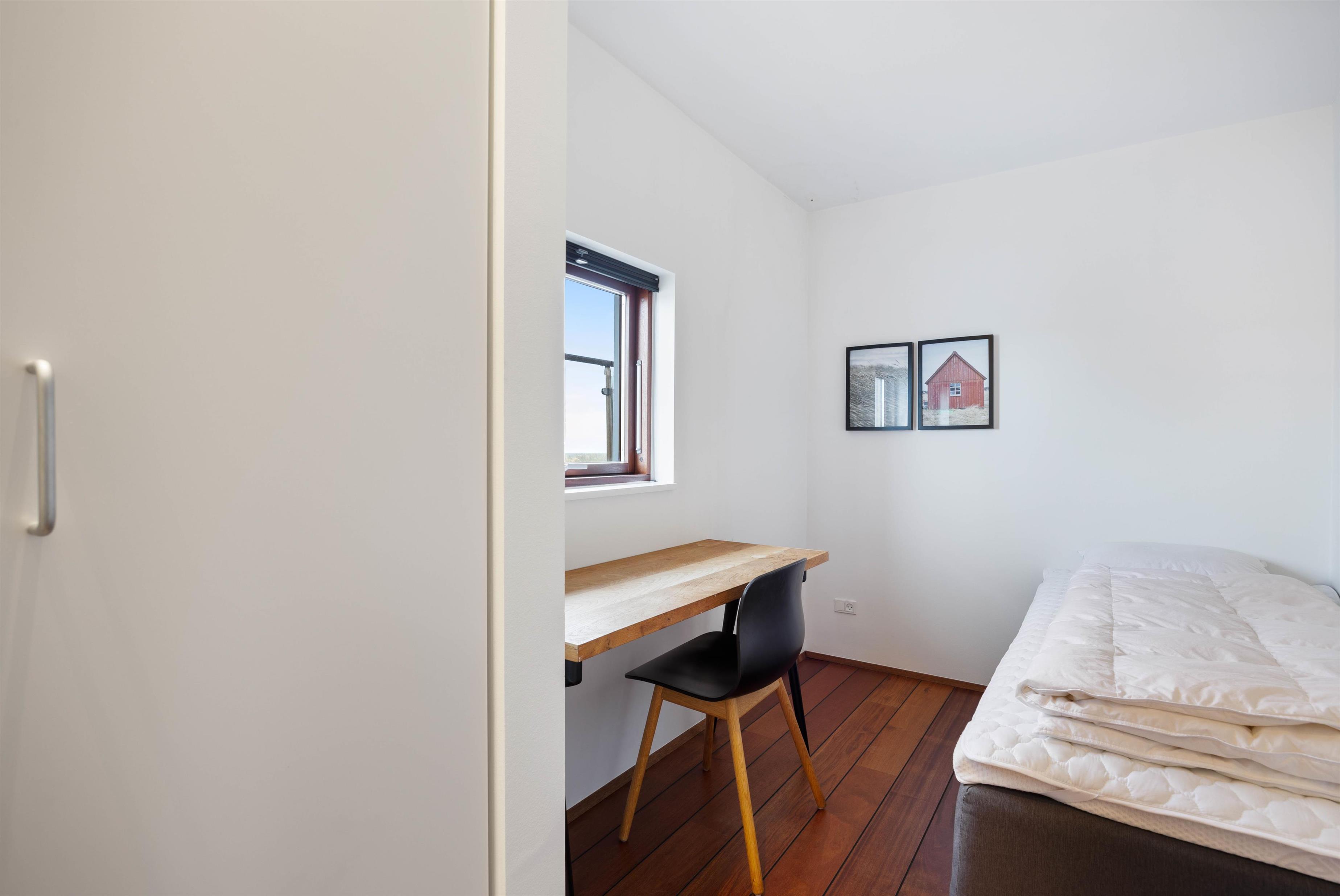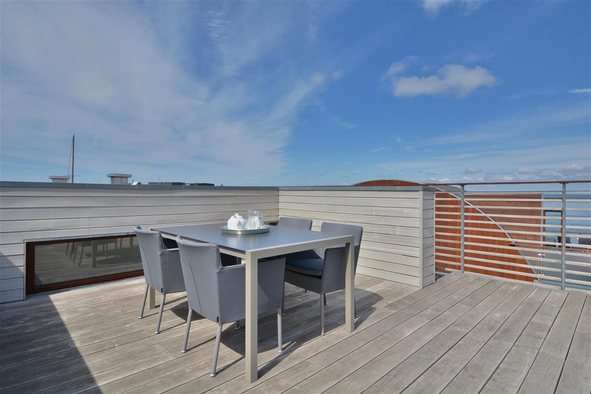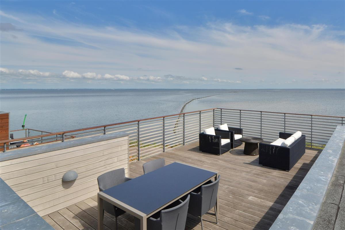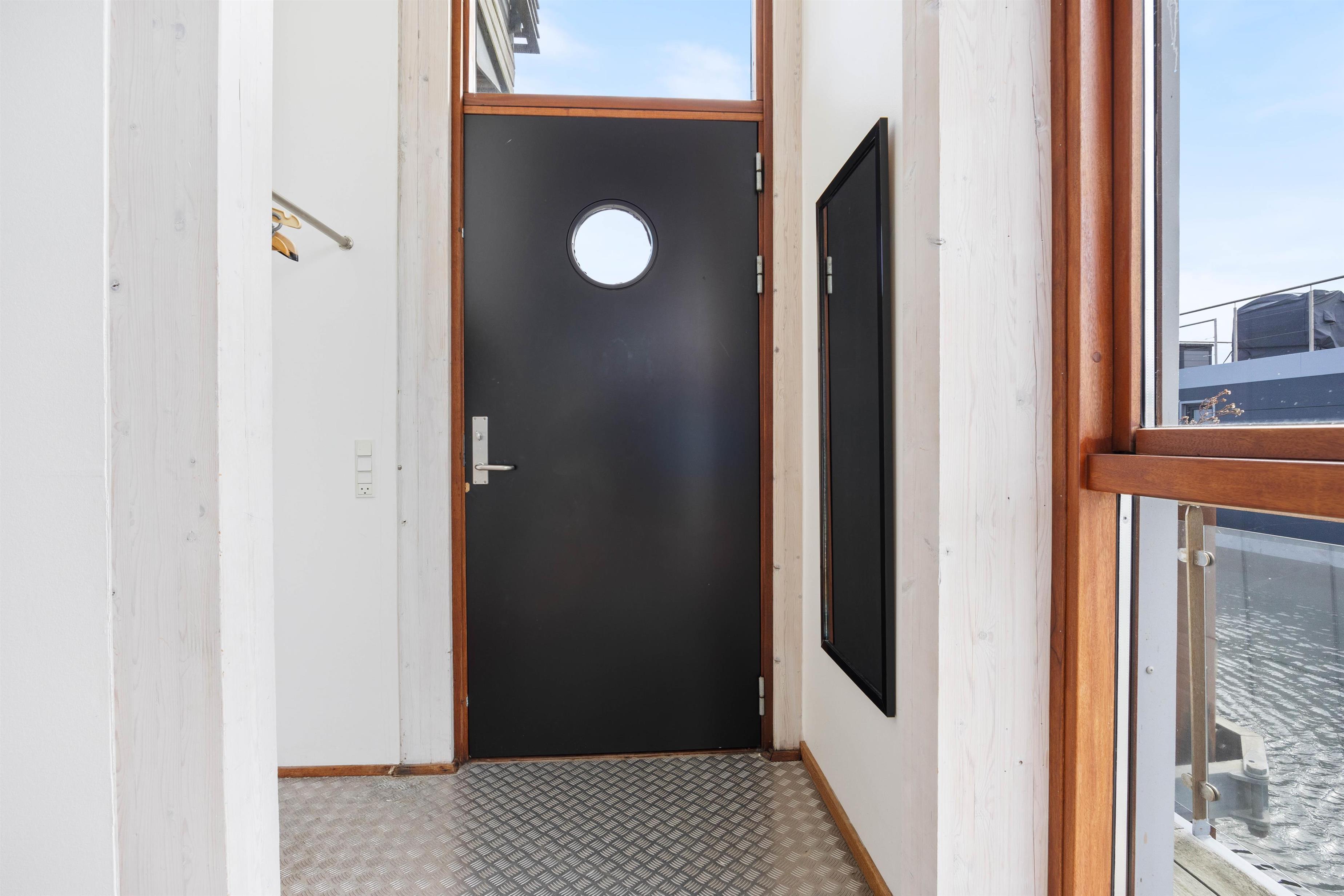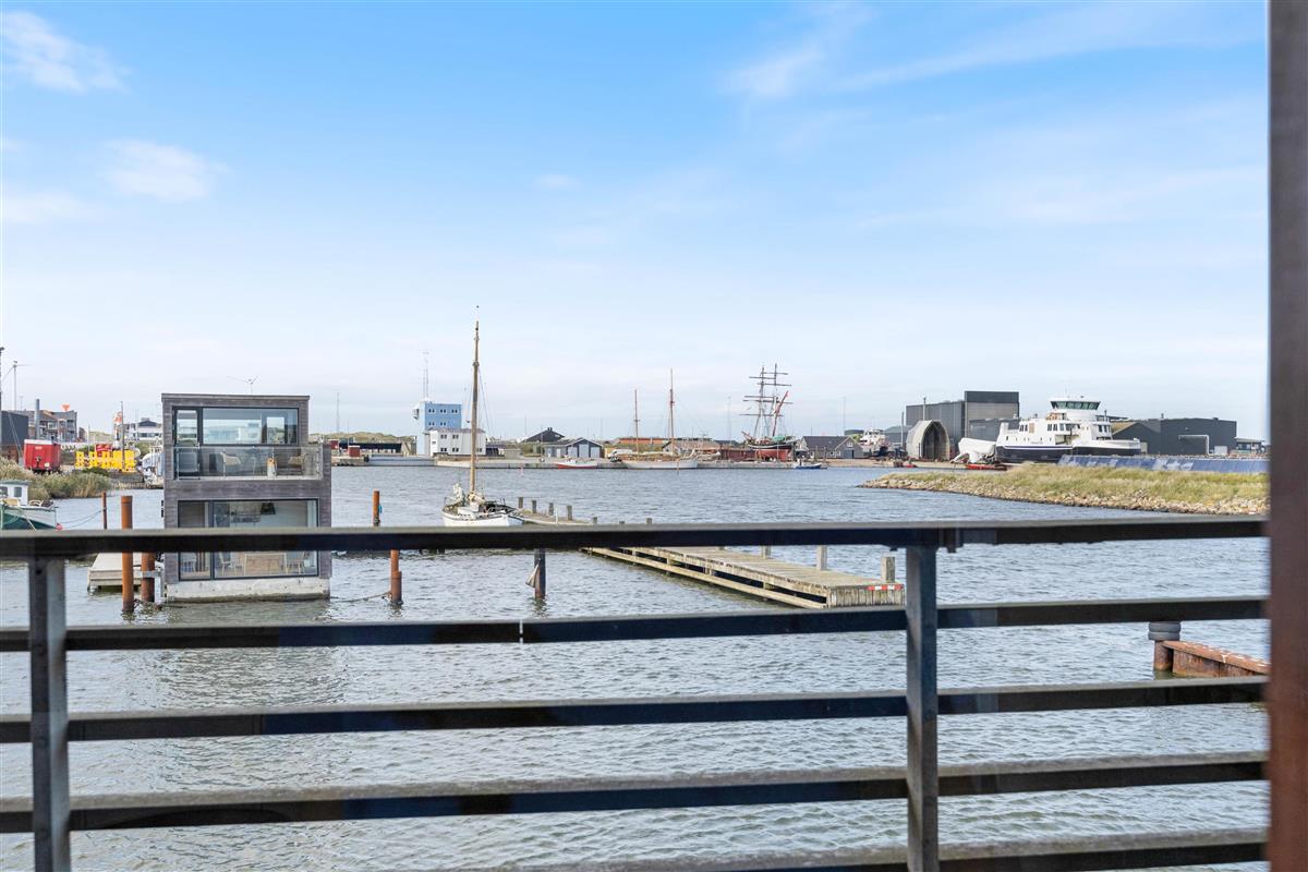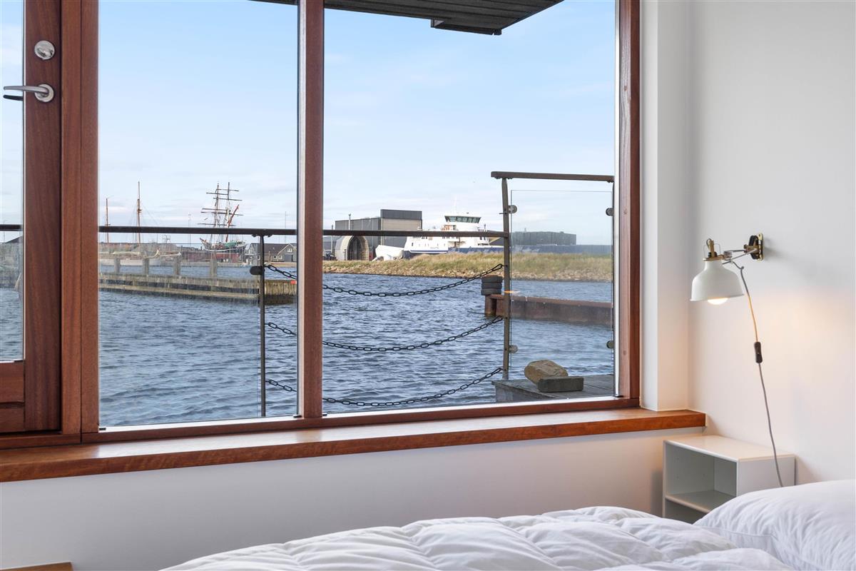 The houseboat features terraces on both levels. The lower level has a smaller terrace, while upstairs you'll find a considerably larger, partially sheltered terrace. From here, you can enjoy beautiful views across the fjord and Hvide Sande harbour.