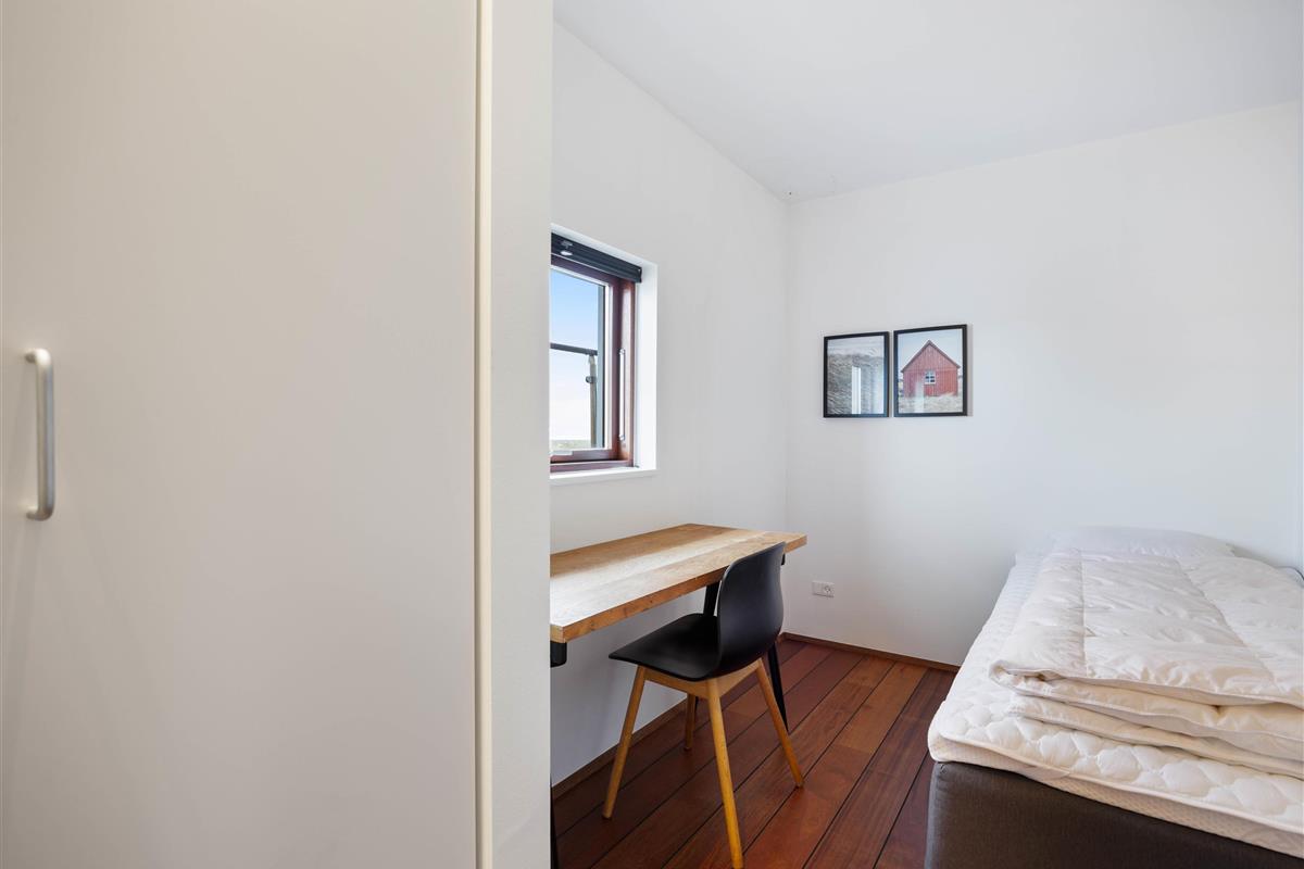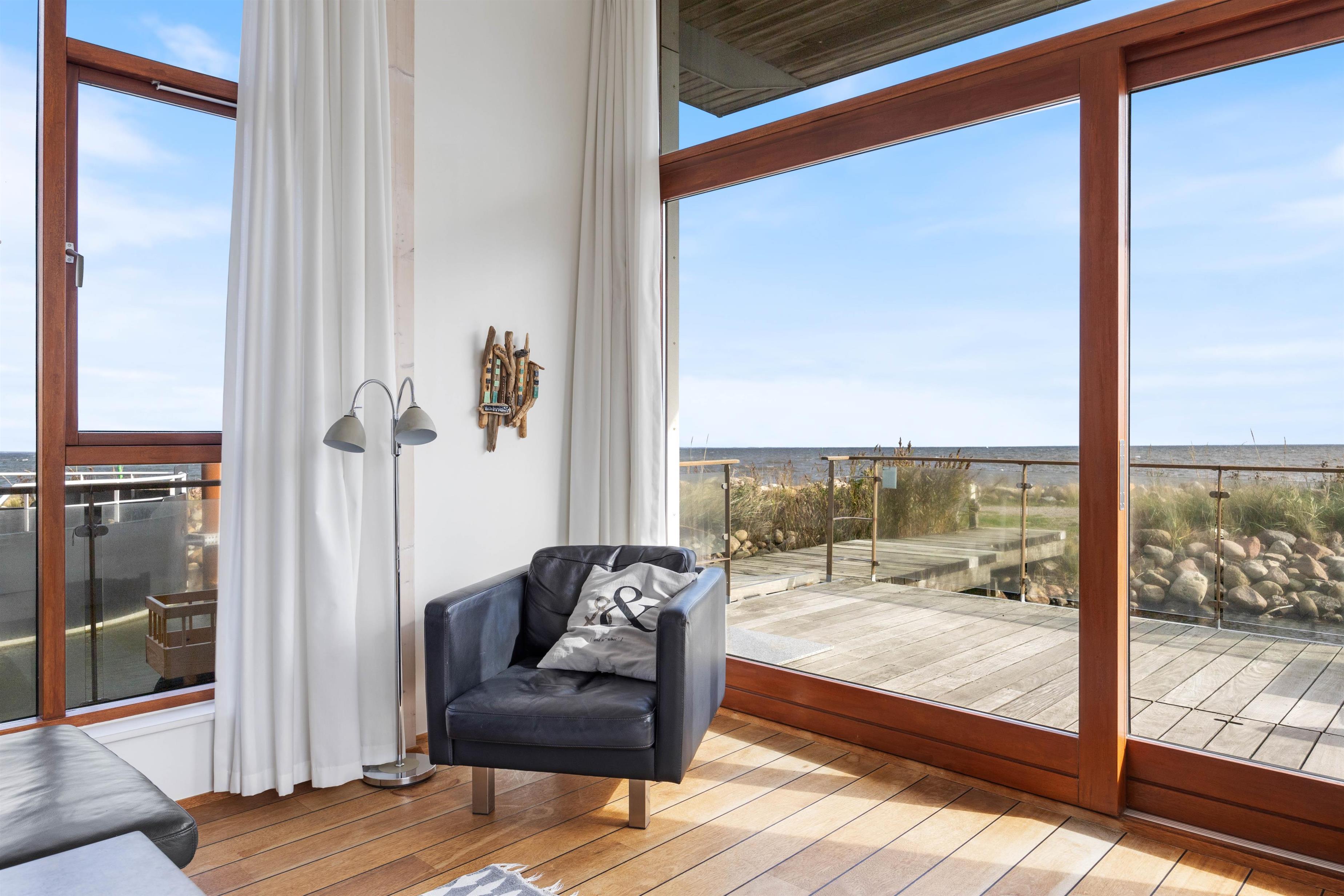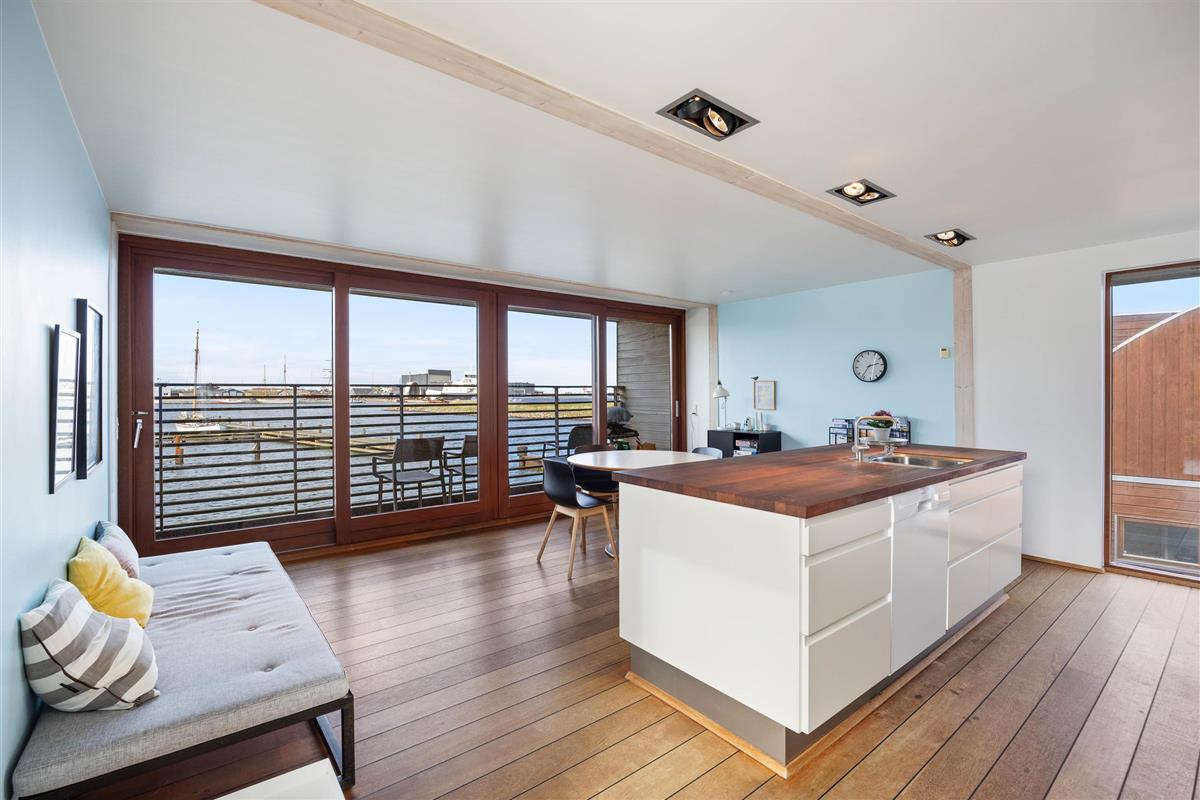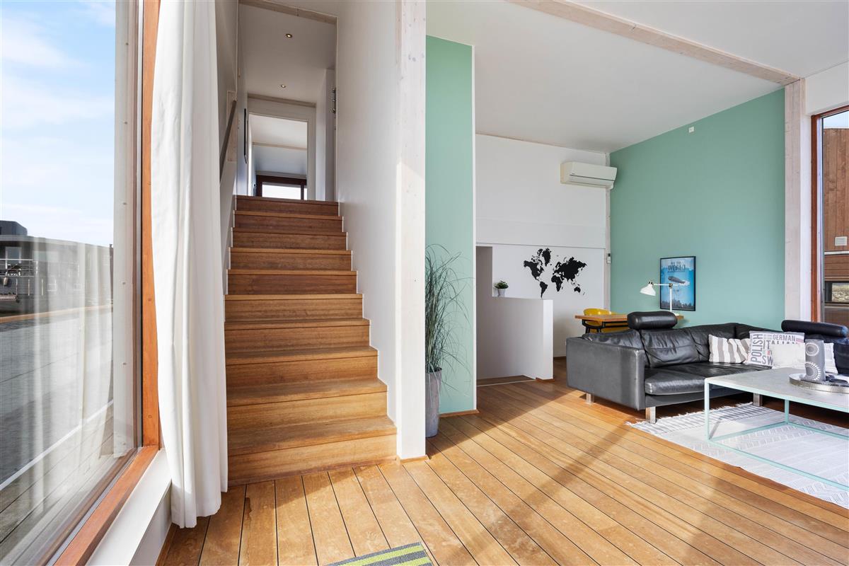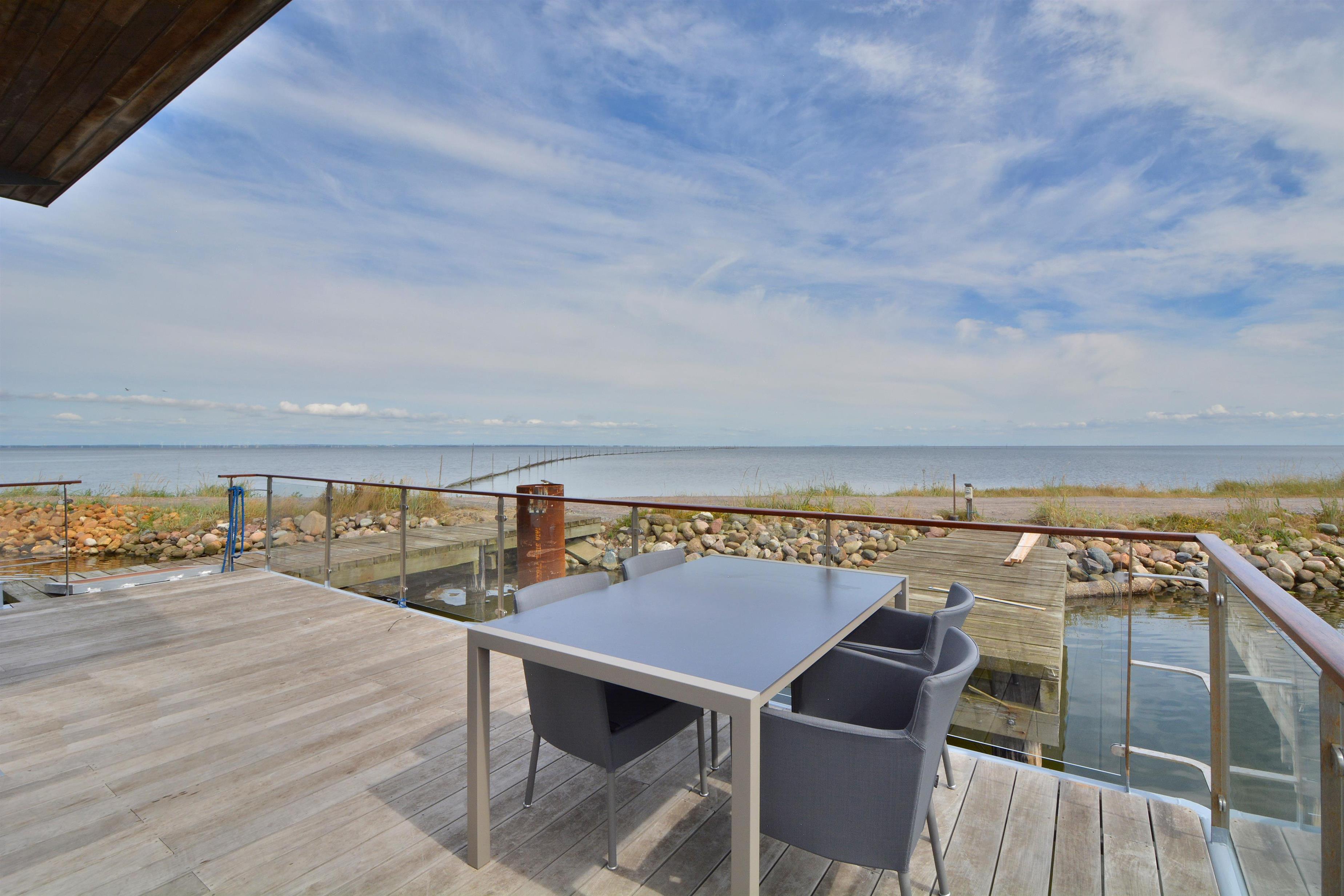 The houseboat features terraces on both levels. The lower level has a smaller terrace, while upstairs you'll find a considerably larger, partially sheltered terrace. From here, you can enjoy beautiful views across the fjord and Hvide Sande harbour.
