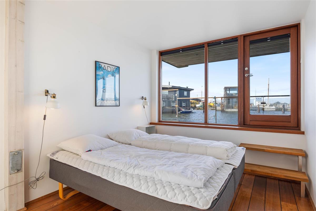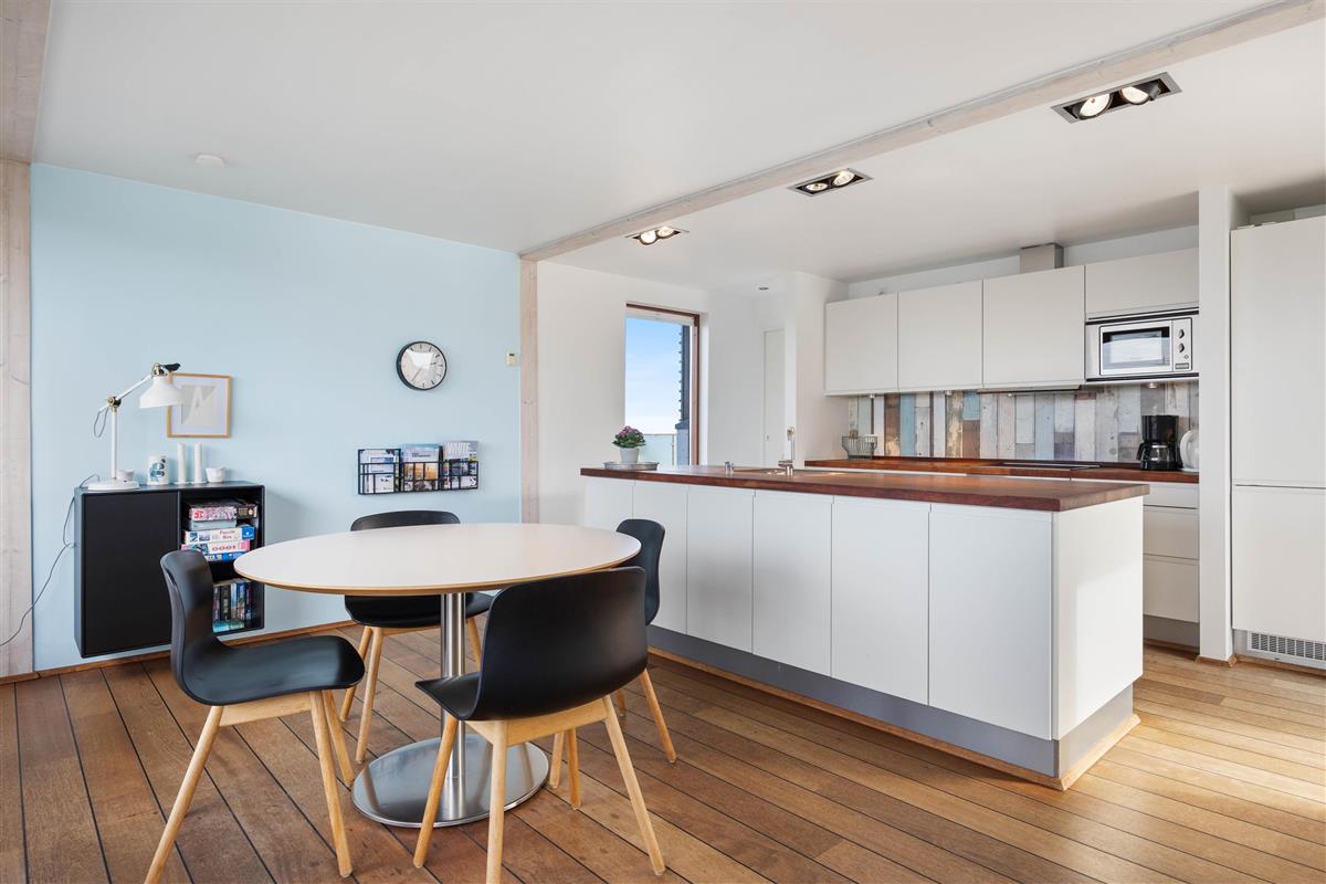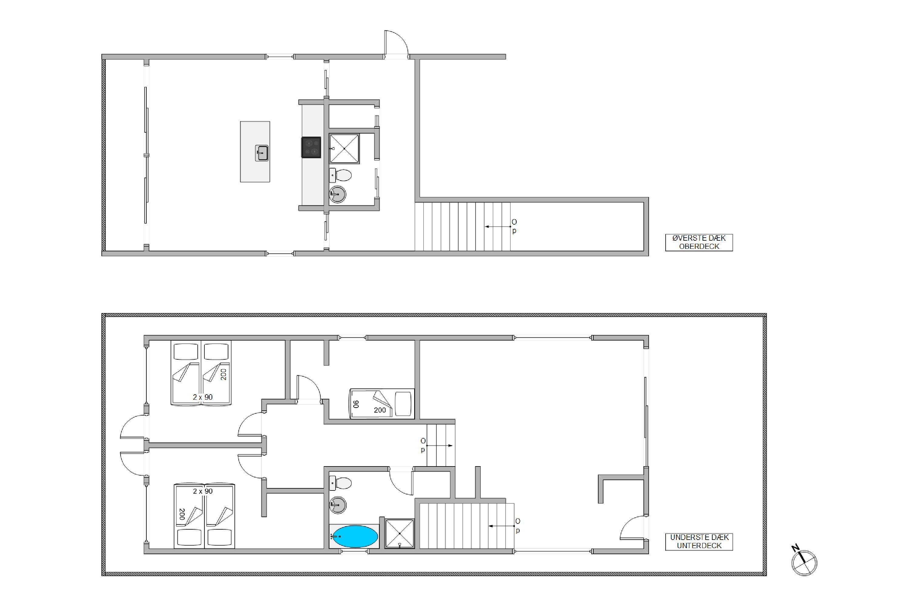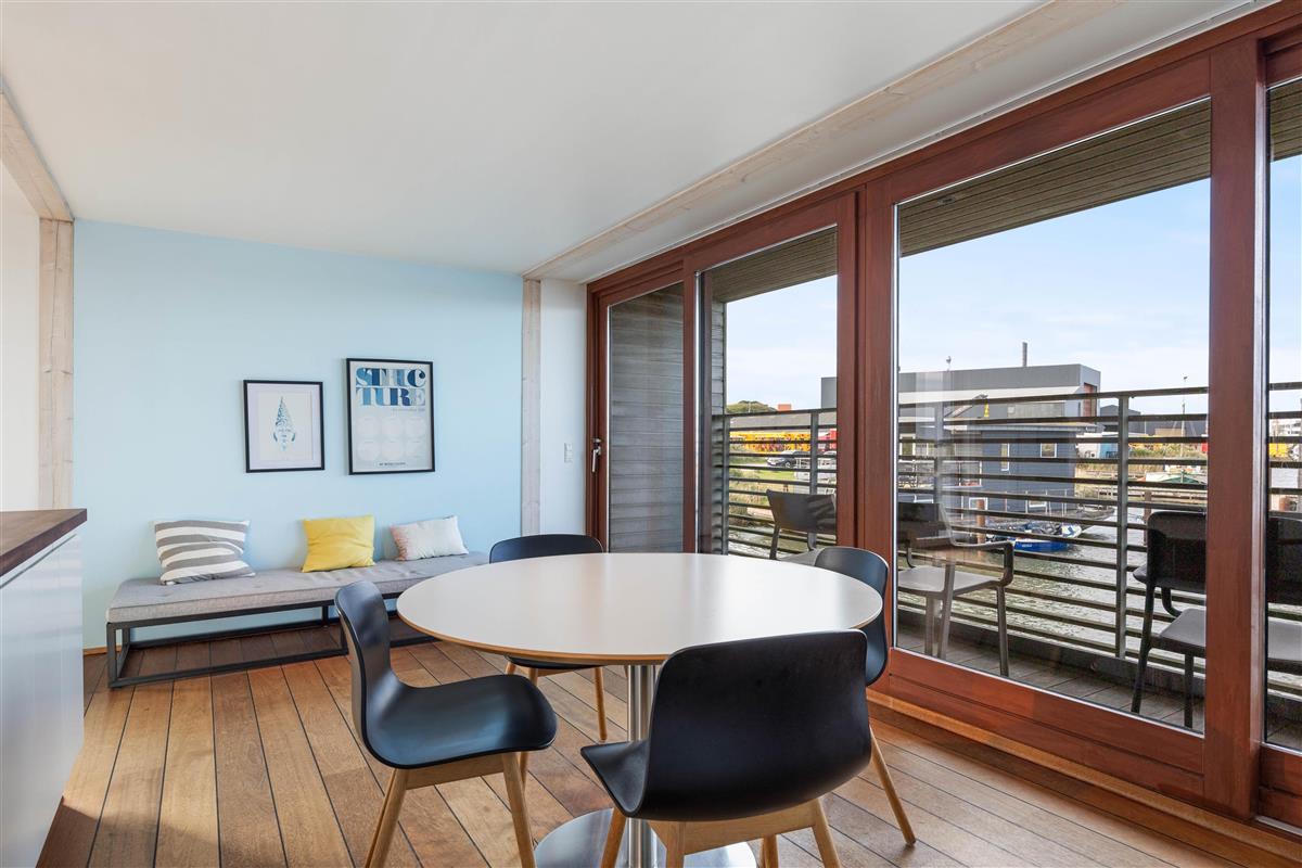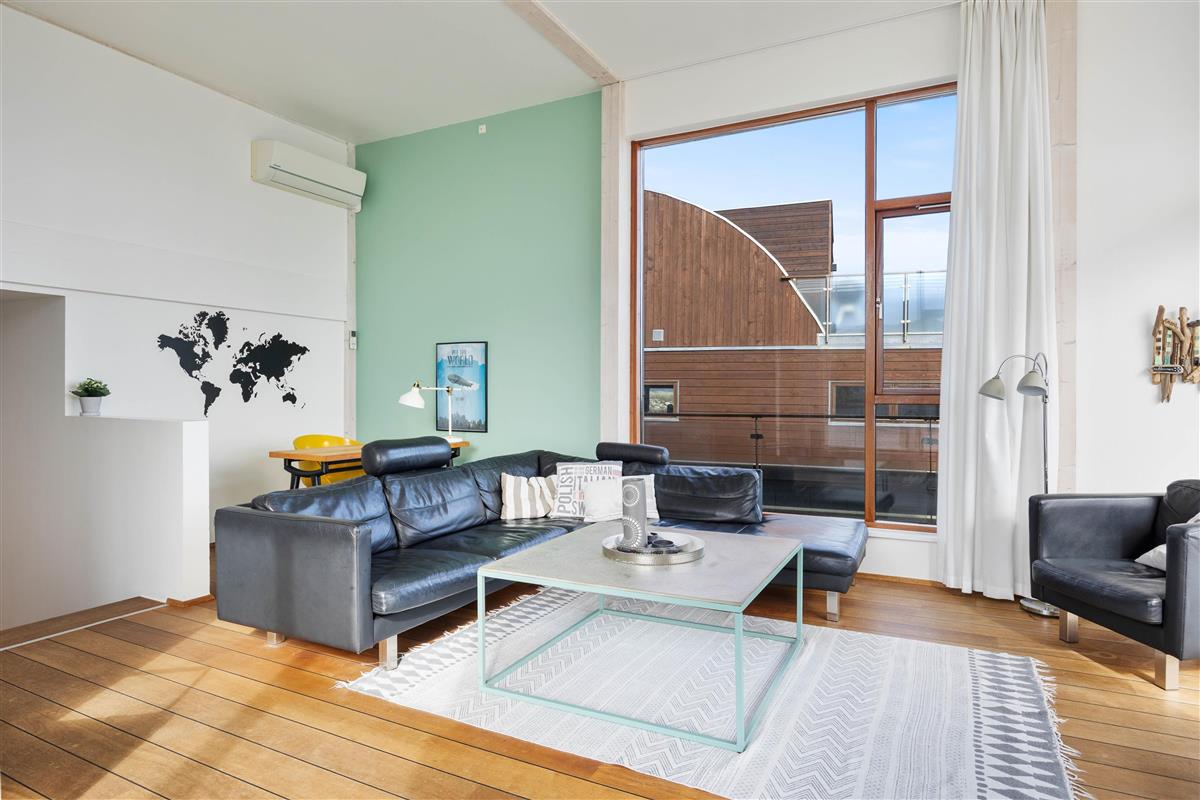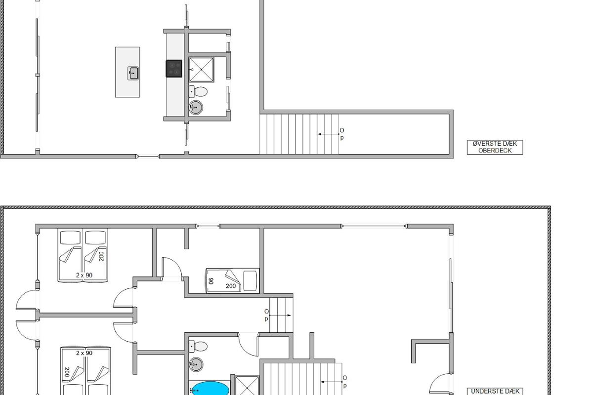 The houseboat features terraces on both levels. The lower level has a smaller terrace, while upstairs you'll find a considerably larger, partially sheltered terrace. From here, you can enjoy beautiful views across the fjord and Hvide Sande harbour.