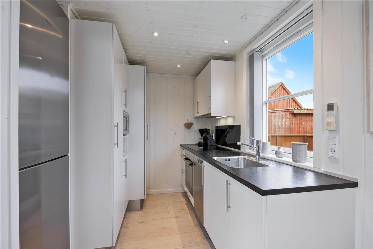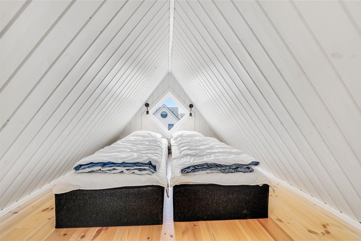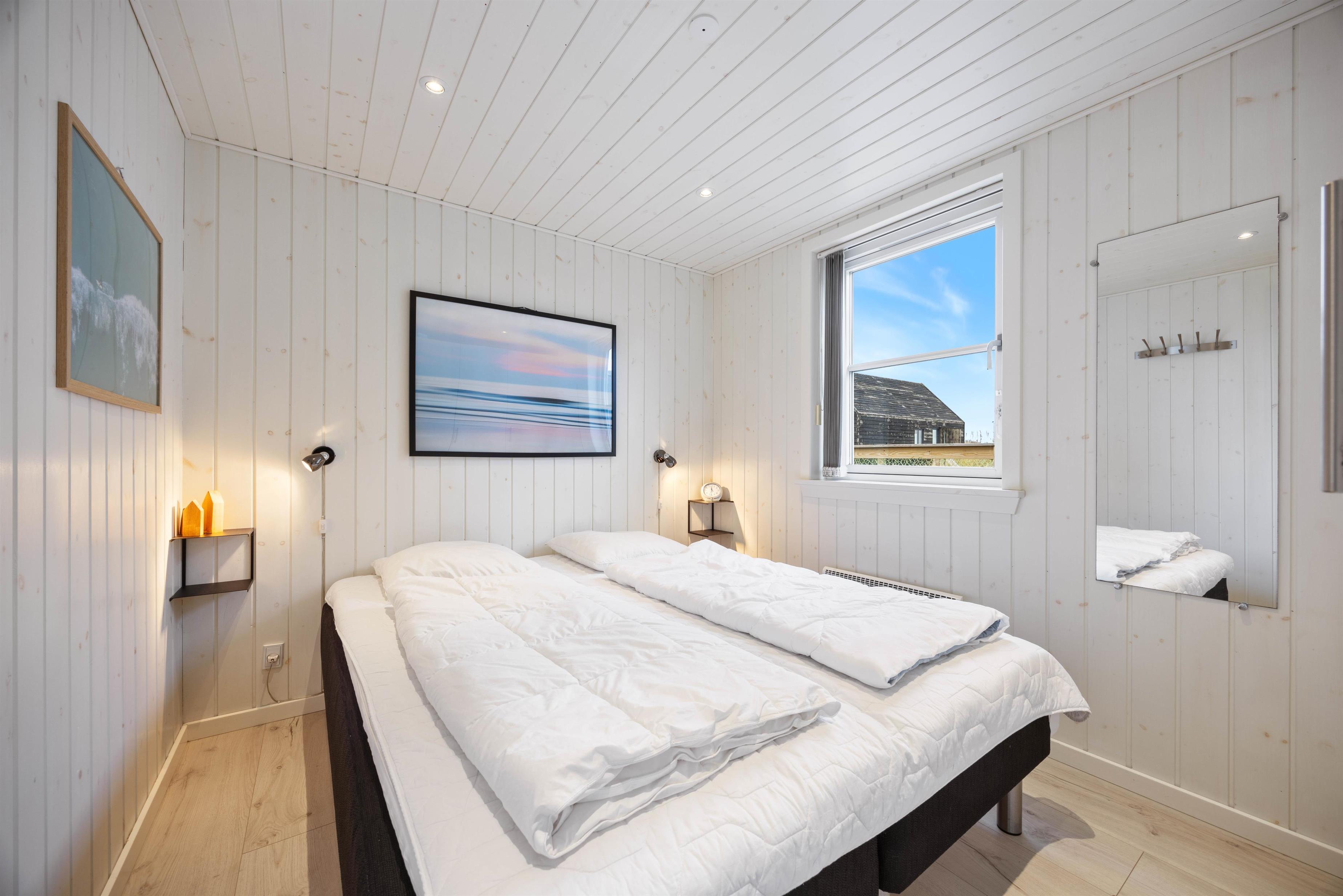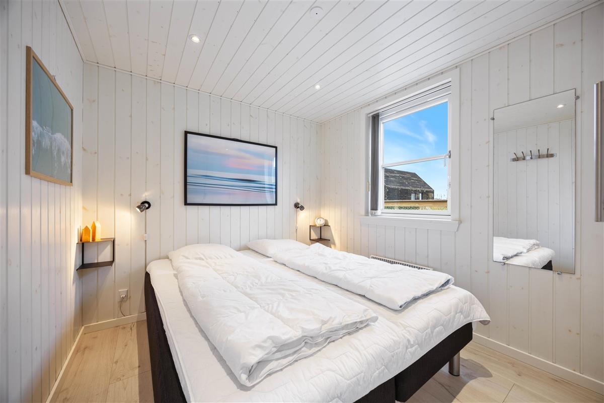 After a long walk along Ringkøbing Fjord, the modern bathroom with underfloor heating ensures warm, cosy feet. The comfortable bedroom features a double bed and ample storage space for your belongings, ensuring a peaceful night's rest. For cooler days, the energy-efficient heat pump provides warmth as needed.