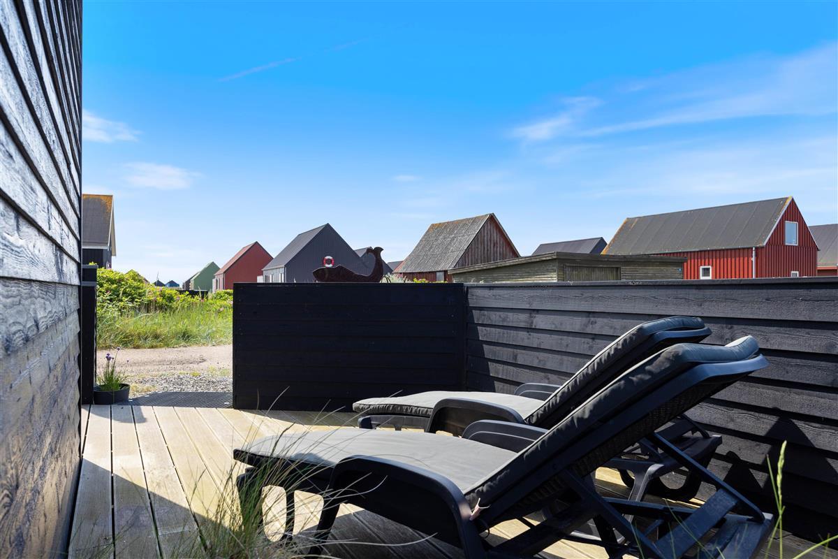 The west-facing wooden terrace is directly accessible from the living area. Here you'll find comfortable outdoor furniture perfect for a relaxing barbecue evening near the fjord. Sun loungers invite you to enjoy warm summer days. As a special extra, the holiday home includes two inflatable SUP boards - please bring your own life jackets.